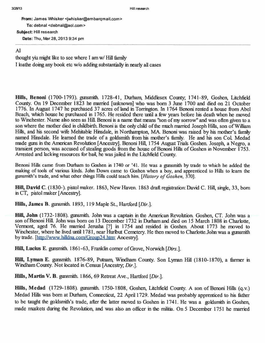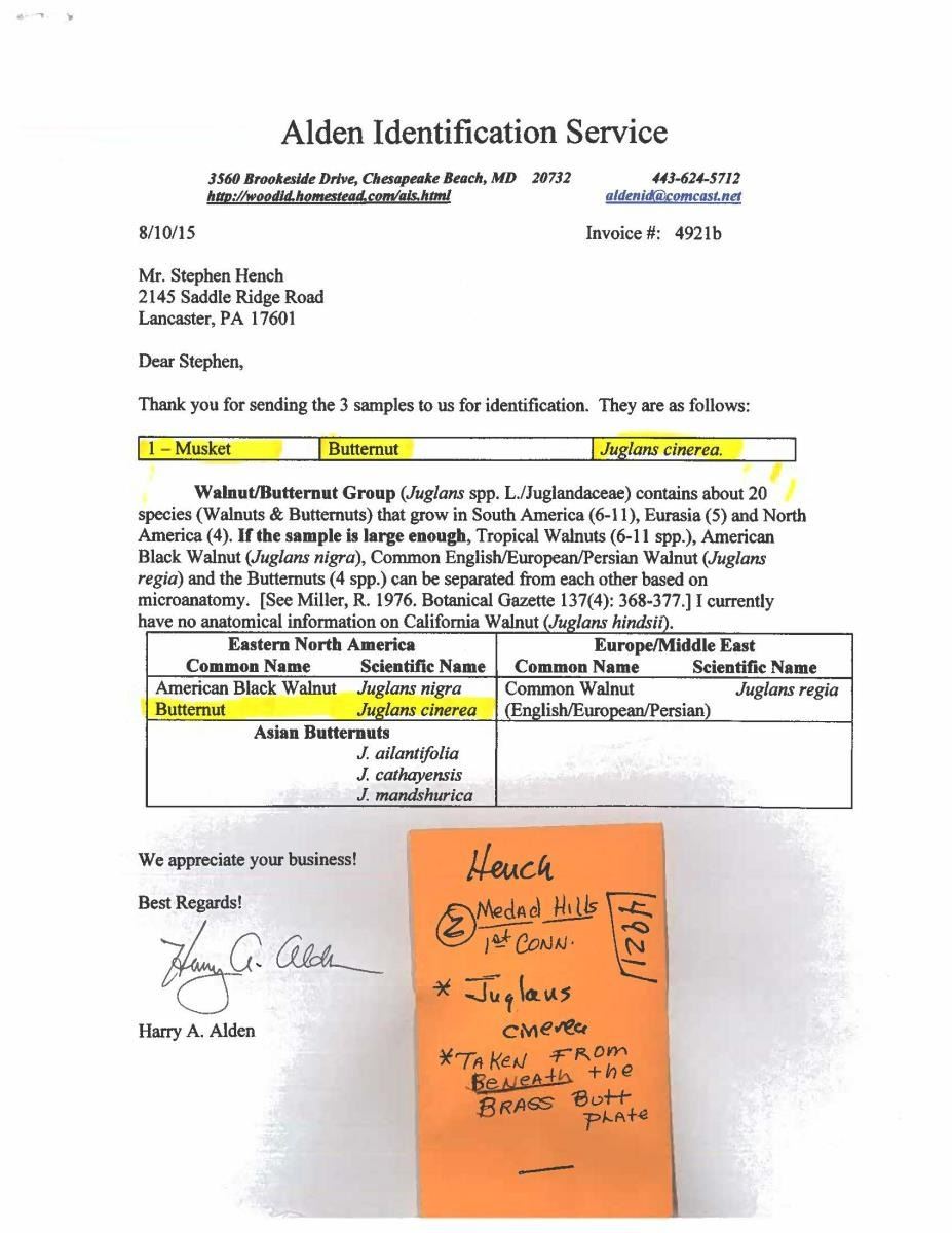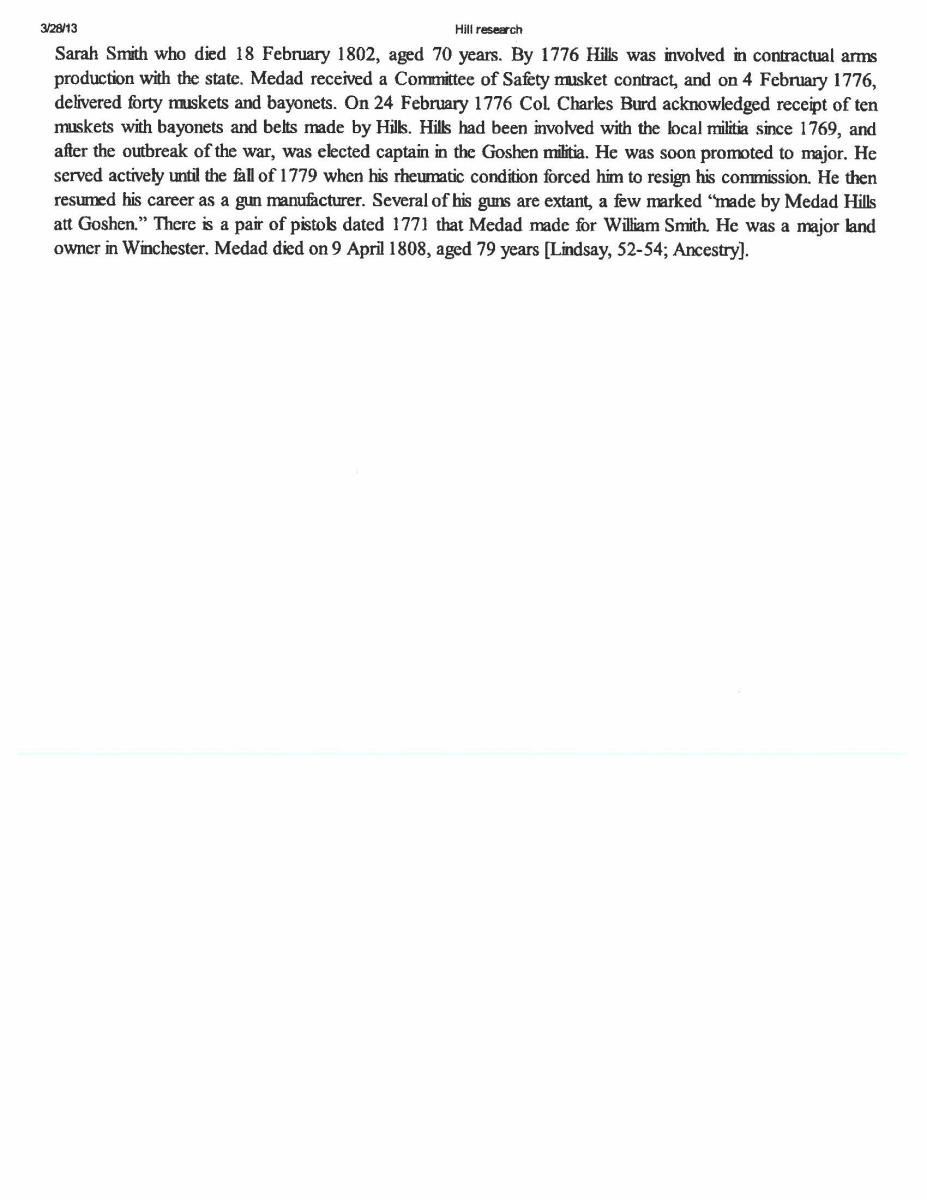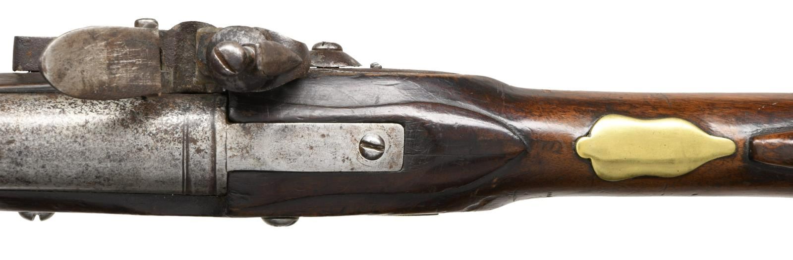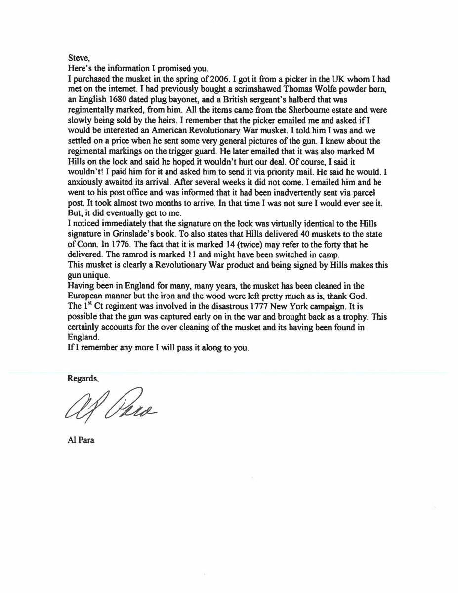 REVOLUTIONARY WAR OFFICER'S FUSIL, 1ST CONNECTICUT REGT. Cal. 76. S# 14. 54" overall, 38.25" round American made barrel, makers cartouche on bottom "LL", known Connecticut Revolutionary War era iron monger. This well preserved and beautifully marked short musket/fusil is signed "M. HILLS", Medad Hills of Goshen, CT was the most famous member of a large family of gun makers in colonial America. Medad delivered 40 muskets to the state of Connecticut in 1776. Trigger bow is engraved "1ST / CONN / 3RD", buttplate tang & sideplate both marked "14". Lock is also engraved "C / 1co". Rarely are American Revolutionary War era arms found in such exemplary condition. The reason for such fine condition is that this long arm was purchased from an Irish estate in 2006 where it had been maintained since it was thought taken home as a souvenir in the Revolutionary War. The 1st Connecticut regiment was involved in the disastrous 1777-1778 campaign to control New York City, where this souvenir was possibly taken. Regardless, this is among the finest regimental marked Revolutionary War American made longarms extant. Steve Hench treasured this gun in his exceptional collection of Revolutionary War long arms collected over 60 years that were sold in 2019. Speaking with Mr. Hench, who is noted expert on American Revolutionary War & Kentucky rifles, he stated he had no doubt that this was among the very few totally American made regimentally marked Revolutionary War longarms surviving today. He pointed out that the barrel was crudely made with numerous forging flaws and would probably not have survived long service. Luckily this exemplary arm was taken home by British soldier to be preserved like other fine important Revolutionary War American objects that have been returned to the US. He also pointed out the gun was stocked in American White Walnut (Butternut) which is rare feature. UNATTACHED ACCESSORIES: laboratory report identifying genus species of wood in stock. Letter from Al Para to Steve Hench, detailing the history of gun coming from Irish estate. File of research on Medad Hills and the other Hills family gun makers. History of 1st Connecticut in the Revolutionary War. CONDITION: very good to fine overall for an 18th century flintlock, appears original and complete overall, original flint configuration, the ramrod is replacement but of the era. Gun was cleaned & varnished in European style when fashionable in 19th century. Mechanically fine, clear smooth bore. (01-24155/JS). ANTIQUE. $35,000-45,000.