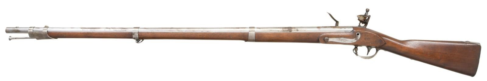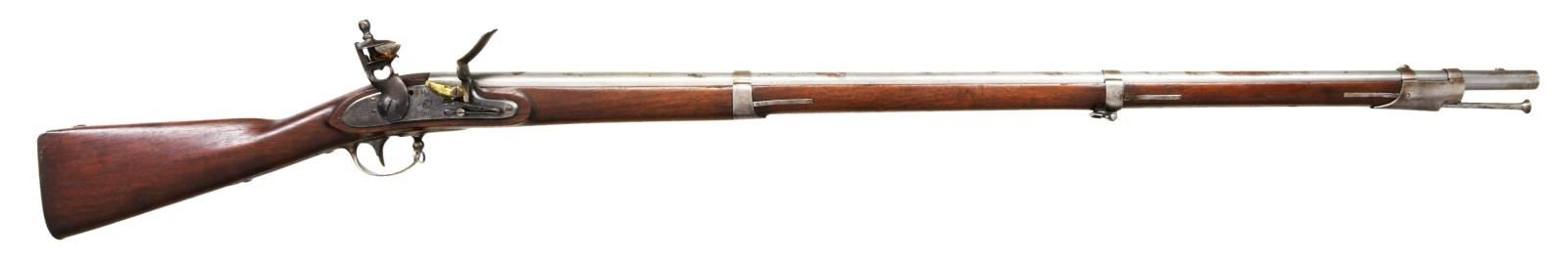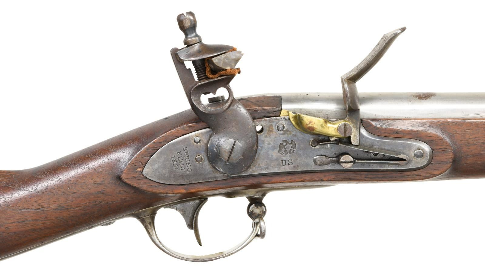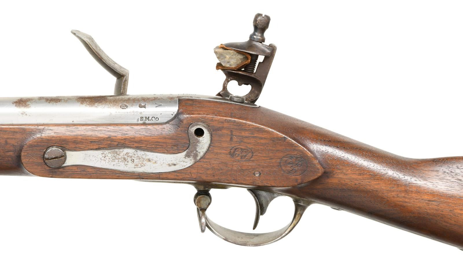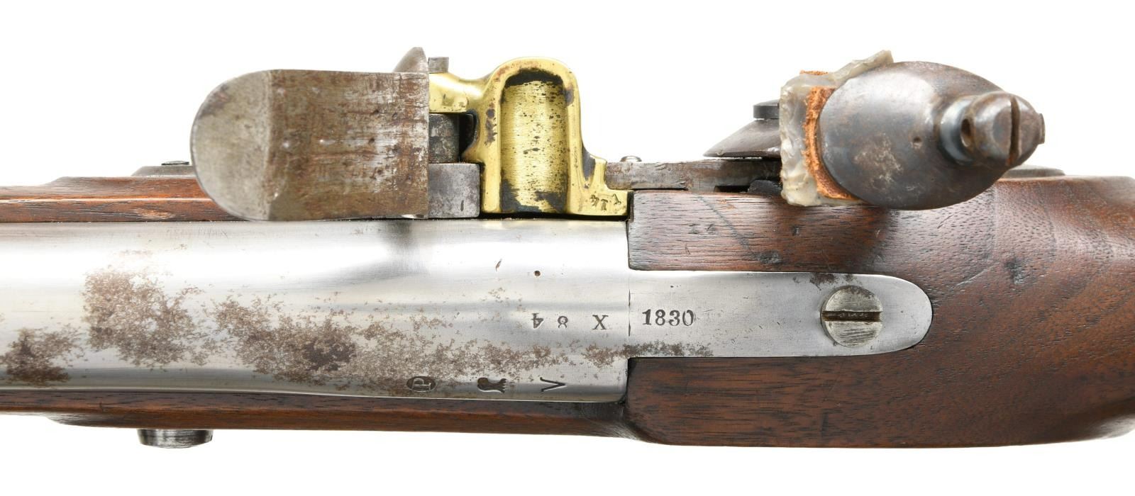 Cal. 69. NSN. Bbl. 42". Blade front sight. Lock has "US/Eagle" marking in center. Rear of lock has 1830 date & Springfield Armory marking. Upper tang also dated 1830. Rear of bbl. marked "X84" & has Springfield eagle marking w/ "VP" proof. Left rear of bbl. has "S.M.Co" marking. Matching numbers "114" appear on top of bayonet lug/sight & pan. Brass pan, hammer screw & frizzen screw are replacements. Touch hole appears to have been drilled but the gun itself appears to be original flint. Rear sideplate screw is missing. Walnut stock w/ three bands & bottom mounted sling swivels. Button tipped ramrod. Left side of stock has two strong inspector's cartouches. CONDITION: stock has small crack ahead of sideplate. Scattered dings & handling wear. Lock retains strong amounts of case colors w/ some light oxidation & dings. Brass pan was polished bright w/ scattered oxidation & dings. Balance of metal was cleaned long & is returning to a gray patina w/ scattered oxidation & dings. Bright smoothbore. (01-24125/MJC). ANTIQUE $4000-6000.