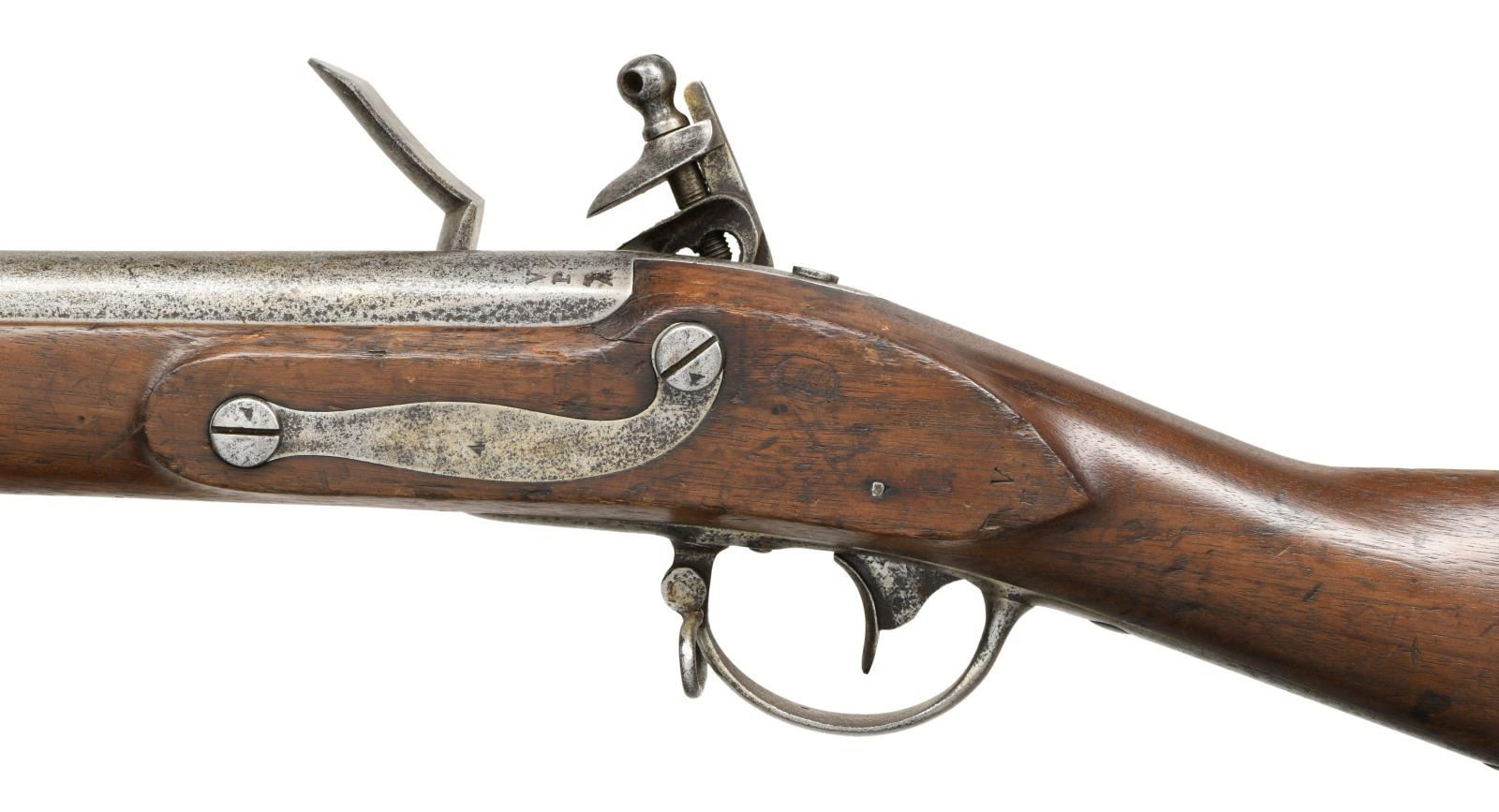 MUSKET. Cal. 69. NSN. Bbl. measures 36" and has a blade front sight on the lower band of the nosecap. Barrel is proofed with "V" over "P" over an eagle head on the left side. Lock shows a drooped winged American eagle looking left with "US" underneath in front of the cock and "HARPERS FERRY 1824" to the rear of the cock. Iron trigger guard, buttplate, sideplate, barrel bands, nosecap, ramrod and sling swivels. The detachable pan is brass. Stock has clear inspector's marks to the rear of the sideplate. Solid wood with what may be lightly scratched in initials on the left side. This is an exceptionally scarce Harpers Ferry musket. 1,039 Of these were produced at Springfield but the number produced at Harpers Ferry is unknown and suspected to be far less than the Springfield production numbers. Because of its size, the artillery musket has often been referred to as a cadet musket being 5 5/8" shorter than the M1816 musket it was modeled after. CONDITION: barrel has a medium gray finish with scattered areas of darker oxidation. Proofs are quite clear. The lockplate and the remaining iron parts also have a medium gray finish with very slight pitting noticeable. Lock holds both full and half cock. Wood shows light to moderate scuffs and scrapes with a few splinters around the ramrod channel. A good bore that would benefit from a professional cleaning. (01-20955/BF). ANTIQUE. $2,000-3,000.