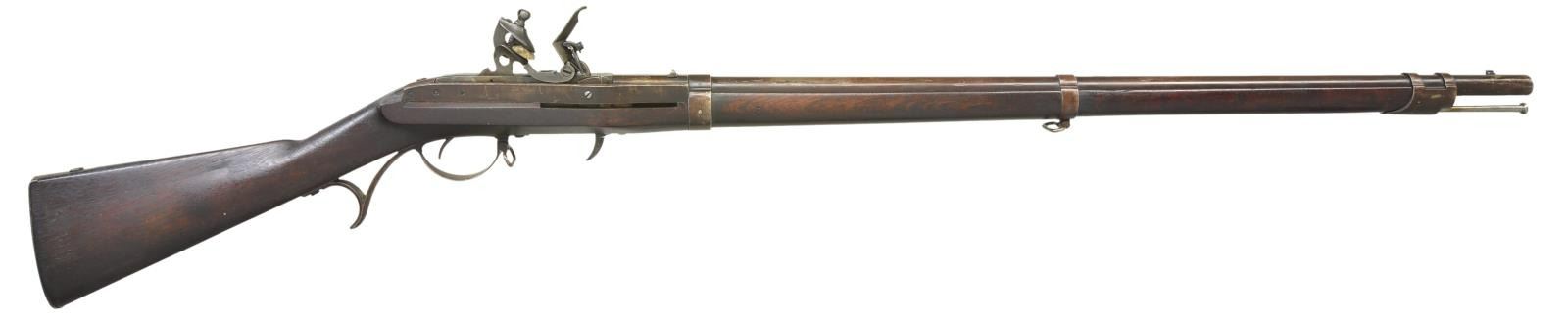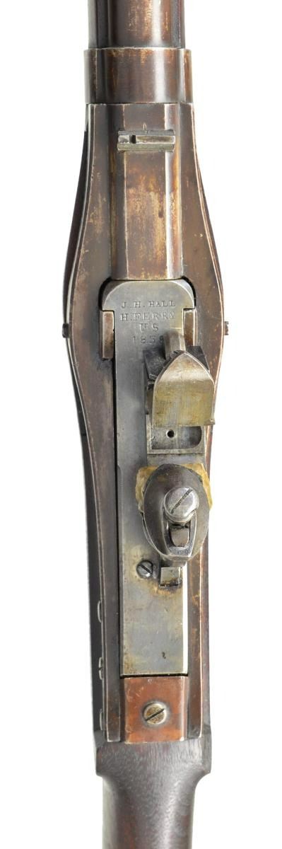 TYPE II. Cal. 52. NSN. Standard configuration with brown 32 3/4" barrel furniture and action. The Hall was made with total interchangeability of parts. Sights are offset to the left to allow them to be used while looking around lock parts set close to center line of tilting breech block which is case hardened. Front portion of block stamped "J.H. HALL" "H. FERRY" "U.S." "1838". Dark oil finished American walnut stock affixed to barrel with pins and unmarked except for "V" stamped behind trigger guard tang. CONDITION: very fine. Barrel furniture, band, etc. retaining over 75% brown lacquer finish thinning overall and with a few marks and scratches. Breech block and lock parts retain over 80% case hardening color. Rifle appears to have been fired very little. Stock is quite good with only a few marks and dings in the original oil finish. Original ramrod with button tip retains nearly all of its bright polish. Bore is bright and shiny with a few scattered pits. Mechanically fine. PROVENANCE: From the Lifelong Collection of Glen E. Mattox. (01-22470/MGM). ANTIQUE. $3,000-4,000.