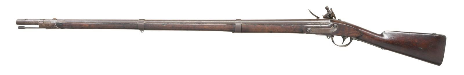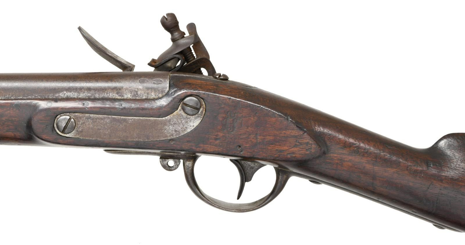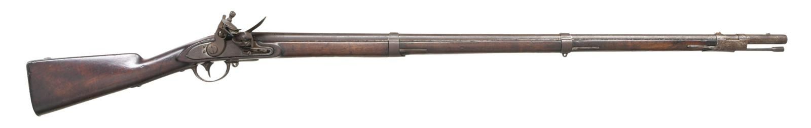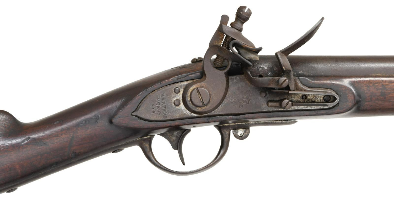 Cal. 69. NSN. Bbl. 42". This musket is one of over 350,000 manufactured at the Federal Arsenal at Harpers Ferry. They were produced from 1816 to 1844 and saw service from just after the war of 1812 to the Civil War. Round barrel with a rectangular sight/bayonet lug 1 1/2" from the muzzle. The breech is proofed with an eagle over "P" in an oval and "US" in an oval. The lock is marked with a large eagle over a small "US" in front of the cock, and the back of the cock reads "HARPERS FERRY 1818". Iron trigger guard, buttplate, side plate, barrel bands, and ramrod. No sling swivels. Walnut stock with proofs visible behind the side plate. CONDITION: barrel, lock, and all other iron parts have a dark, somewhat mottled patina. The lock holds both full & half cock. The stock has a few dents & dings but no major issues. Fair to good bore. (01-24218/BF). ANTIQUE. $1,500-2,000.