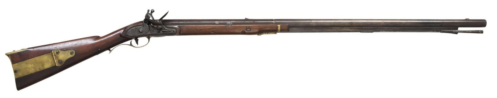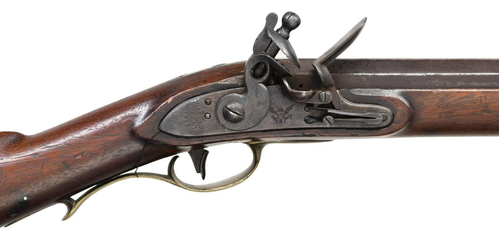 RIFLE. NSN Cal. 54. Reconverted back to flint from percussion and bore reamed smooth to .58 caliber. This rifle presents well with standard configuration 36" half octagonal to round barrel. Left top breech is stamped with a raised "US" and an eagle head over "P" in sunken oval cartouches. Brass furniture including toolbox, 2 steel ramrod pipes unattached rib under barrel. Lock plate is marked with crisp American spread wing eagle facing the cock with a "US" on eagle's shield, tail stamped vertically "HARPERS / FERRY / 1819". CONDITION: Very good as reconverted, mechanically functional with smooth clear bore. (01-22939/JS). ANTIQUE. $700-900.