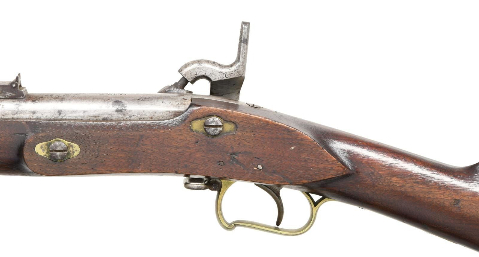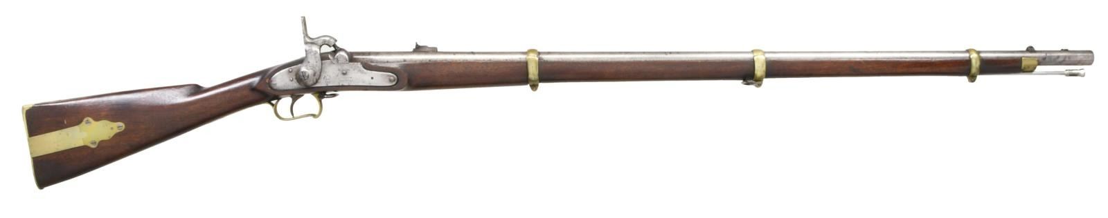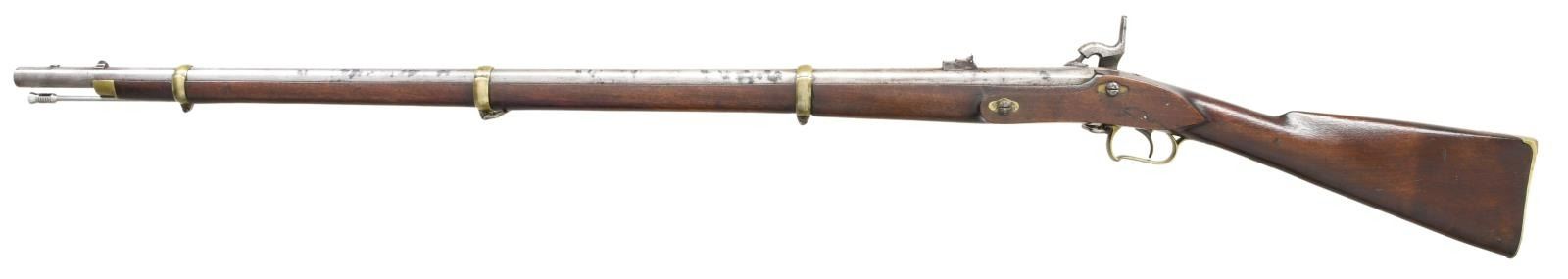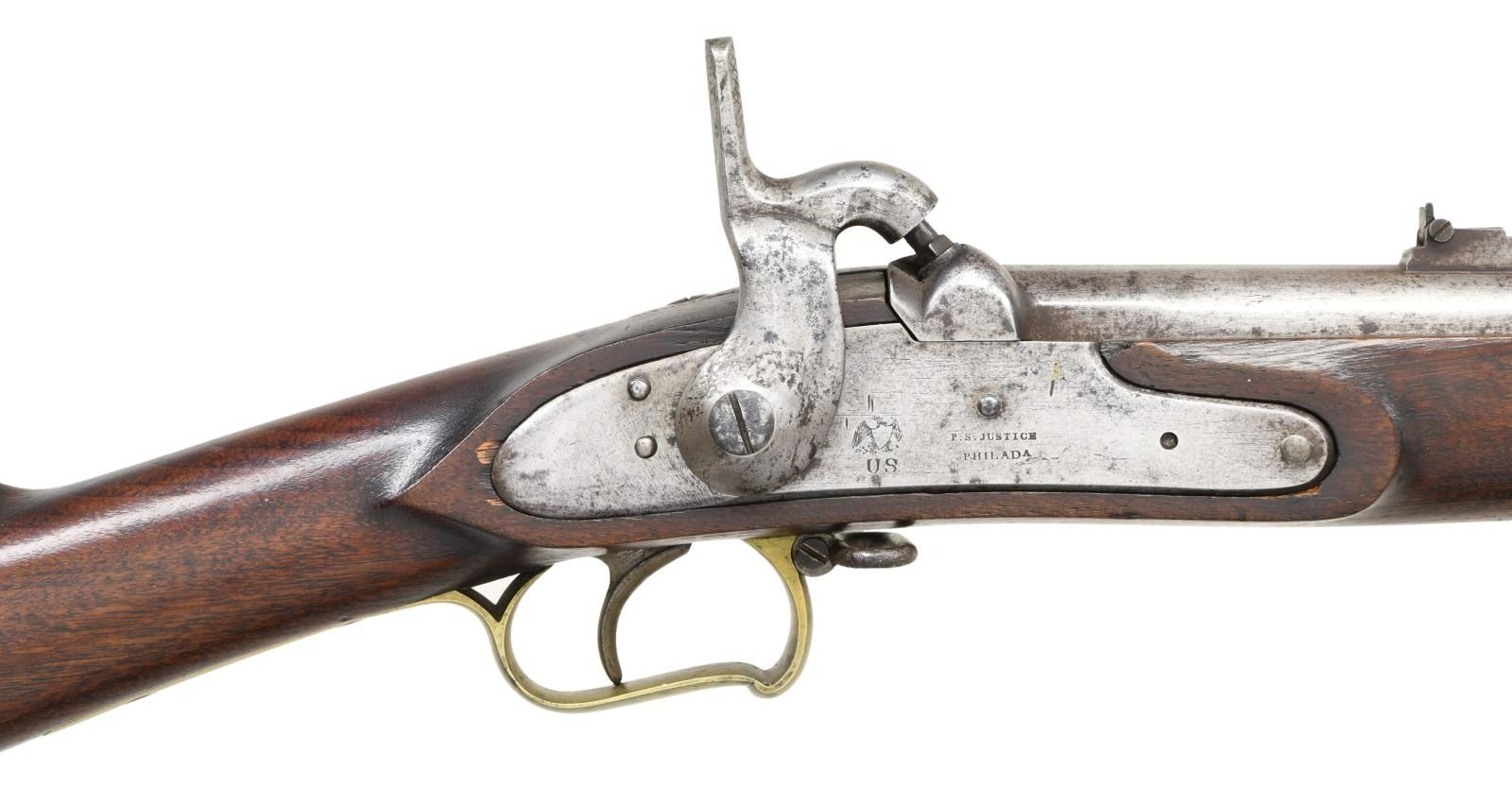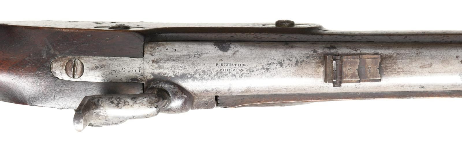 Cal. 69. NSN. Bbl. 39 1/4". This rifle was made by P.S. Justice of Philadelphia, Pennsylvania about 1861. Justice made approx. 2,174 of these muskets. Round barrel with flattened sides has a rectangular bayonet lug on the top 1 1/2" back from the muzzle, and a raised, bladed sight 2" back from the bayonet lug. The rear sight is a fixed folding sight. The top of the barrel is marked "P.S. JUSTICE PHILADA". The barrel tang is marked "1855". The lock shows an American eagle over "US" in front of the cock, and "P.S. JUSTICE PHILADA" at the base of the lock under the nipple. Brass trigger guard, patchbox, buttplate, lock screw washers, 3 barrel bands, and nosecap. Iron sling swivels & ramrod. Walnut stock. CONDITION: barrel has a medium gray patina, as does the lock. The lock holds both full & half cock. All brass has a pleasing, mellow, mustard patina. Patchbox functions perfectly. Stock has a few handling dents & dings. Very good bore that could use a cleaning. (01-24222/BF). ANTIQUE. $2,400-3,000.