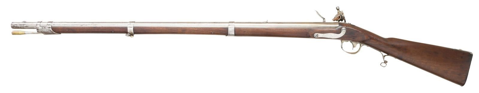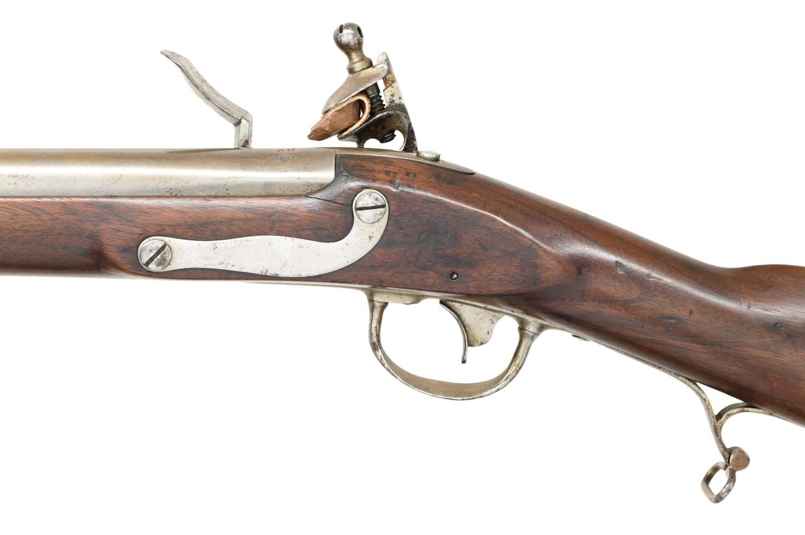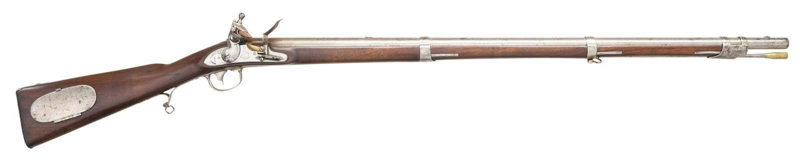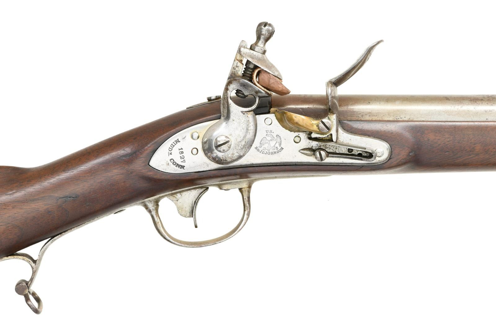 Cal. 54. NSN. Bbl. 36". There is an iron rectangular blade sight at the muzzle, and a fixed sight 8" up from the breech. The breech is proofed "US AH P(in serrated circle)". The iron lock with brass pan is marked in front of the cock "US. (eagle) R & J D. JOHNSON". The rear of the cock is marked "1827 MIDDN CONN.". Iron trigger guard, "US" marked butt plate, patch box, side plate, barrel bands, nose cap, and sling swivels. Original brass tipped iron ramrod. The stock shows a worn but visible cartouche on the left side. CONDITION: gun is mostly bright with scattered staining on the bright finish. The lock holds both full & half cock. Stock shows minor scattered dents & dings. Fine bore. A visually impressive rifle with a quality reconversion job. (01-24056/BF). ANTIQUE. $1,500-2,200.