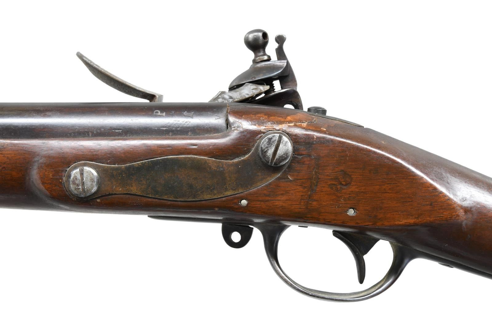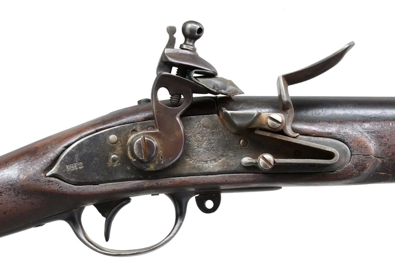 Cal. 69. NSN. Bbl. 44 1/2". Rounded blade brass front sight. Type III Springfield 1795 flintlock musket. Center of lock has eagle that is obscured by pitting & "SPRINGFIELD" marking. Rear of lock dated 1812. Tang appears unmarked. Buttplate dated 1812. Rear of bbl. marked w/ a "P", eagle & "V". Walnut stock w/ three bands. Tulip shaped ramrod w/ hole in center. No sling swivels present. CONDITION: sanded stock shows older thickly added varnish, a few large cracks near action w/ scattered modern filler repairs, scattered dings & handling marks. Metal is a dark patina w/ pitting on lockplate, scattered varnish overruns & some scattered oxidation. Middle band has a lengthwise crack on right side. Oxidized bore. (01-23725/MJC). ANTIQUE. $1200-1800.