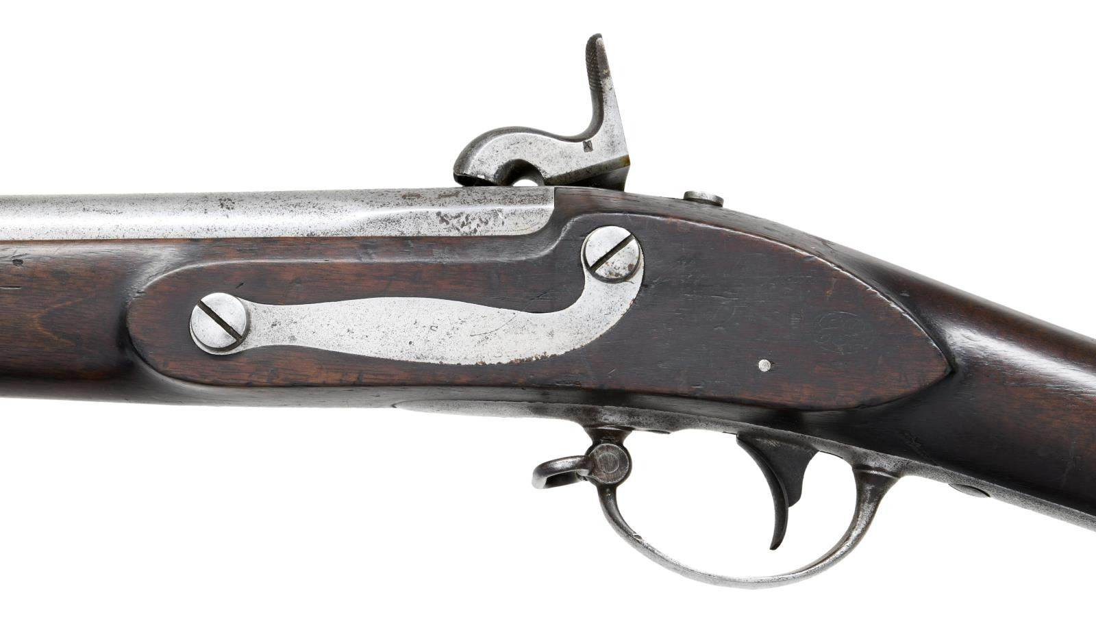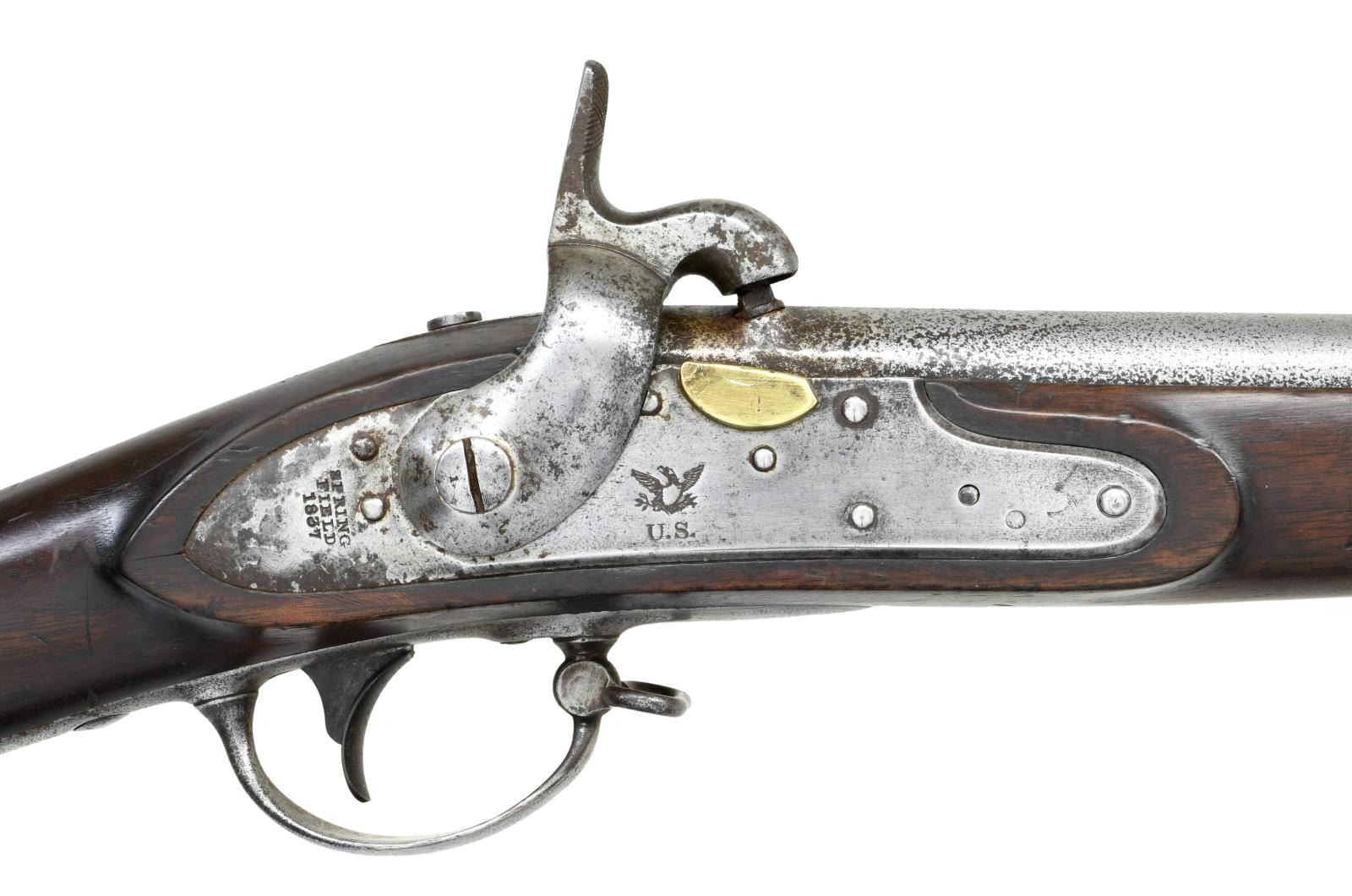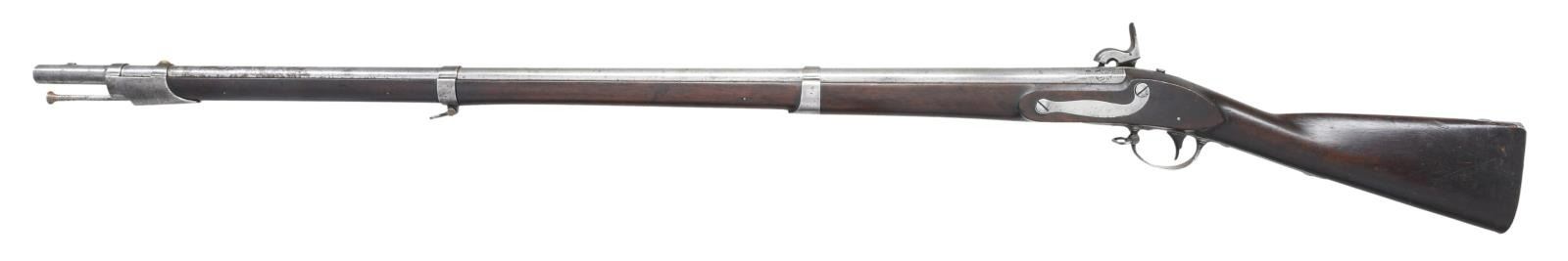 Cal. 69. NSN. Bbl. 42". Brass blade front sight. Springfield Armory 1816 musket that was arsenal updated to percussion. Center of lock has eagle & "U.S." markings. Rear of lock marked "SPRINGFIELD 1837". Upper tang dated 1837. Rear of bbl. marked w/ circled P proof, eagle & "V". Walnut stock w/ three bands & bottom mounted sling swivels. Trumpet shaped ramrod present. Left stock flat has two faint inspector's cartouches. UNATTACHED ACCESSORIES: US marked 1816 socket bayonet w/ 18" blade. Bayonet surfaces cleaned to bright w/ scattered oxidation, pitting & dings. CONDITION: stock has a small crack behind lock, some chipping in ramrod channel, scattered dings & handling marks. Metal appears to have been cleaned long ago w/ scattered oxidation & pitting. Oxidized bore. PROVENANCE: From the Lifelong Collection of Glen E. Mattox. (01-22480/MJC). ANTIQUE. $800-1200.