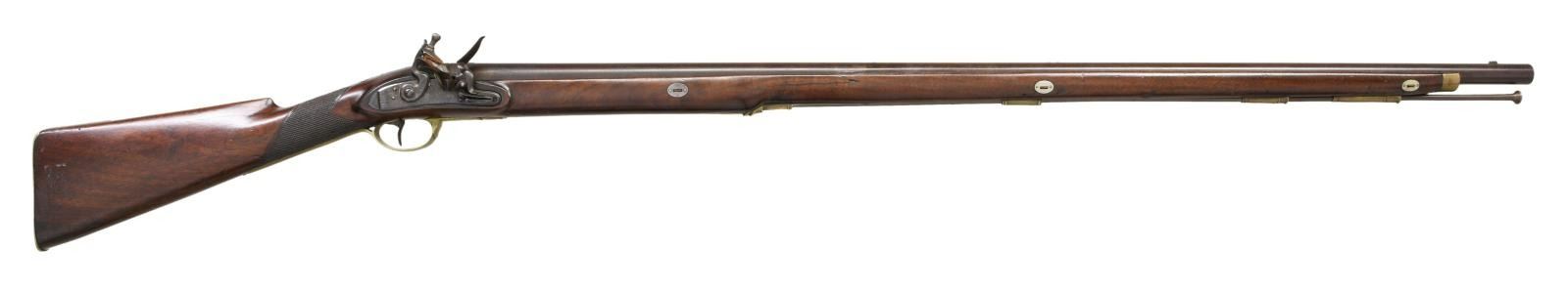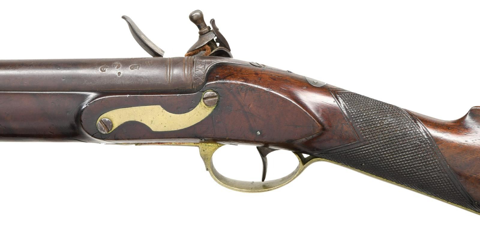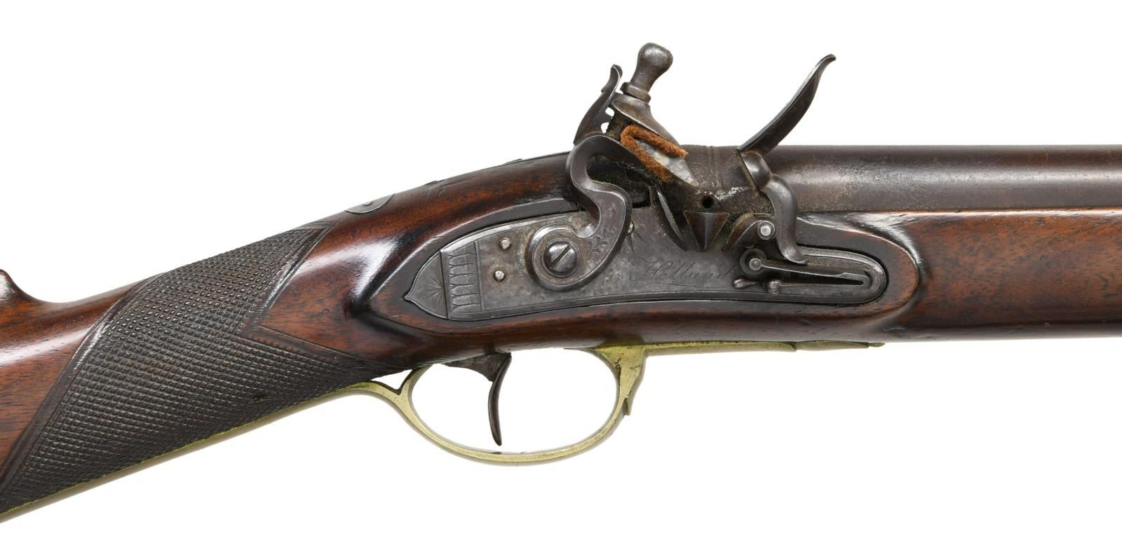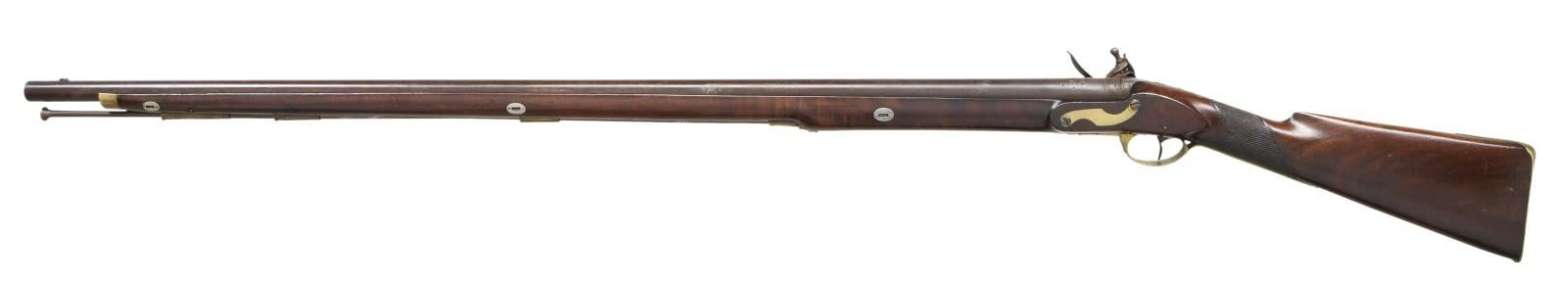 Cal. 69. NSN. Bbl. 39" rnd. Square notch front sight. Bbl. appears to be from a US musket, it is marked w/ an 1825 date, eagle, "H", circled V & P proofs. Lock is marked "HOLLAND". Walnut stock w/ checkering at wrist & brass furniture. Button shaped ramrod present. Top of wrist has oval silver plaque. CONDITION: stock has added finish w/ a few repaired cracks, a few smaller cracks, scattered dings, handling wear & flaking. Brass parts are a dull yellow patina w/ scattered oxidation & dings. Metal is a dull gray patina w/ some pitting at rear of bbl. & scattered oxidation. Oxidized bore. PROVENANCE: From the Lifelong Collection of Glen E. Mattox. (01-22472/MJC). ANTIQUE. $800-1200.