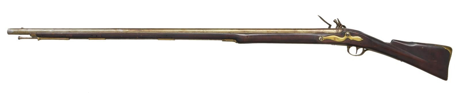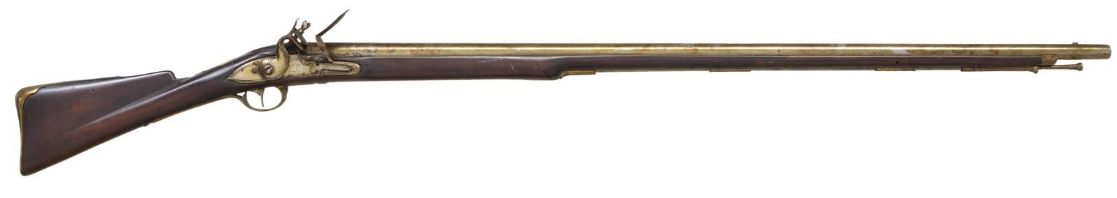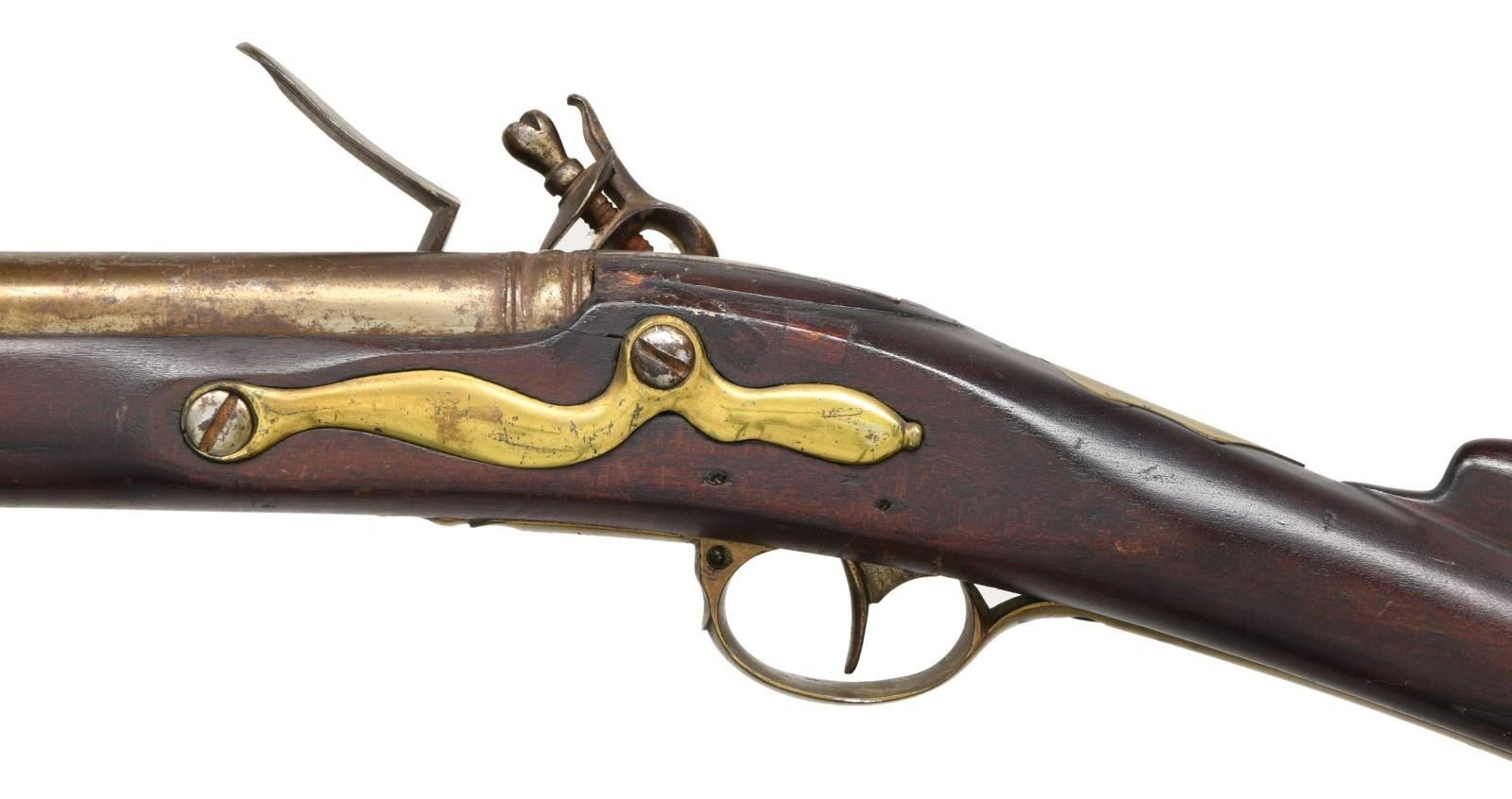 Cal. 72. NSN. Bbl. 42". A nice example of an American made musket likely produced during the Revolution or shortly after. Round barrel with a rectangular sight/lug 2" from the muzzle. There is ringed decoration at the bolster. The lock has crude stamped decoration around most of the border of the lock and the edges of the cock. The letters "EP", created with a punch, appear just in front of the cock. Brass trigger guard & butt plate reminiscent of a Brown Bess. There is a brass wrist escutcheon & rounded side plate. There are also brass ramrod thimbles not showing the influence of Pratt's improvement, along with a brass entry thimble. Fine quality cherry wood stock with likely the original ramrod. CONDITION: barrel seems to have a reasonably bright finish, but it, as well as other metal parts, have been coated with lacquer some time in its history. The lock appears bright under the lacquer and holds both full & half cock but could use adjusting. Brass has a mellow mustard patina. Stock has a very small piece missing at the tip of the butt. And there are inlaid repairs around the barrel pits. Fair bore. (01-24048/BF). ANTIQUE. $2,000-3,000.
