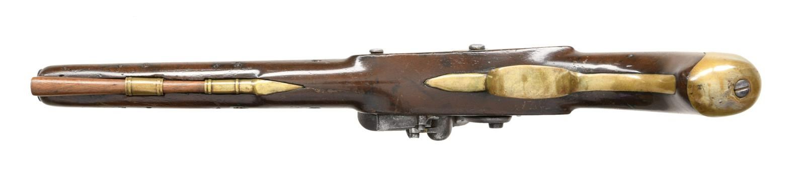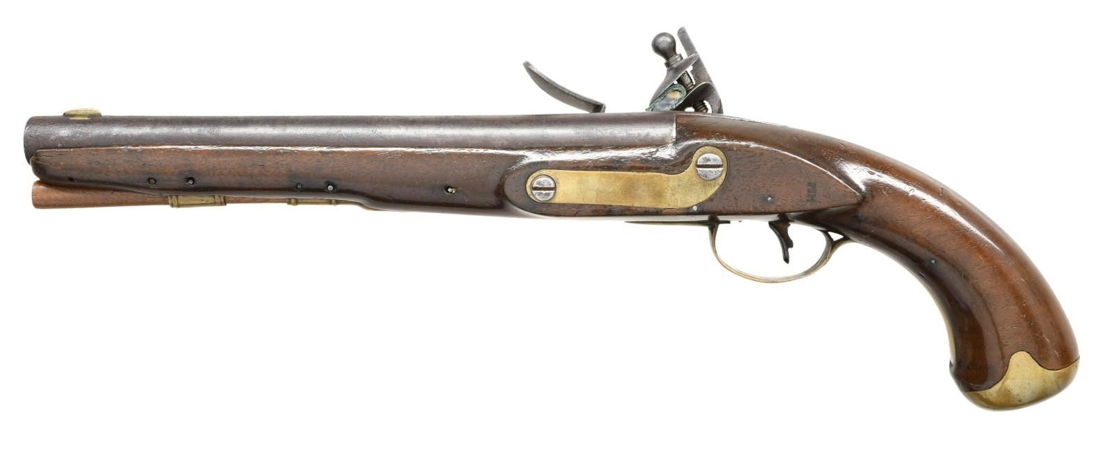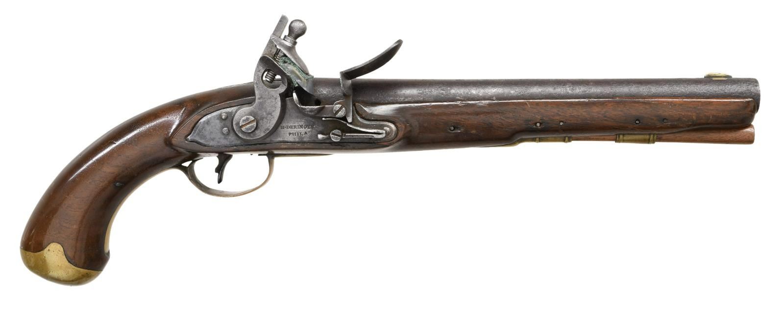 FLINTLOCK PISTOL, EX-MEAD PATTERSON COLLECTION. Cal. 56. NSN. This scarce flintlock pistol was the first pistol made by Henry Deringer who was very involved in longarm production at this point, his early pistols are scarce. Reilly notes no more than 25 survivors, in "United States Martial Flintlocks". Standard configuration: 16 1/8" overall, 9 7/8" round barrel. Beveled flat lock terminating in teat at tail marked "H. DERINGER / PHILA" forward of flat reinforced cock, earliest style with squared toe frizzen and 2 brass ramrod pipes. "HM" inspection in stock flat (Henry Murry-Maryland Chief Armorer). UNATTACHED ACCESSORIES: original collection card of Mead Patterson who bought this from Miller Bedford in 1948 for $270. CONDITION: very good overall, original flint, all matching and original, heavy varnish added to stock, smooth iron & brass patina. Mechanics fine, smooth clear bore. (01-23807/JS). ANTIQUE. $6,000-8,000.