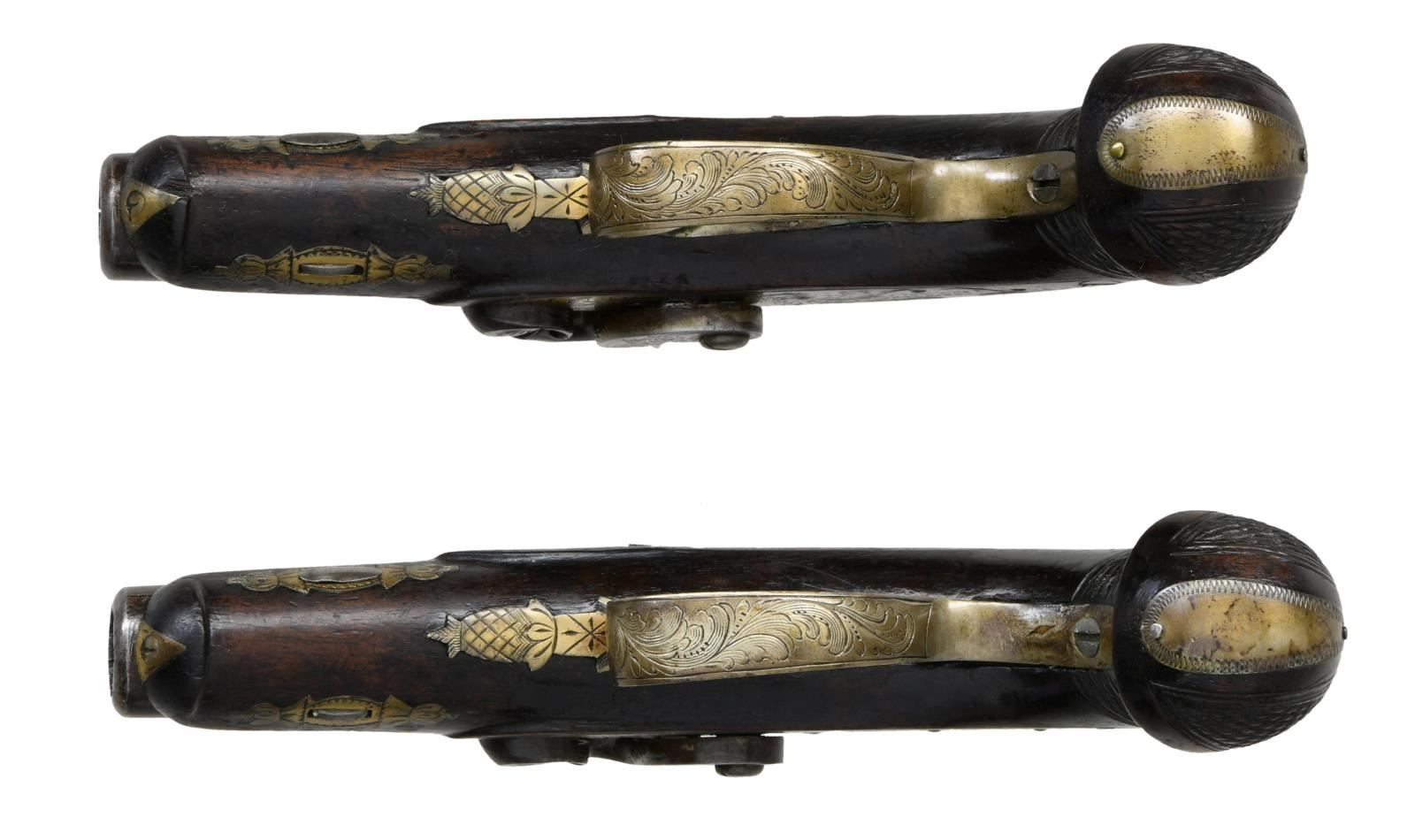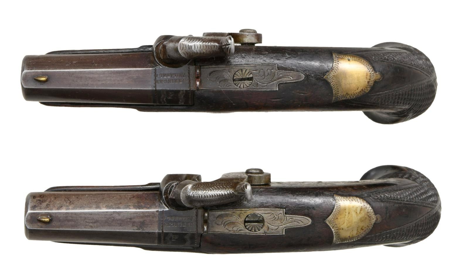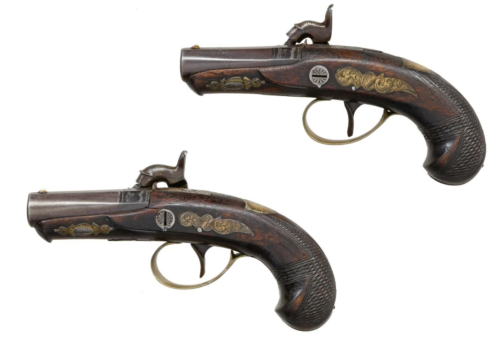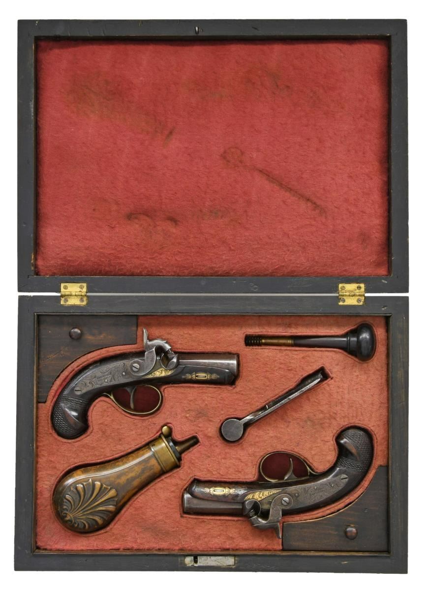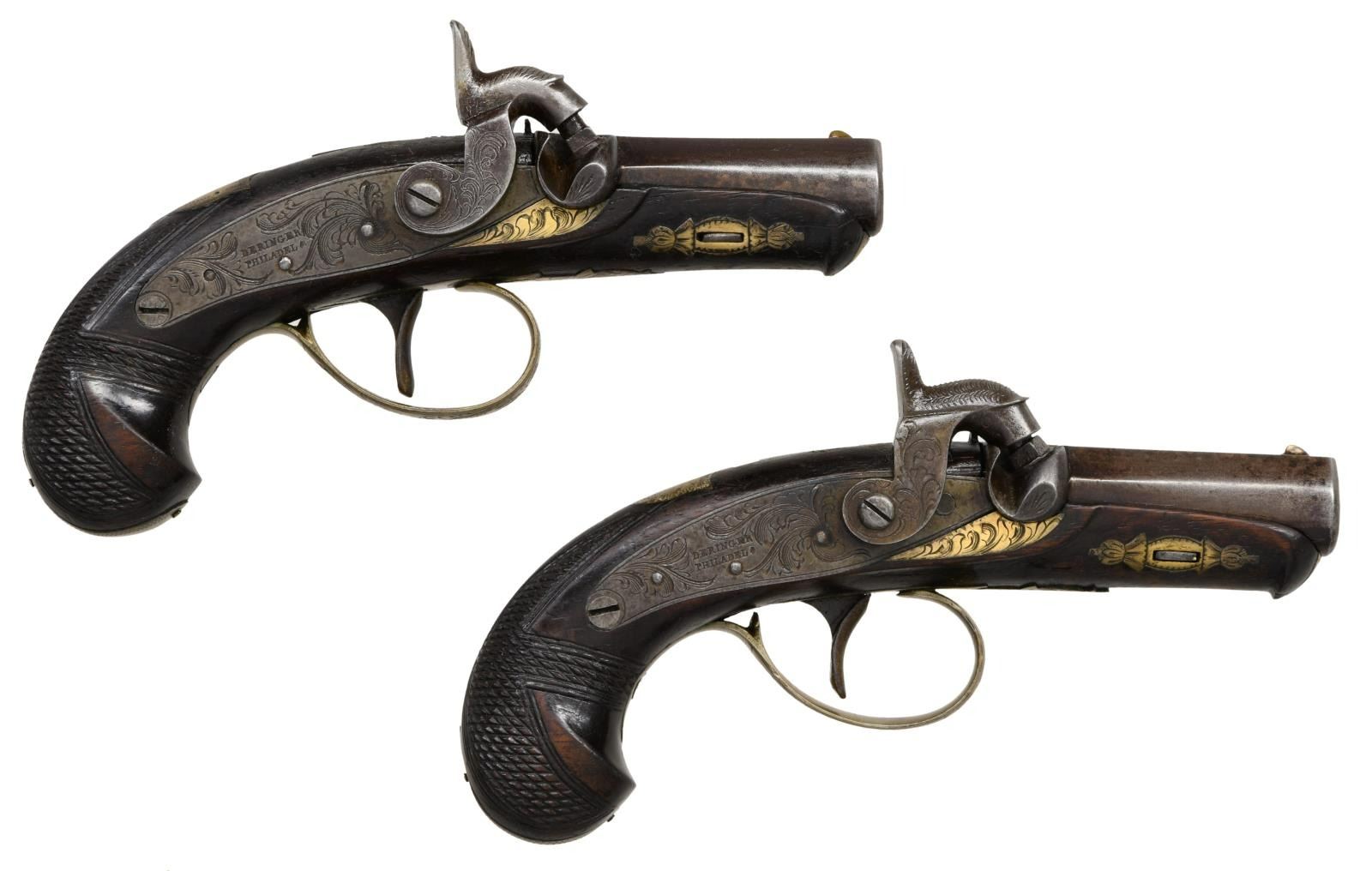 Cal. 40. NSN. Each pistol 5.5" overall, 1.75" seven land & groove rifled barrels, breeches "P" proved. Locks & breeches both marked "DERINGER / PHILADA". Pistols are German silver mounted, nicely engraved with checkered walnut stocks. Pistols are housed in French fitted mahogany veneered casing with red baize lining. Flask, brass & wood loading tool, combination ball mold/screwdriver/nipple wrench, and few loose balls complete the ensemble. A functioning key is also found in lidded compartment. CONDITION: pistols are very good overall retaining traces of original browning, sharp edges, crisp engraving, checkering is sharp and stocks retain about half of their original varnish. Mechanically fine, crisp rifled bores. Accompanying casing is very good, lining is soiled and faded. Case lid has worn gold painted edges emulating brass binding. PROVENANCE: Collection of Horst Kreiner, purchased 1998. (01-24020/JS). ANTIQUE. $4,000-5,000.