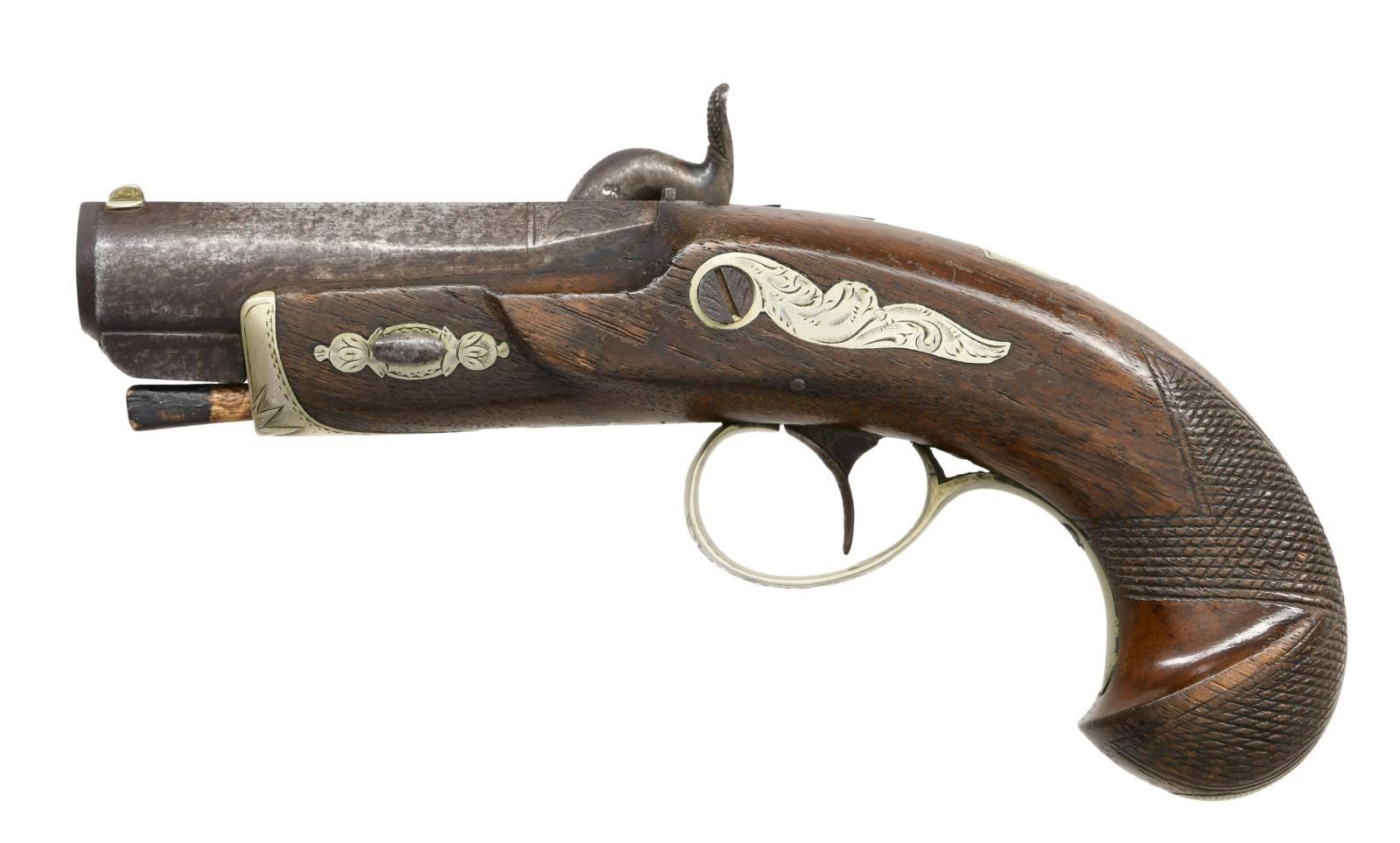 PERCUSSION PISTOL. Cal. 45. NSN. Henry Deringer made one of the most famous trademark styles of pistol starting in the mid 19th century. Many makers copied his famous single shot pistol. This example is very well made, 6.5" overall, 2.4" barrel, engraved German silver mounts, engraved lock and breech, checkered wrist, tapered beveled barrel and muzzle which is identical in form. Like most copies, this pistol has six groove rifling unlike the original Derringer which had seven. CONDITION: very good overall, appears complete and original, steel has dark grey iron patina with tiny trace of brown striping on ramrod rib. Stock retains much of its original factory varnish. Mechanically fine, good rifle bore. (01-23474/JS). ANTIQUE. $800-1,200.