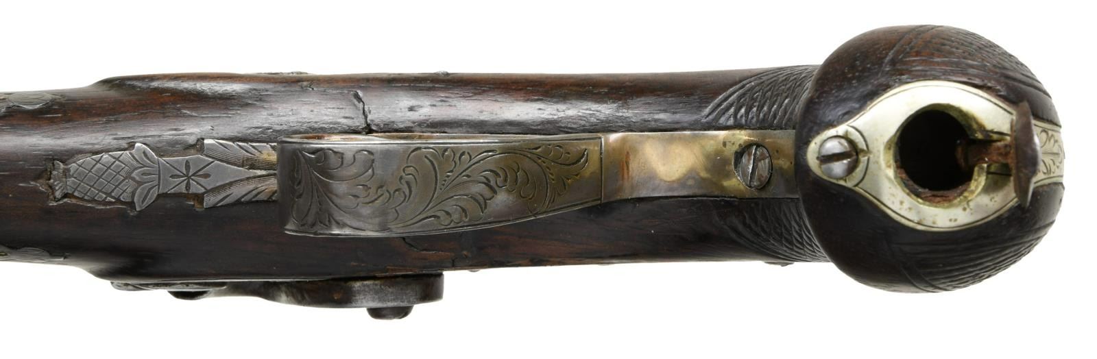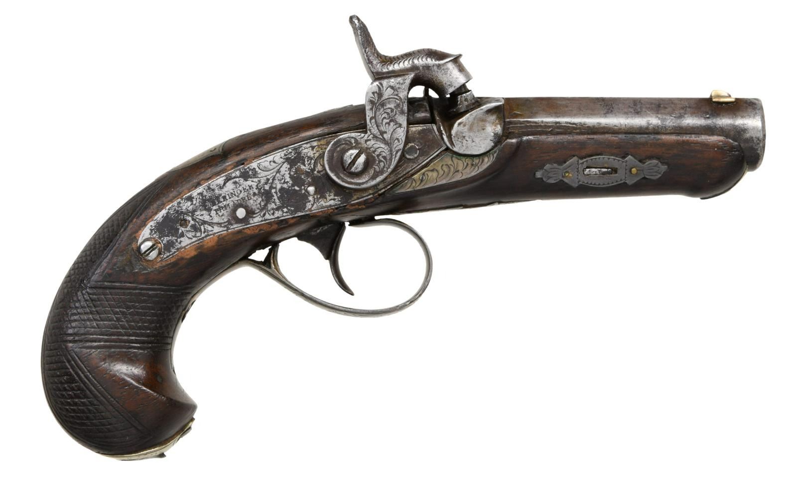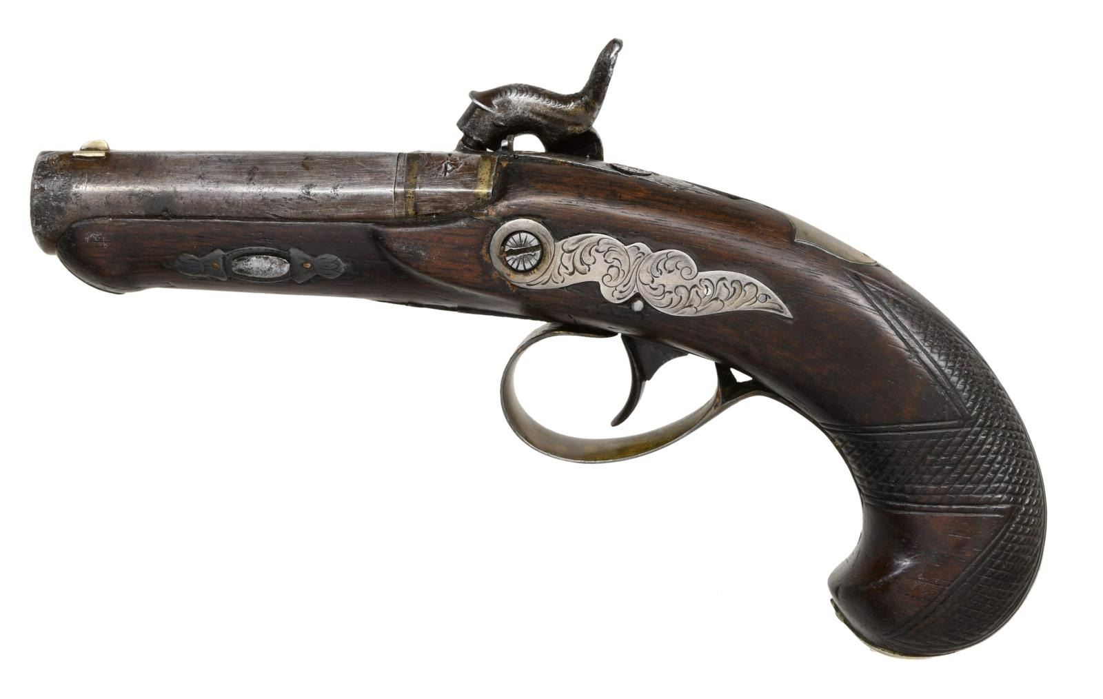 Cal. 42. NSN. 6.5" overall, 2 3/8" tapered barrel with brass inset front sight, integral notch rear sight on breech, "P" proof, engraved lock marked "DERINGER / PHILADA". Steel engraved trigger guard, pineapple finial, German silver escutcheons & side plate, changed cap compartment in butt, checkered walnut stock. CONDITION: Good overall, appears all original and matching. Gray iron patina, cleaned pitting. Repaired break in wood under lock, braised repair to back of trigger guard, small putty repairs it's around lock. Mechanically good with good rifled bore. PROVENANCE: Collection of Horst Kreiner. (01-24021/JS). ANTIQUE. $400-800.