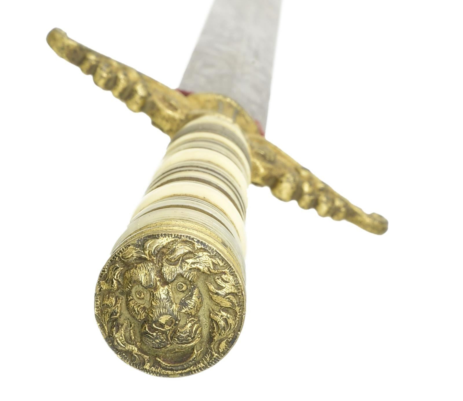 ANCHOR BLADE. Overall length: 12 3/8". Blade length: 7 3/4". The blade has a raised medial ridge and is etched over 3/4 of its length with various military, patriotic, nautical & foliate motifs. Etchings include a British crown, fouled anchor & stand of arms. Gilded brass hilt with fanciful leaf, flourish & berry guard. The pommel features a well-executed effigy of a lion head. The grip is finely turned certifiably antique ivory. Gilded brass scabbard with 2 suspension rings. CONDITION: blade shows some original factory polish with a bit of staining toward the tip. Cross guard & pommel retain nearly all of their original gilded finish. Grip is undamaged and has a wonderful luster. Scabbard retains traces of original gilding and has no apparent damage. (02-19747/BF). $1,600-2,400.