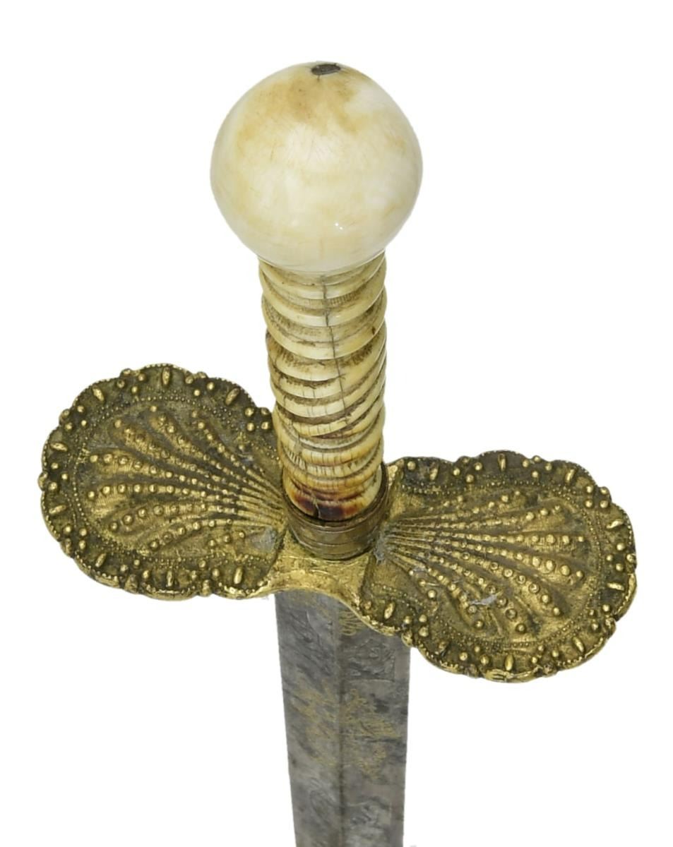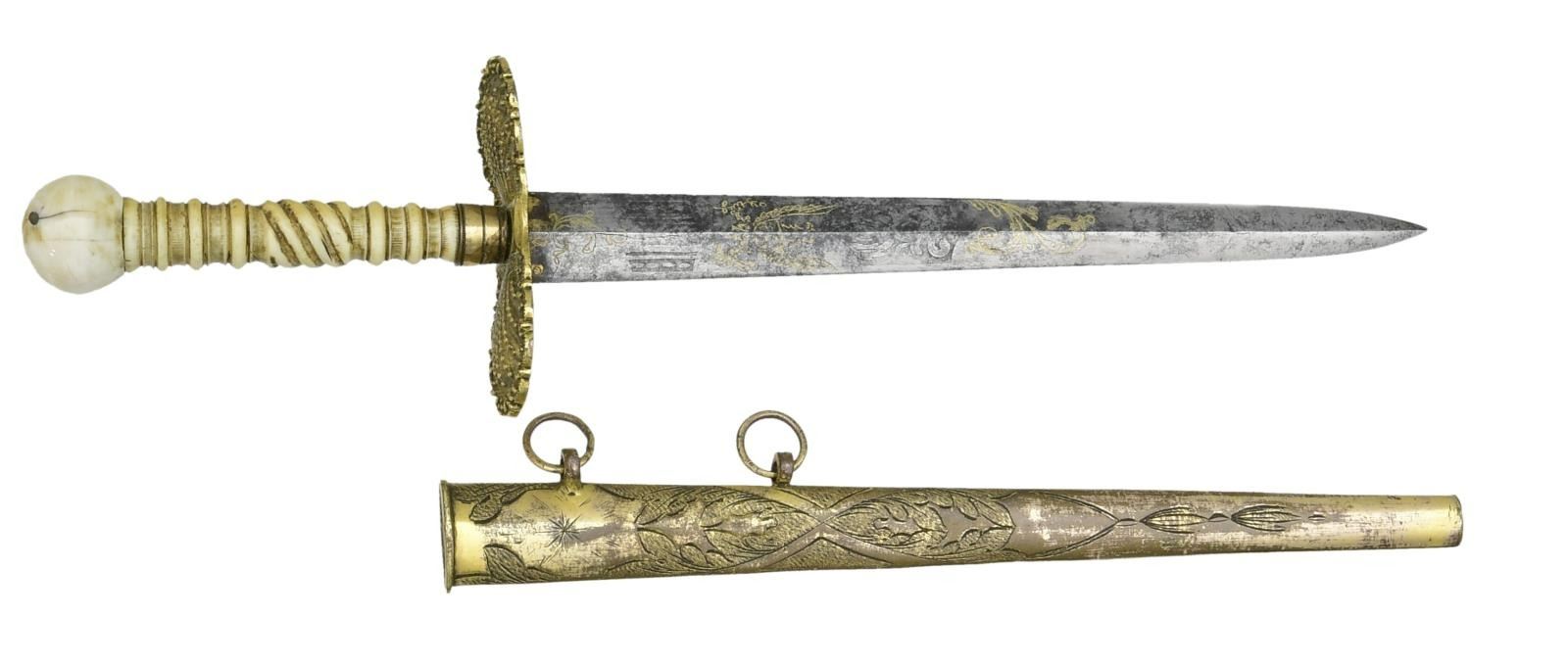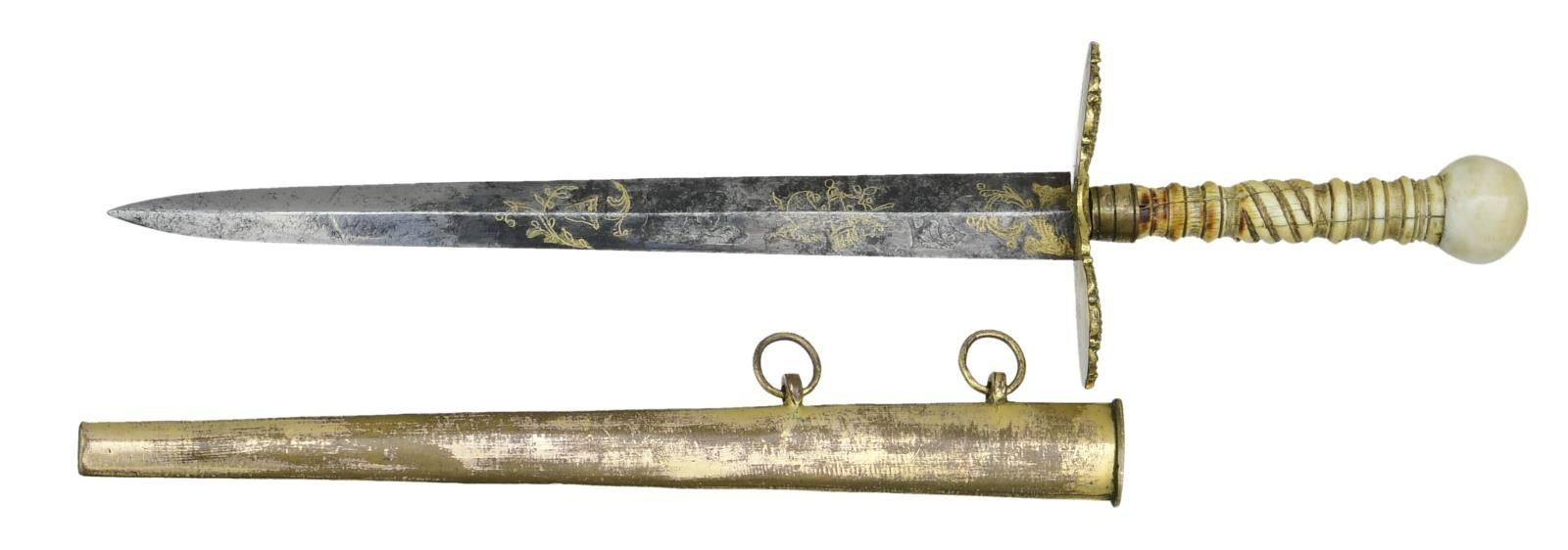BLADE. Overall length: 10 3/4". Blade length: 6 7/8". The tri-color blade has a raised medial ridge and features gold highlighted engraving on a blued field separated by 2 white panels on each side. Engraving includes foliate motifs along with a spread-winged American eagle, liberty cap & spray of arms. Gilded brass hilt with an exceptionally ornate double scallop shell guard. Turned certifiably antique ivory grip with ivory ball pommel. Gilded brass scabbard with double suspension ring. Scabbard has engraved decoration throughout the front that includes foliate motifs as well as the star of glory. CONDITION: blade retains some vestiges of the blued field and the gold highlighted engraving is quite striking and contrasts well. The guard retains nearly all of its original gilding. The grip has an expected ivory patina. Scabbard has a few very shallow dents and retains over half of its original gilding. (02-19599/BF). $1,400-2,000.