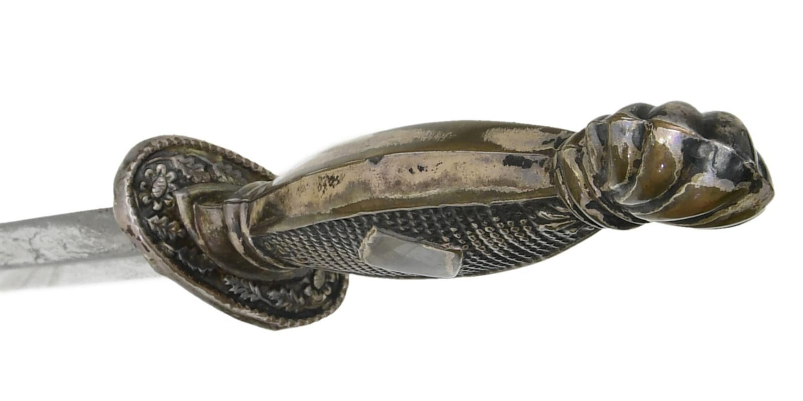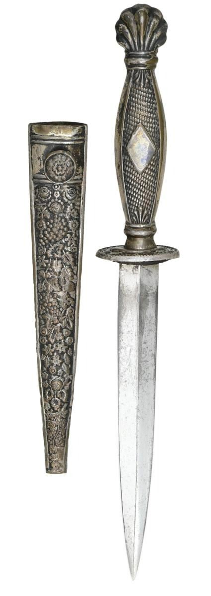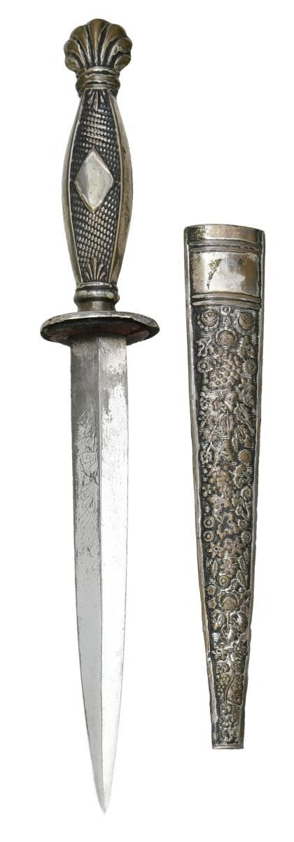 PERIOD POSSIBLY FROM BALTIMORE. Overall length: 10 1/4". Blade length: 5 1/2". The form of this dirk is quite similar to those known to have been made in the Baltimore, Maryland area. It has a plain blade with a raised medial ridge. Fancy silver plated hilt with a floral & oak leaf decorated guard and a shell pommel. The 2-sided grip has simulated wire wrap with a diamond motif in the center. The sheath has an unbelievably detailed floral & grape vine design executed in superb repousse work. The frog stud is decorated with a central flower & surrounding orbs. CONDITION: blade shows much of the original factory polish with some light discoloration. The hilt shows expected tarnish and small scattered areas where the plating has worn through. The sheath retains more than 90% of its original silvered finish. A very visually attractive dirk. (02-19746/BF). $1,500-2,000.