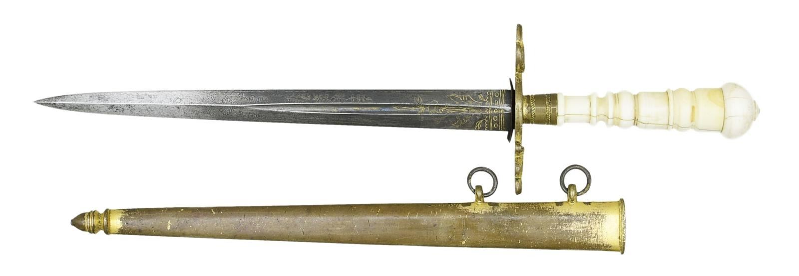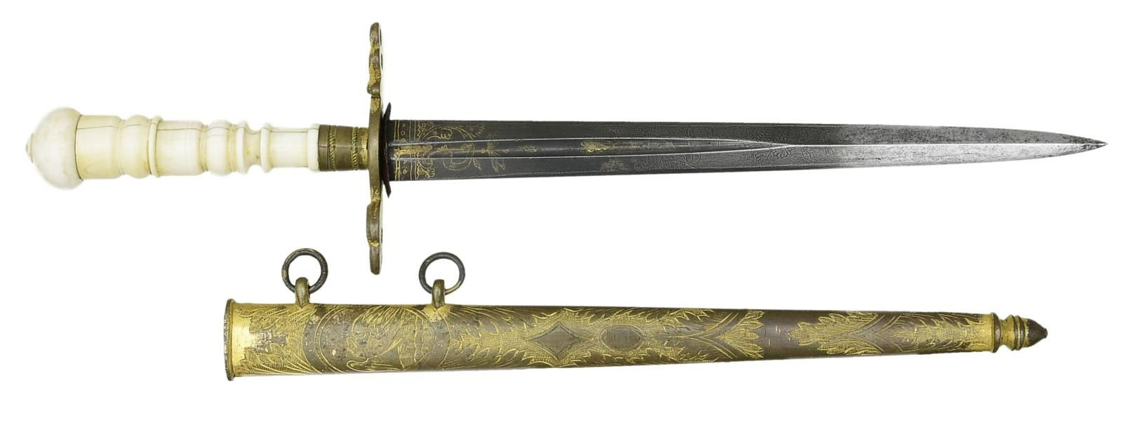 WITH EAGLE BLADE. Overall length: 11 1/2". Blade length: 7 1/2". The blue & gilt decorated blade has a 4" central fuller. Gold highlighted etching includes foliate motifs, a spray of arms with American shield & a large spread-winged American eagle with "E PLURIBUS UNUM" banner in its beak. Exquisite gilded brass guard with fully articulated snakes forming each quillon. Turned certifiably antique ivory grip with semi-circular ivory pommel. Gilded brass scabbard with 2 suspension rings is full engraved with various foliate motifs and an oval that encircles a fine rendition of an American eagle. A very attractive early American Naval dirk. CONDITION: blade has visible blued finish remaining as well as substantial gold remaining in the etched areas. 80% of the gold finish remains on the snake cross guard. Grip has a few tight age cracks. Scabbard is undamaged and retains much of its original gilded finish, particularly in protected areas. The eagle engraving is quite clear. (02-19600/BF). $1,200-1,800.