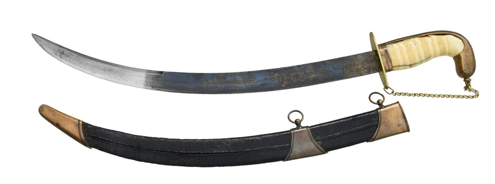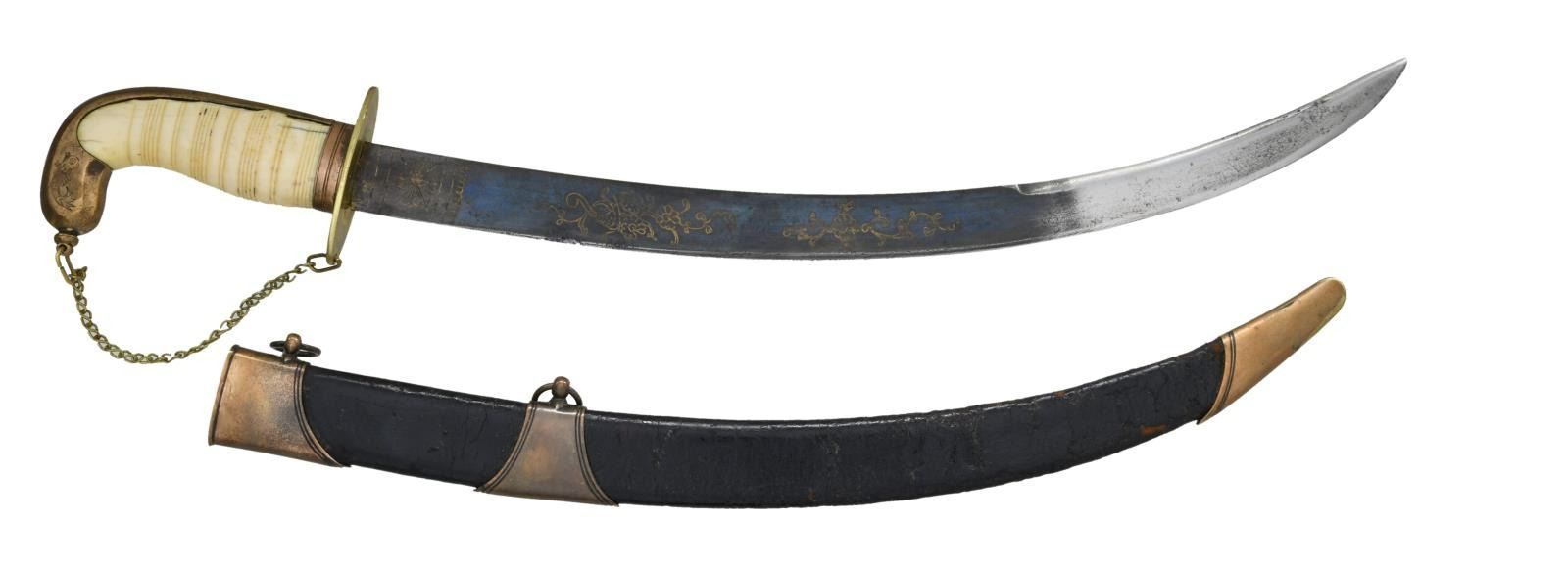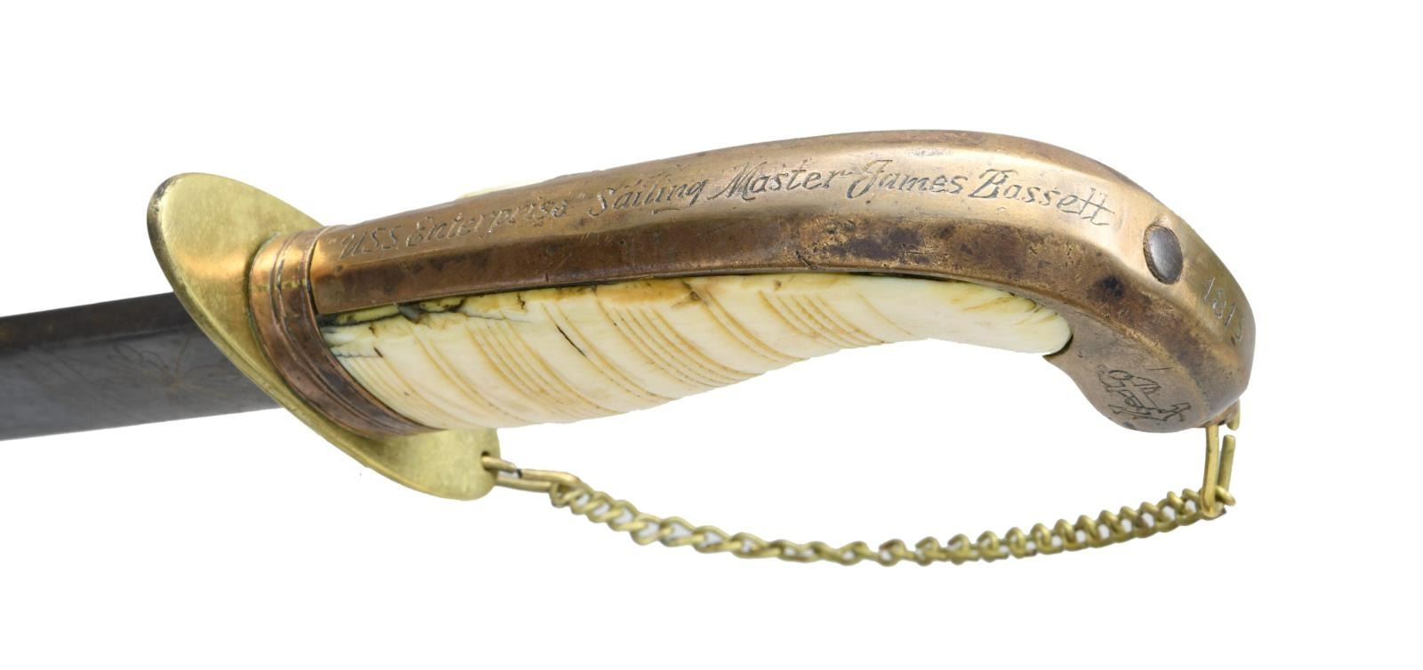 PERSONALIZED TO THE SAILING MASTER OF THE USS ENTERPRISE. Overall length: 18 3/8". Blade length: 14 1/8". The sharply curved flat blade has a 5 3/4" false edge and is blued over the first 9 1/2". The etching includes various foliate motifs, along with the bust of a female with a large hat/headdress. Gilded brass semi-pistol grip hilt. The elliptical brass guard appears to be a skilled museum quality restoration, as does the chain guard. The ferrule is linearly decorated, and the backstrap is engraved "USS. Enterprise Sailing Master James Bassett" & "1813". The sides of the pommel are engraved with a stylized dolphin on one side, and a fouled anchor on the other. Certifiably antique ivory grip with horizontal lineal carving. Gilded brass mounted leather scabbard with both mounts and the tip intact. CONDITION: the blade is most impressive with substantial blue & gold remaining and no appreciable problems. The hilt shows traces of original gilding, and the grip has a few cracks and minor losses primarily at the edge of the grip. The engraving remains quite clear, but it is difficult to determine the exact age of the engraving. The scabbard shows wear but remains quite solid. The body is flexed & flaked showing a seam opening as it nears the tip. The mounts show a trace of original gilding. An exceptionally visually impressive dirk. (02-19589/BF). $800-1,200.
