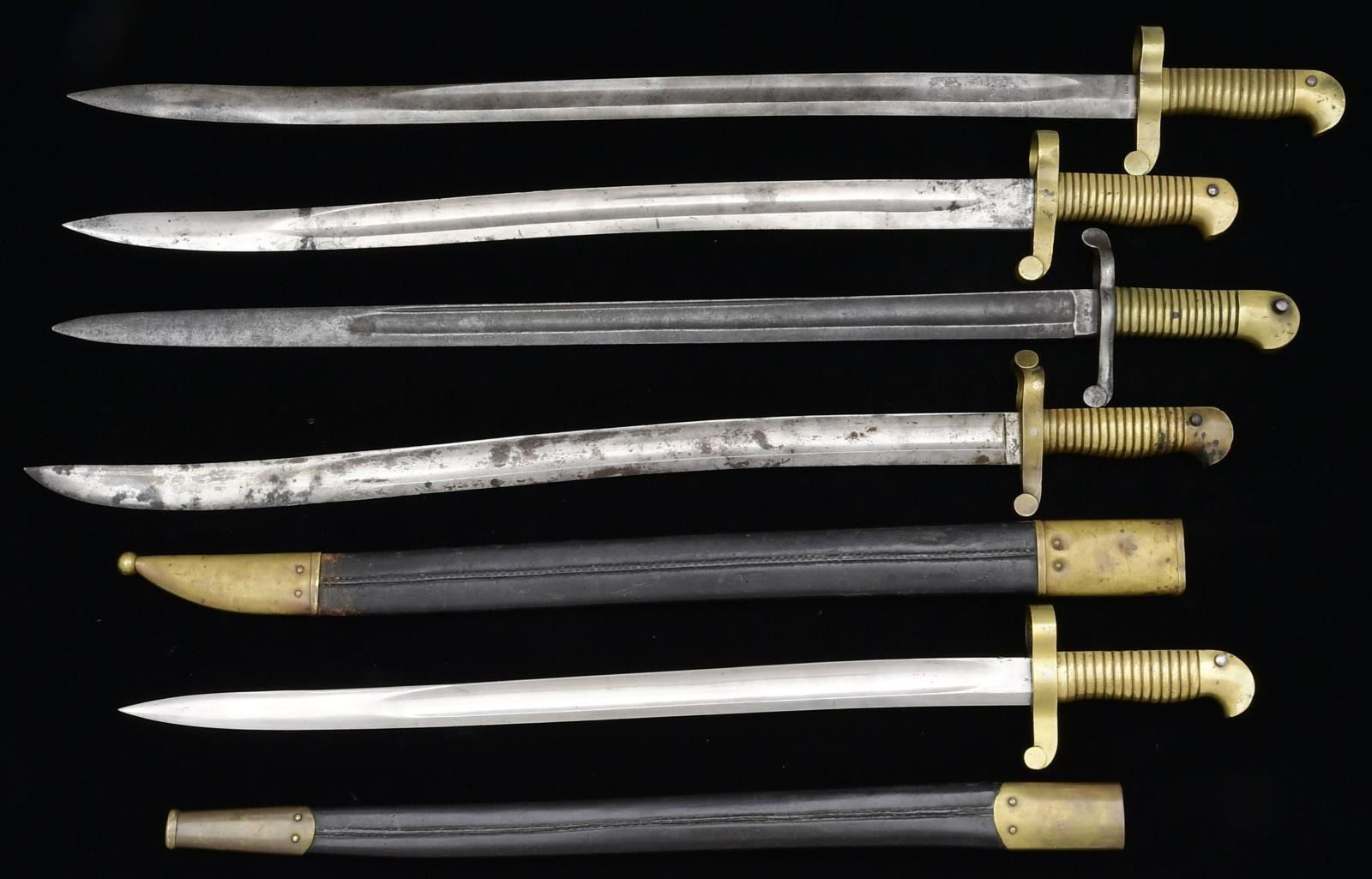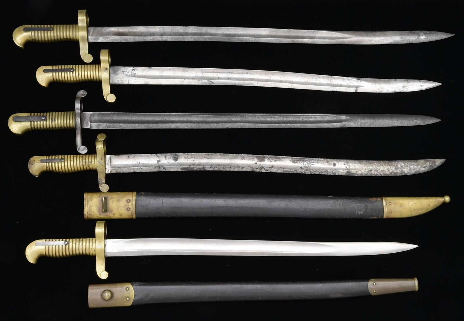 1) 1862. A fine example of an M1862 Remington Zouave saber bayonet & scabbard. Overall length: 25 1/2". Blade length: 20". Blade is stamped with an "H" at the ricasso. Solid brass hilt stamped "B.H." on the flat near the ring. Brass mounted black leather scabbard. CONDITION: blade has a light gray finish. Hilt has a pleasing light patina. Scabbard is undamaged. 2) 1855. A good example of an M1855 Colt revolving rifle and artillery carbine bayonet. Overall length: 28 3/4". Blade length: 24". Plain blade marked "S&K" at the ricasso. There is a tiny stamp on the opposite side that is "D (anchor) C". Iron crossguard & ring. Brass 1-piece grip with iron spring. No scabbard. CONDITION: blade has a dark patina. Guard has a medium gray patina. Brass has a light mustard patina. Spring functions well. 3) 1861. A good example of an M1861 bayonet for a Navy Plymouth rifle. Overall length: 27 1/2". Blade length: 22 5/8". Plain blade is marked at the ricasso "COLLINS & CO HARTFORD CONN". Solid brass hilt numbered on the top flat "6950". No scabbard. CONDITION: blade has a light gray patina with scattered staining. Hilt has a pleasing patina. Spring functions well. 4) 1862. A scarce example of an M1862 saber bayonet for a Merrill Navy rifle. Overall length: 30 1/4". Blade length: 25 3/8". Plain blade stamped at the ricasso "1861". Solid brass hilt numbered on the top flat "2206". No scabbard. CONDITION: blade has a medium gray patina with pitting at the tip. Hilt has a pleasing mustard patina. Spring functions well. 5) 1841. A fine example of an M1841 Harpers Ferry Mississippi bayonet with Harpers Ferry inspection marks. Overall length: 28 5/8". Blade length: 22 1/2". Plain blade stamped at the ricasso "PB / P". Solid brass hilt. Brass mounted black leather scabbard. CONDITION: blade does show some original factory polish, but it is mixed with heavy staining near the tip. Hilt has a pleasing patina. Spring functions well. Scabbard shows light overall wear and is quite solid. 6) M1841 ADAPTER RINGS. 2 Steel bayonet adapter rings for the US M1841 rifle. The rings are numbered "8741" & "5470". CONDITION: both rings have a medium gray patina and appear fully functional. PROVENANCE: From the Collection of James B. Taylor. (02-19878/BF). $1,500-2,000.