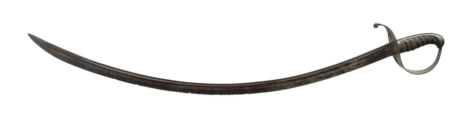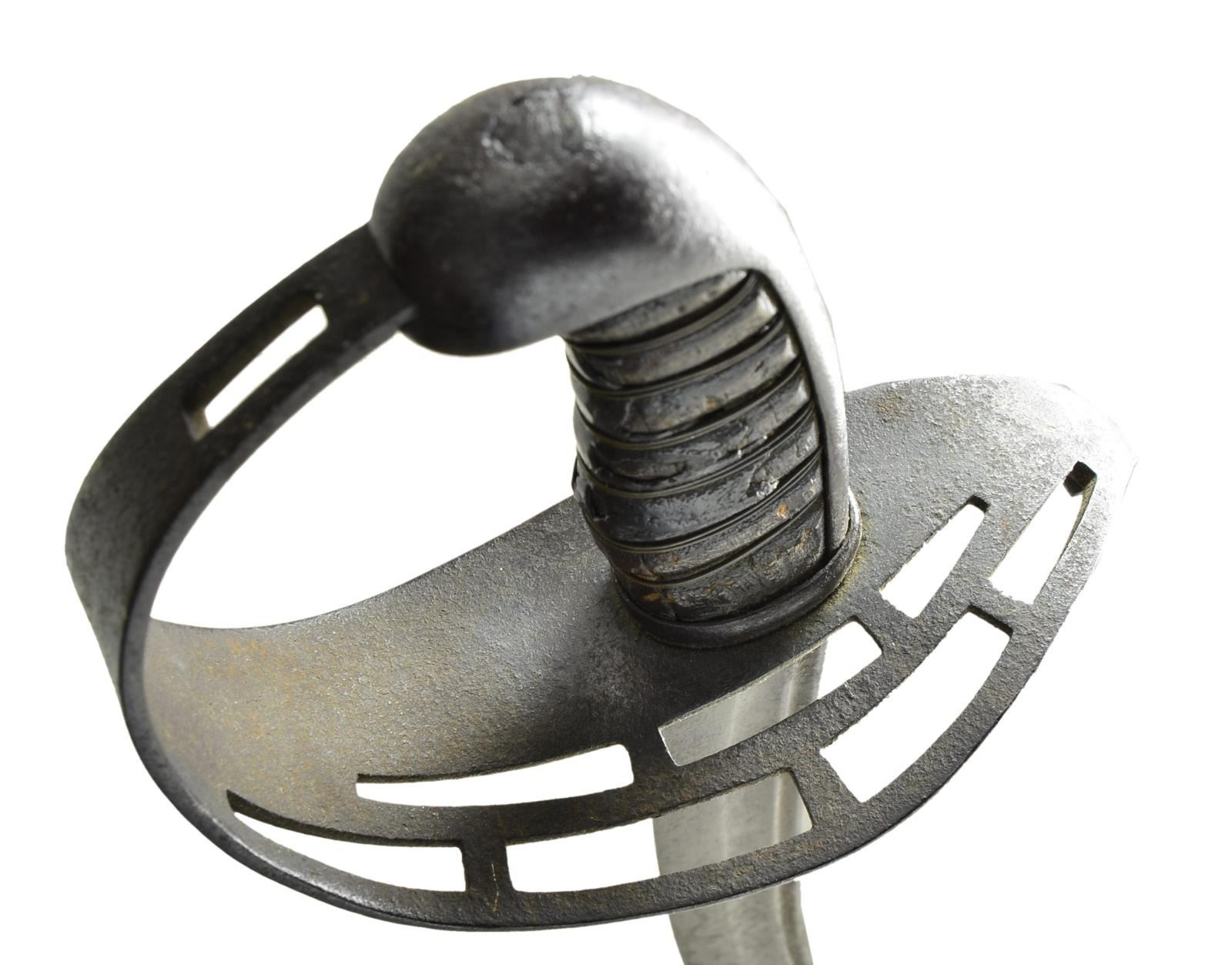 DRAGOON SABER. 40" two fuller blade, marked on top edge "4 Va REGt". Characteristic large slotted iron guard, leather covered carved wood grip with two strands of brass wire wrap. CONDITION: very good overall, iron patina, uncleaned, grip retains all brass wire wrap and about 1/3 leather, well patinaed wood where leather missing long time. (02-19142/JS). $3,000-4,000.