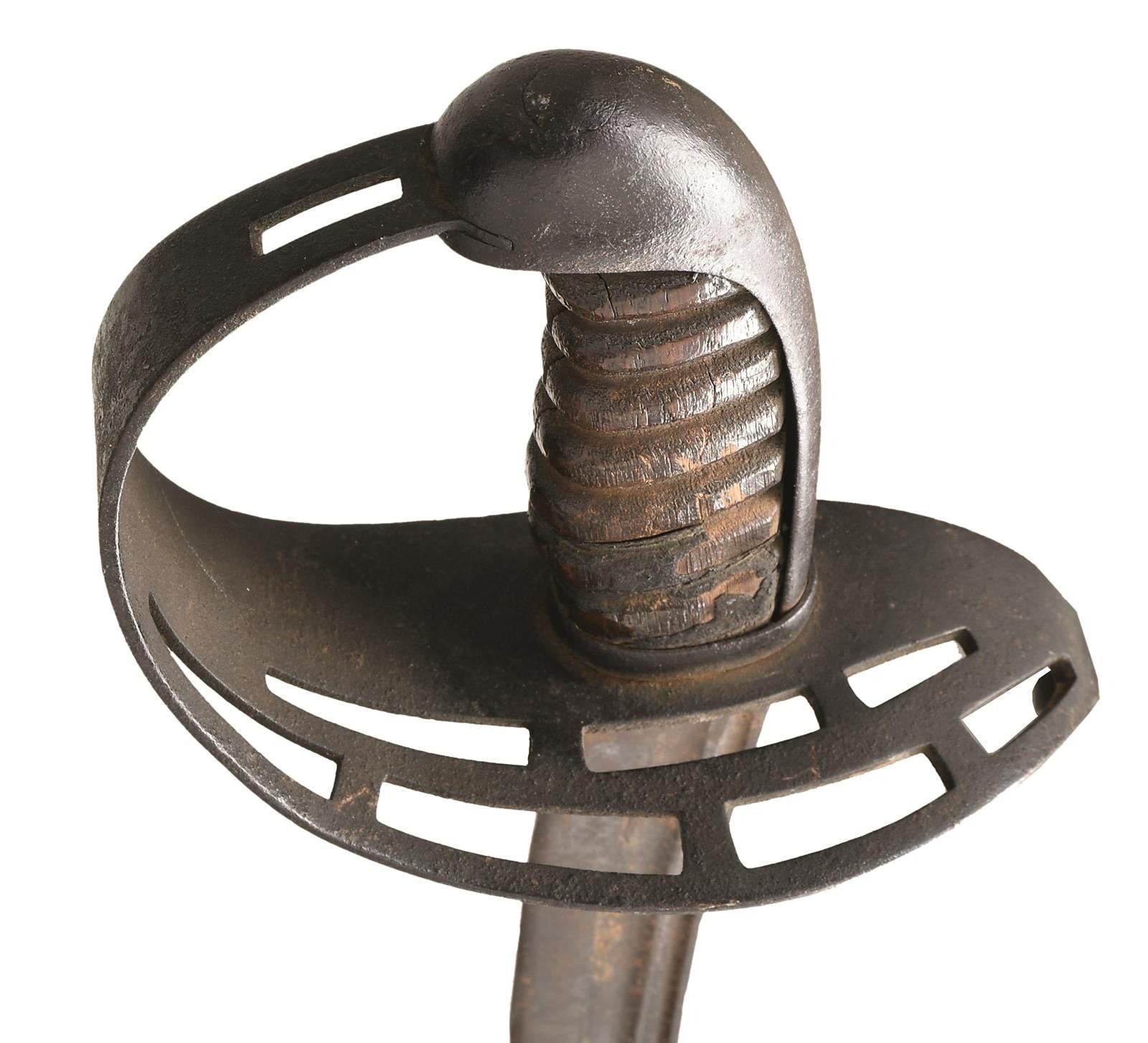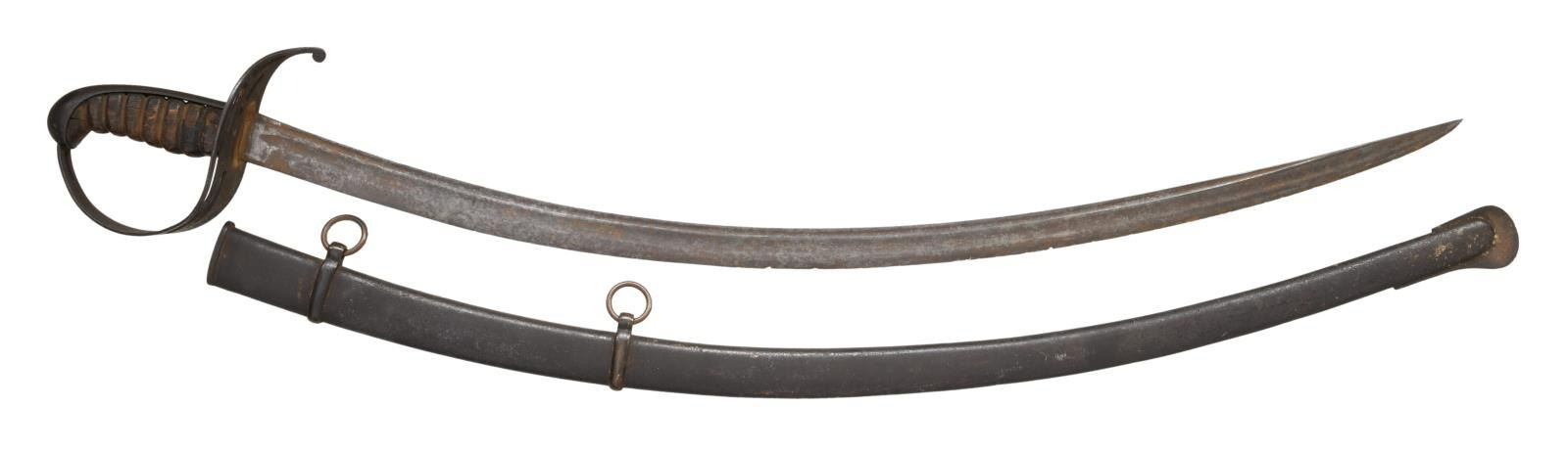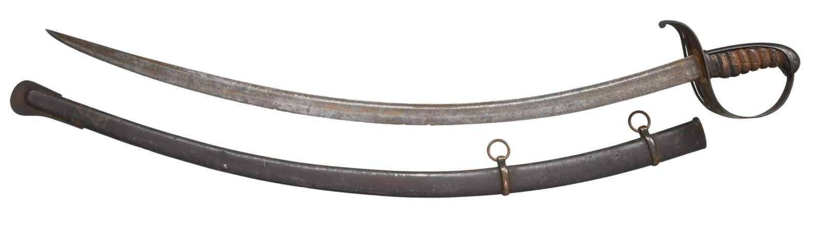 SLIMMED HORSEMAN'S SABER WITH A VIRGINIA ORDERED SCABBARD BY AMES. Overall length: 41". Blade length: 33 3/4". Blade has a single medium fuller with a secondary fuller above and a spear point. The spine of the blade is unmarked. Iron hilt with swept 7-slot guard featuring a small drop quillon. Plain knuckle bow with knot slot. Bird's head pommel with plain backstrap. Leather-wrapped wooden grip. Iron scabbard made by Ames of Massachusetts for the state of Virginia. Scabbard has brass suspension rings. CONDITION: blade has a dark patina with light pitting. There are also a few notable nicks in the edge of the blade. The hilt has a dark patina but generally shows light wear. The original grip has 98% of the wood remaining and 15% of the original leather with no wire. The scabbard body shows black paint mixed with light oxidation. (02-20038/BF). $2,800-3,800.