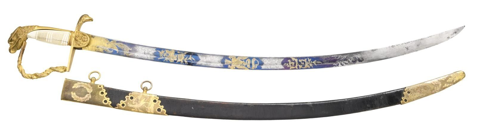 INTRIGUING TRI-COLOR BLADE. Overall length: 38 1/2". Blade length: 33 1/4". Blade has a single wide fuller with gilded etching on a blued field amongst white panel highlights. This beautiful blade has 4 separate areas of gilded etching on each side separated by white (unblued) foliate decorated panels. Etching includes a large spread-wing American eagle with a ribbon in its beak that reads "E PLURIBUS UNUM". There is also a seated Indian warrior princess, 2 large sprays of arms, and 4 areas of foliate decoration. There is a scallop topped banner near the ricasso that reads "WARRANTED". Gilded brass hilt includes an exceptionally well-done feathered eagle head quillon, and both languets are embellished with oak leaves & acorns. The knuckle bow features a seldom seen, well-articulated serpent curled around oak leaves. The eagle head pommel shows intricate detail and flows seamlessly into a faceted backstrap. Carved ivory grip with both horizonal & vertical linear decoration. Gilded brass mounted leather scabbard has a wreath engraved on the top mount. A large American eagle on rocks adorns the middle mount, and there is ample foliate decoration covering the tip/drag. Obviously, a sword for a very high-ranking officer, possibly a General. CONDITION: the blade has a few areas of cleaned pitting near the tip not affecting the highly decorative blade. Nearly all of the gilded highlights remain in the etching, and the blued field is 90% and retains stunning color. The 3 white panels on each side of the blade serve to highlight & even accentuate the fine etching. The hilt retains nearly all of its original gilded finish. There is one notable age crack in the body of the grip and some minor chipping at the base of the pommel. The scabbard remains quite solid, but the body is a bit flexed and very slightly flaked. The mounts retain nearly all of their original gilded finish. (02-19965/BF). $3,500-6,500.