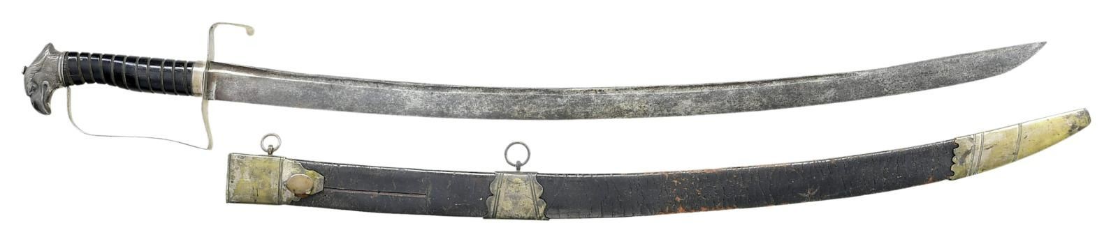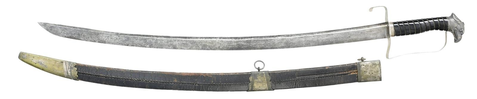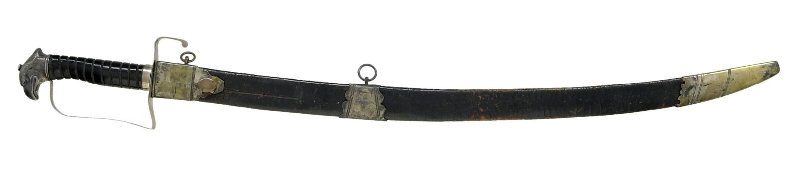 OFFICER'S SABER. Overall length: 33". Blade length: 26 1/4". Plain blade with a single narrow fuller near the spine. Solid silver hilt with a downturned quillon. Plain guard, knuckle bow & ferrule. Beautifully rendered Philadelphia silver eagle pommel with a replaced hexagonal capstan rivet. Carved ebony grip with no wrap present. Silver plated brass mounted leather scabbard. CONDITION: blade has a dark gray mottled patina. Hilt is loose and significantly bent, but complete. The tape wrap on the grip is missing. Scabbard retains 40% of the silver plating on the mounts. Leather is badly flexed, but complete. (02-19204/BF). $2,800-3,500.