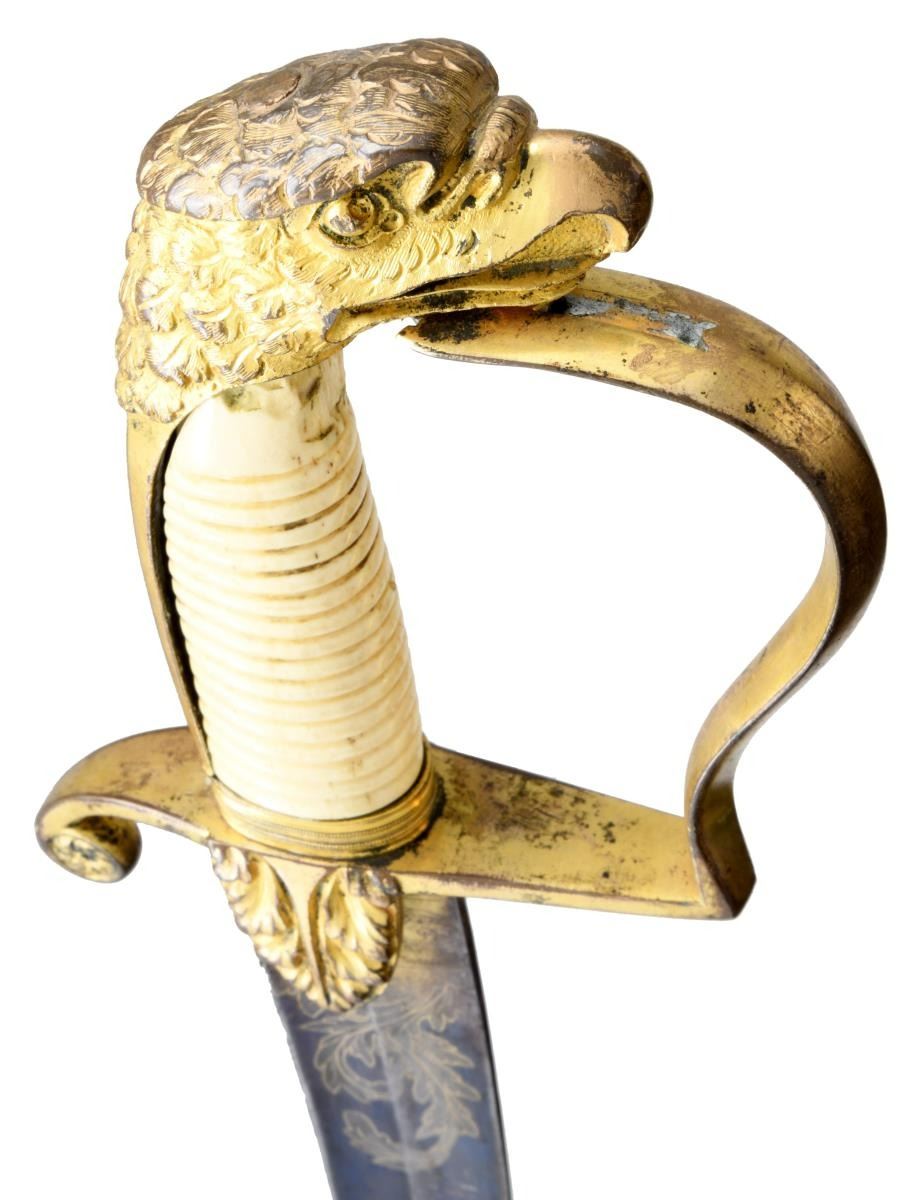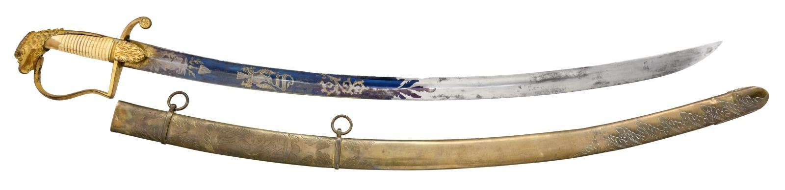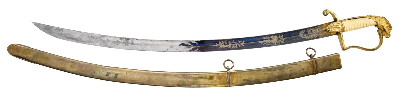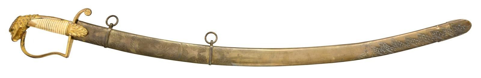 SABER. Overall length: 37 1/2". Blade length: 30 1/8". Blade has a single wide fuller and features gold highlighted etching on a blued field covering over half the blade. Etching includes foliate & military motifs with a large central spread-wing eagle with 15 stars on a central shield and a ribbon above bearing the words "E PLURIBUS UNUM". Gilded brass hilt with a downturned floral decorated quillon and leaf embellished languets. Plain guard and reverse P knuckle bow. Very well executed eagle head pommel & faceted backstrap. Certifiably antique ivory ridged grip. Gilded brass scabbard with oak leaf decoration and a central American eagle with upturned wings. CONDITION: blade has a light gray patina with light wear to the gold etching & blued field. Hilt retains nearly all of the original gilded finish. Grip has a tight age crack and a few chips with one repair at the pommel. Scabbard shows only traces of original gilding, but etching remains clear. There is a small repair 9" back from the tip. (02-19188/BF). $1,800-2,500.