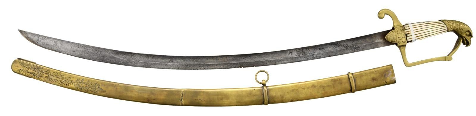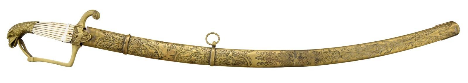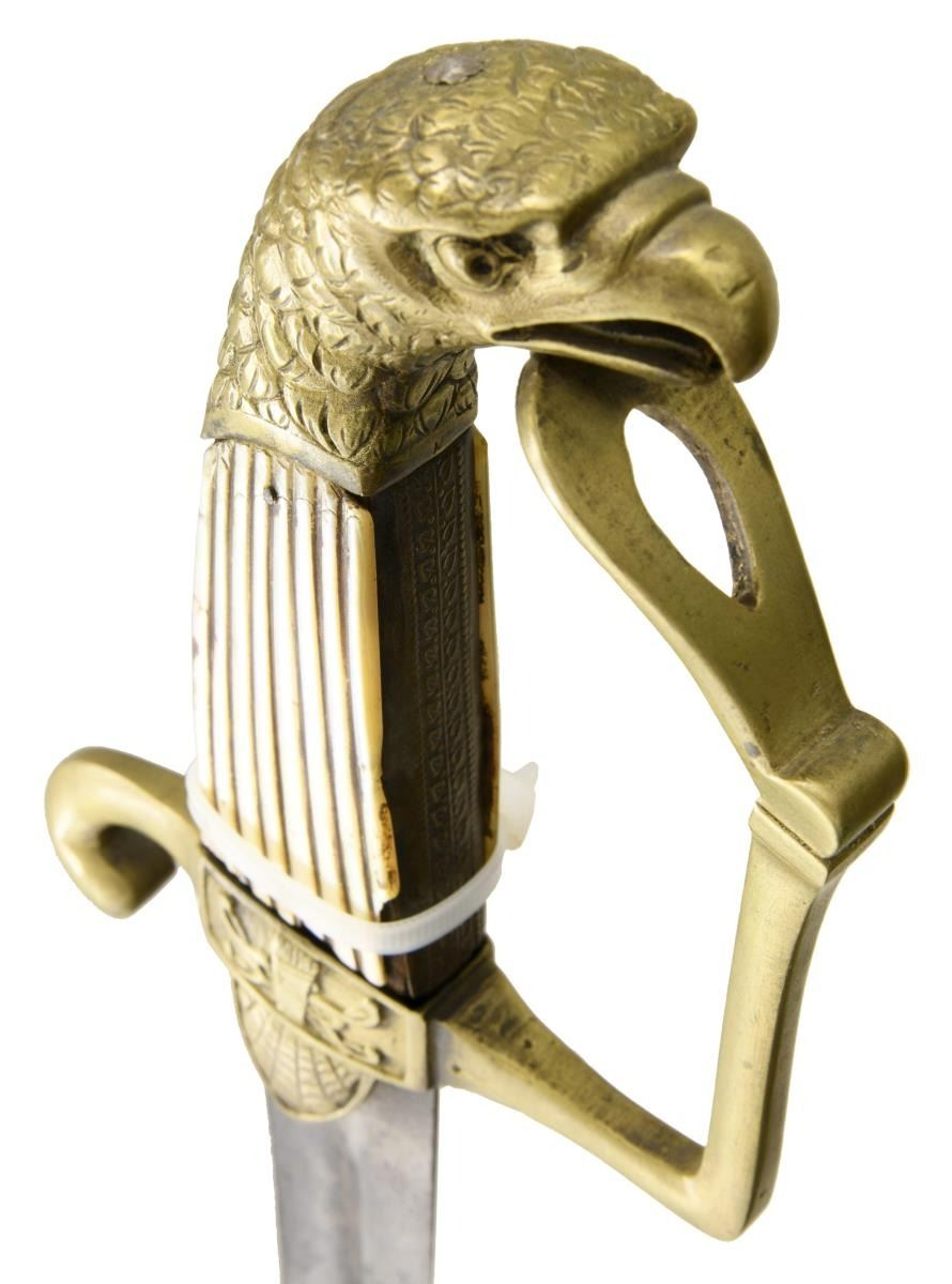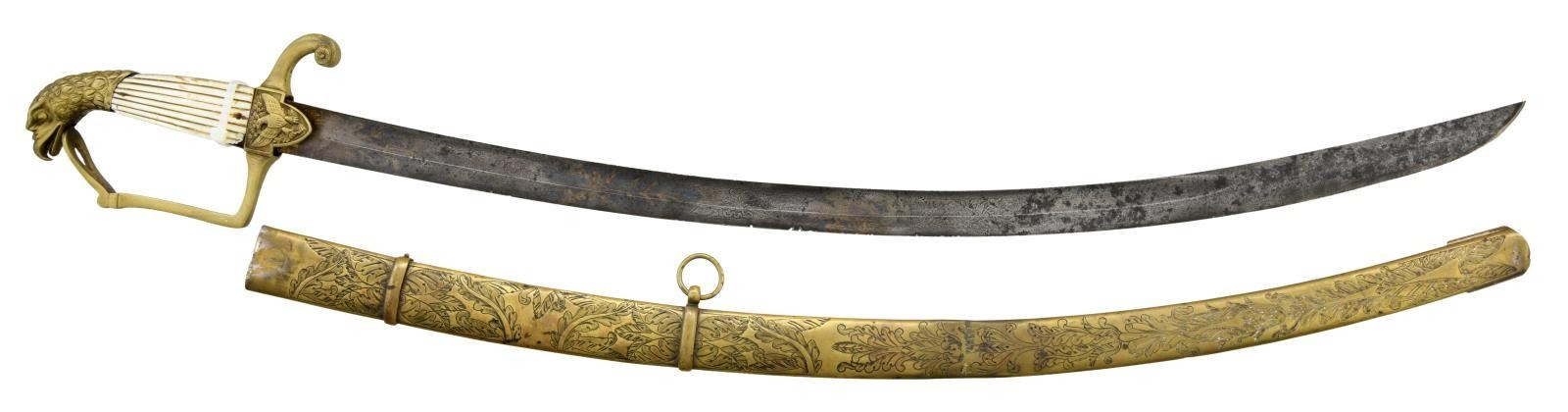 OFFICER'S SABER BY SPIES. Overall length: 35 1/2". Blade length: 29". Blade has a single wide fuller and appears to be at one time a tri-colored blade. Blade has gold highlighted etching on a blued field over 3/4 of its length. Etching includes foliate, military & patriotic motifs, including a large spread-wing American eagle with a ribbon in its beak that reads "E PLURIBUS UNUM". Etching near the hilt reads "A.W. SPIES WARRANTED". Brass hilt was likely originally gilded and has a heavy downturned quillon. The front languet has an American eagle motif, and the rear languet shows classical arms above a spiderweb. Plain knuckle bow with a large ovate knot opening. Very finely articulated eagle head pommel with 2-piece reeded mother of pearl panel of grips. Heavily foliate embellished brass scabbard was likely also originally gilded. CONDITION: blade has a dark overall mottled patina with nicks to the edge. Less than half of the gold highlights and bluing remain. Hilt is a bit loose but undamaged with no remaining gold finish. Grips have numerous small chips, particularly on the rear grip. Scabbard has no gilding remaining but boasts a very pleasing deep rich patina. (02-19216/BF). $1,000-1,400.