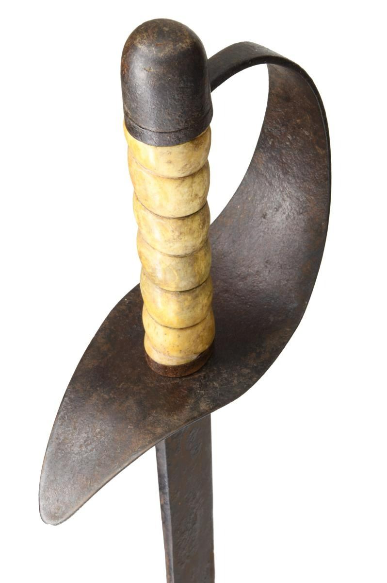 Overall length: 36 1/2". Blade length: 30". Plain, flat blade with a slightly rounded tip. Sheet iron hilt is quite heavy and void of decoration, as one would expect. High-domed pommel with a small ferrule above the counterguard. Carved bone grip with 6 spirals that may have had wire at one time. No scabbard. CONDITION: blade has a dark overall patina with scattered light pitting throughout. There are 2 small but noticeable forging flaws in the blade. The hilt & pommel are quite solid. The grip in undamaged except for a small crack near the pommel. (02-20094/BF). $2,400-3,000.
