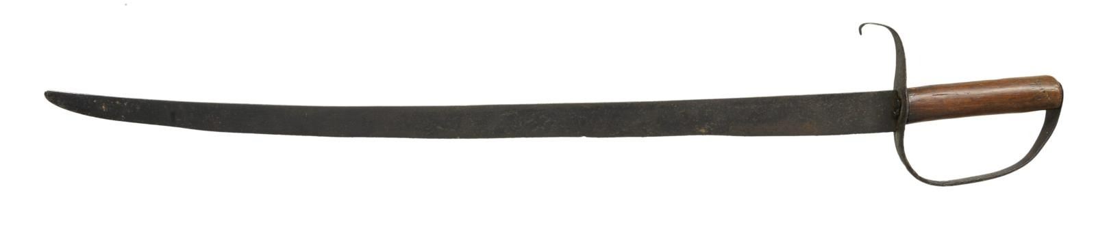 Overall length: 33 1/8". Blade length: 28". This is an interesting sword, likely of the Revolutionary War period, made by a reasonably skilled blacksmith, but most assuredly not a sword cutler. Plain blacksmith forged blade. Iron hilt with a downturned integral flat quillon. Plain guard and D-form knuckle bow. 1-Piece cylindrical wood grip with early nails securing the guard to the grip from under the guard. No scabbard. CONDITION: blade has an overall dark patina, as does the iron hilt. Grip shows wear to the surface, but remains undamaged. (02-19152/BF). $1,200-1,500.
