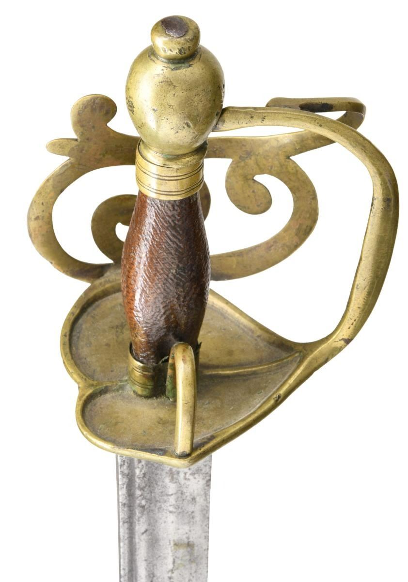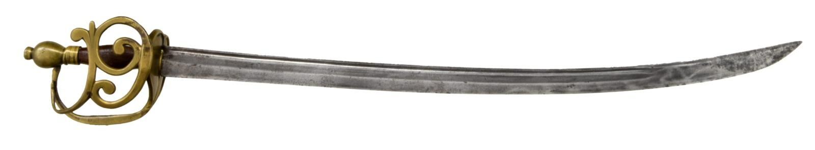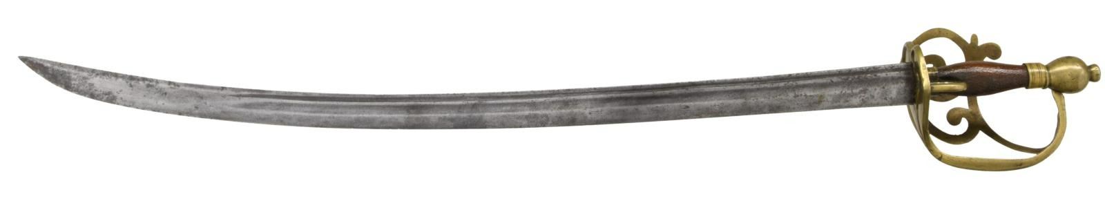 This French saber dates from about 1750 to 1770 and is typical of weapons carried during the French & Indian War. A very similar example is pictured on page 118 of "Swords & Blades of the American Revolution" by Newman. Overall length: 35 1/4". Blade length: 29 1/4". Plain blade with a single medium fuller and a secondary fuller near the spine. Brass hilt of semi-basket form with a heart-shaped guard missing its quillon. There is a thumb ring on the upper side of the guard opposite heavy brass scrollwork forming a near basket for hand protection. Large, plain egg-shaped pommel and 2 linearly decorated ferrules. The grip has lost its wire wrap but the wooden core remains. No scabbard. CONDITION: blade has a medium gray patina with scattered areas of light pitting. Hilt is quite solid but, as stated, is missing its quillon and grip wire.(02-20041/BF). $1,000-1,400.