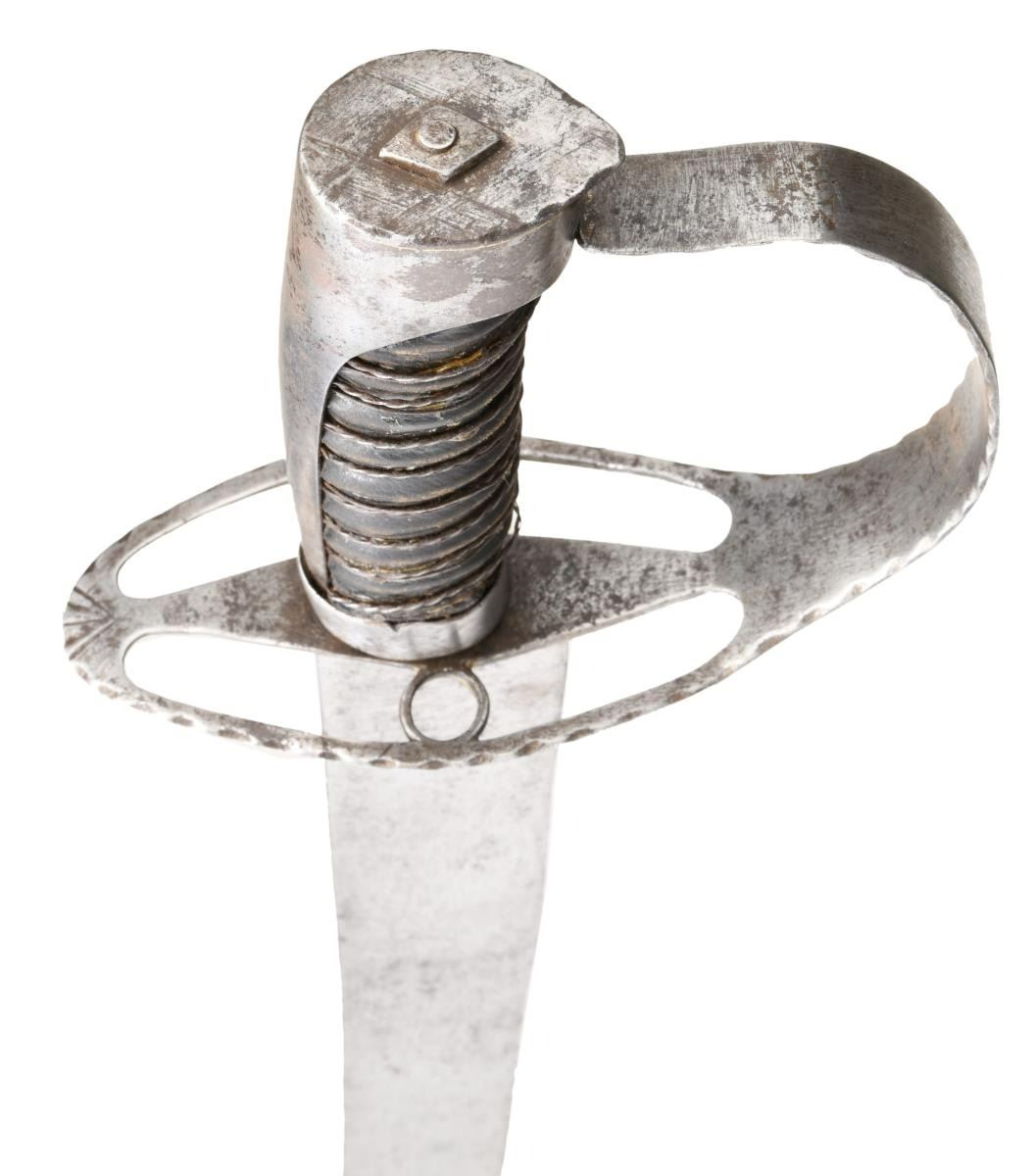 This short saber was discovered in Pennsylvania and obviously shows Germanic influence in its construction. Overall length: 28 3/8". Blade length: 23 1/4". Plain blade. Iron hilt with a stylized 4-slot counterguard. Plain knuckle bow with scalloped edges. Integral pommel & backstrap with pointed flat pommel cap & diamond tang nut. Iron wire-wrapped leather grip. No scabbard. CONDITION: blade has a light gray, cleaned finish, as does the hilt. Grip retains 95% of the original leather. Wire is complete but a bit loose. (02-20033/BF). $500-800.