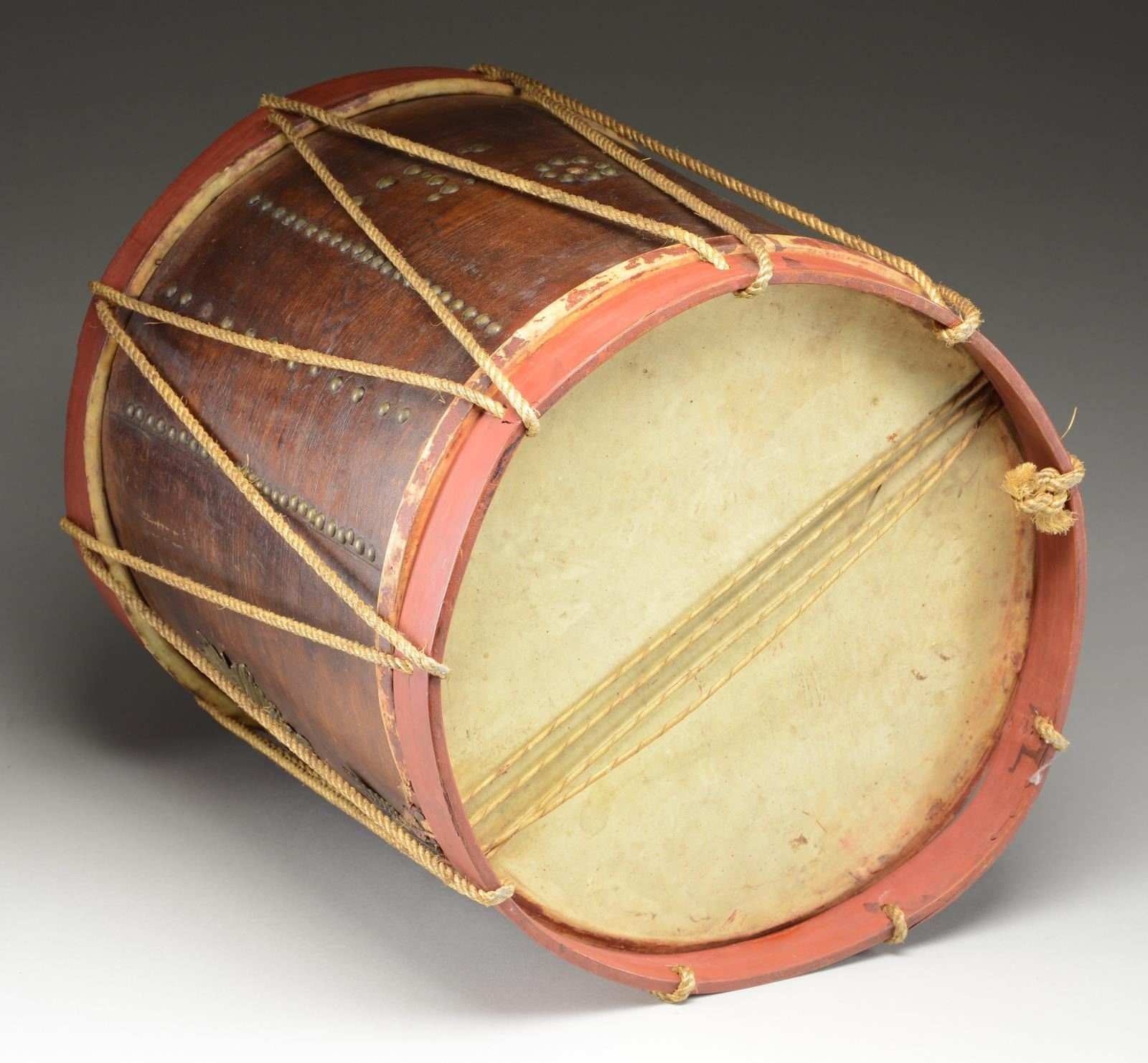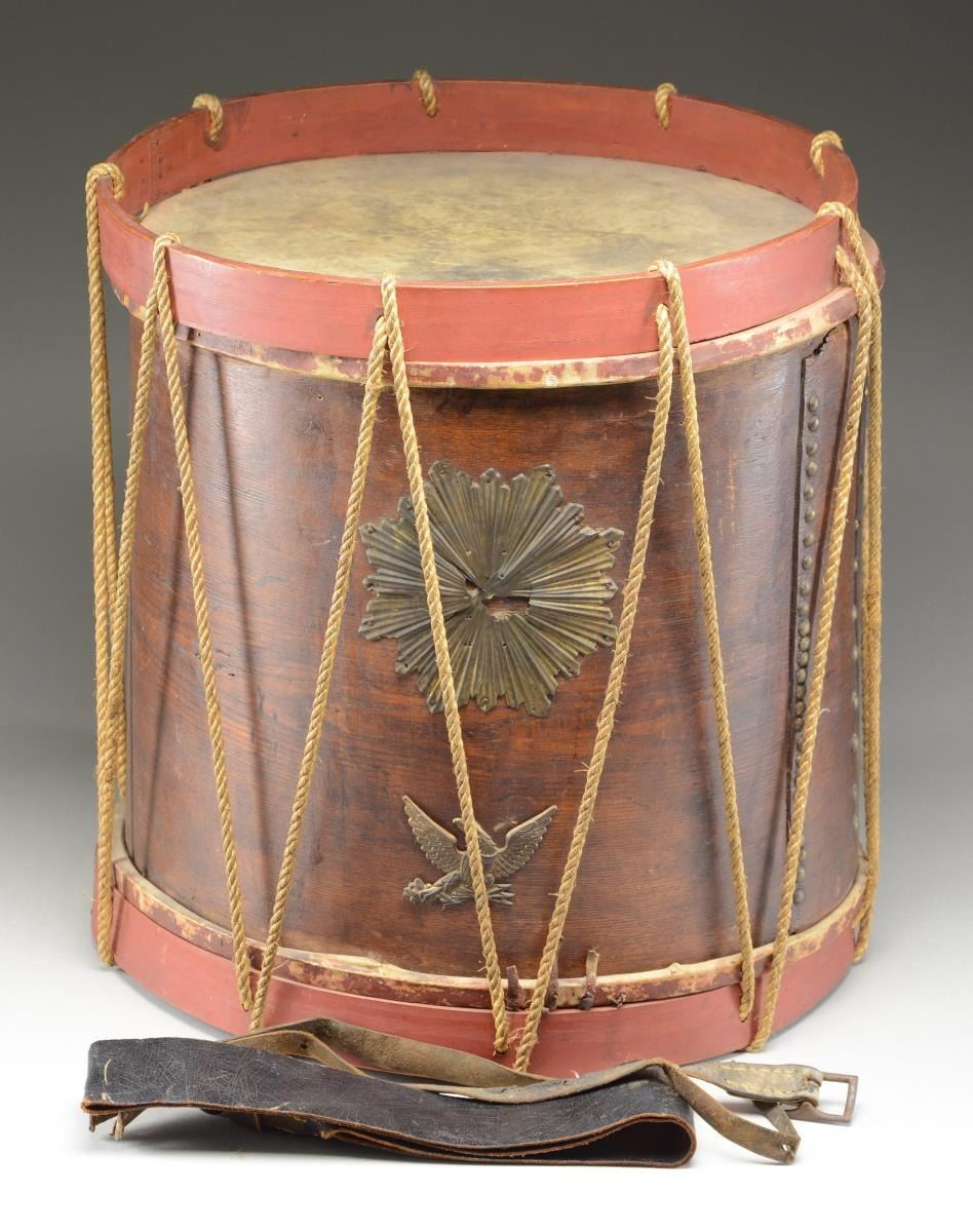 Drum measures 15 1/4" across and 17" high. It has an upper & lower skin intact with the lower skin having 4 snares. The 2 hoops are the early lace-through style & are painted brick red, as commonly seen on early militia drums. The wooden body of the drum has domed brass tack decoration at the seam, the peep hole, and between the two. The front of the drum has an attached 1830's era militia hat star and an M1821 US hat eagle. There is no label visible inside the drum. The ropes appear to be early replacements. This drum includes an over-the-shoulder carrying strap of black finished leather. The shoulder strap is 2 1/2" wide, and the suspension straps are nearly 1/2" wide. CONDITION: the skins are generally quite nice with just a couple of tiny splits. The hoops were likely repainted in the useful life of the drum. The hoops are somewhat misshaped and could likely benefit from steaming & repositioning. The body of the drum is generally quite solid. The carrying strap shows light to moderate wear, and the suspension straps show moderate to heavy wear. (02-20129/BF). $1,000-1,500.