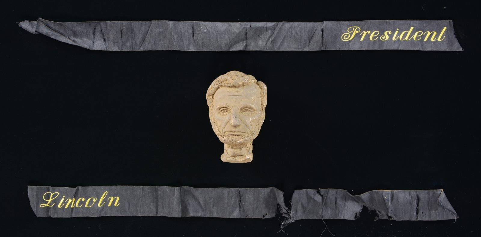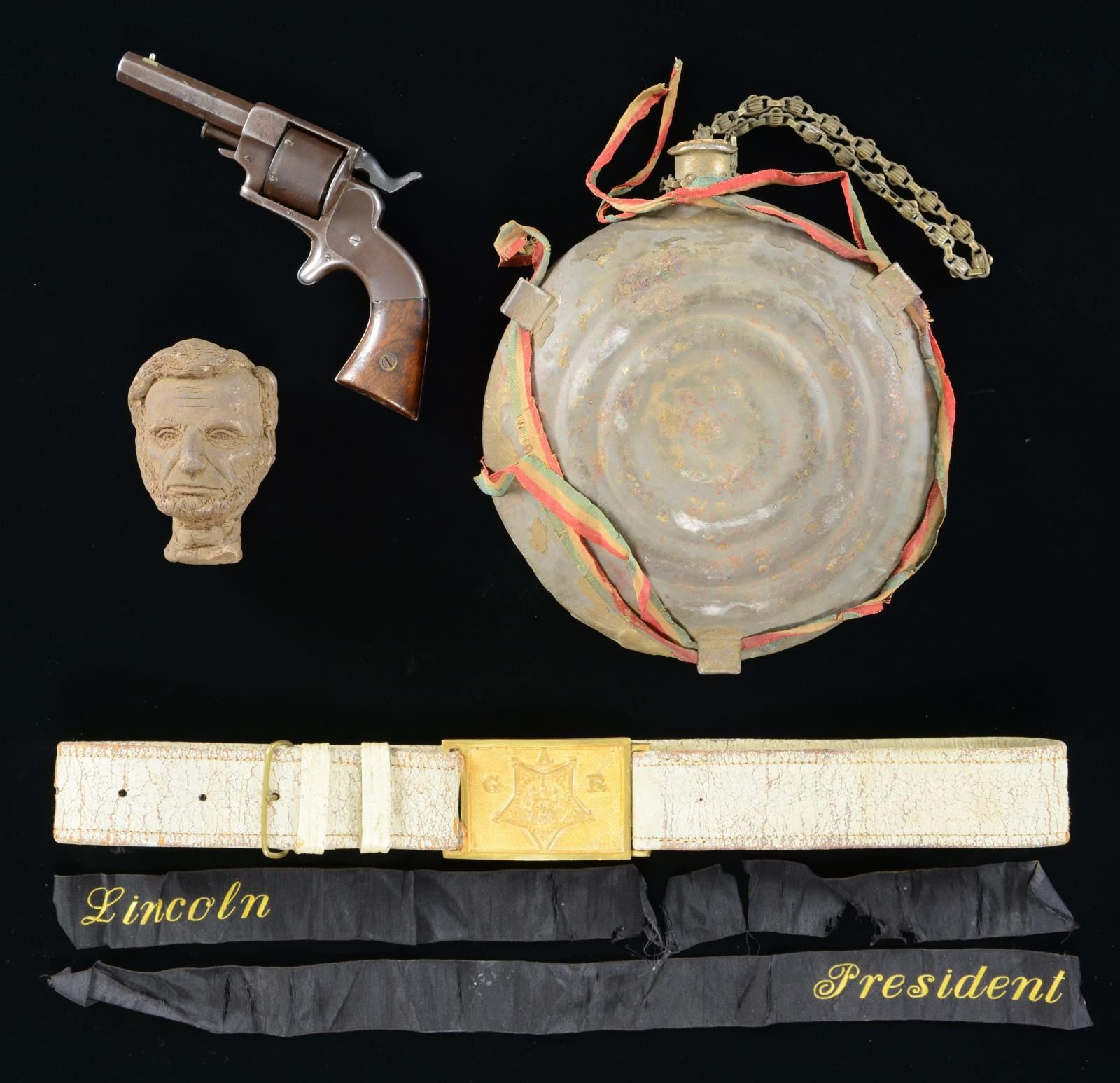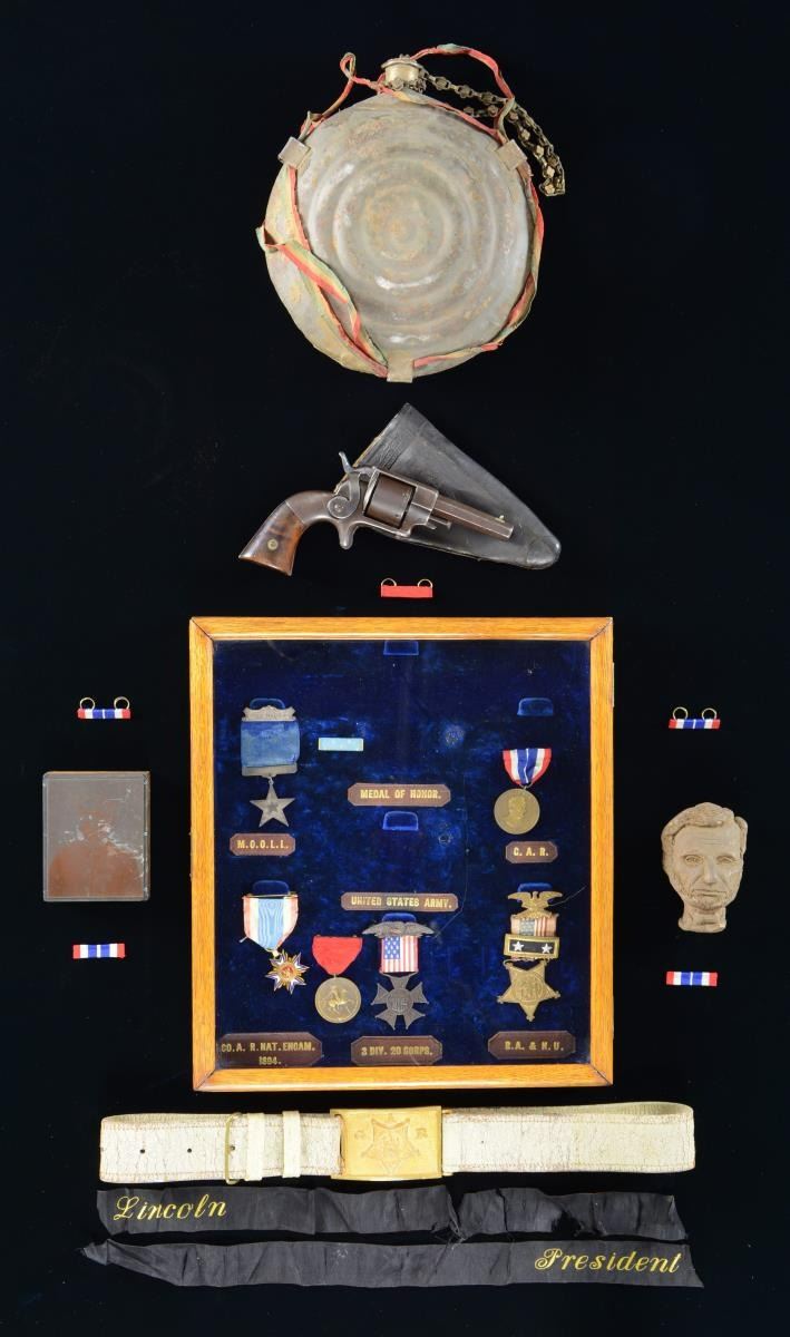 The frame of medals with missing with 2 empty spaces where Medals of Honor originally sat. The MOHs were previously donated to a national museum. Remaining medals include 33rd Massachusetts badge, GAR commander's badge (Major General), Civil War campaign medal # 127 & Indian War campaign medal # 232, and MOLLUS membership medal. Joseph was bit of an artist (as were his children) and made a 3 1/2 inch clay sculpture of the face of Abraham Lincoln and signed it with his initials. There is a black silk morning ribbon silk embroidered "President Lincoln" which is broken but still presents nicely. Bullseye Canteen with pewter spout probably used in Atlanta campaign, with remnants of gold paint and frayed red, white, and blue ribbon. Allen & Wheelock, 32 rimfire, pocket revolver, S# 517, 3" barrel, 1875 patented pocket case (holster), 3.5x2.5" wood block copper printing plate of Sladen as GAR post commander, GAR belt, box for his Civil War campaign ribbon bars. (02-17895-8, 01-23773/JS). $2,000-4,000.