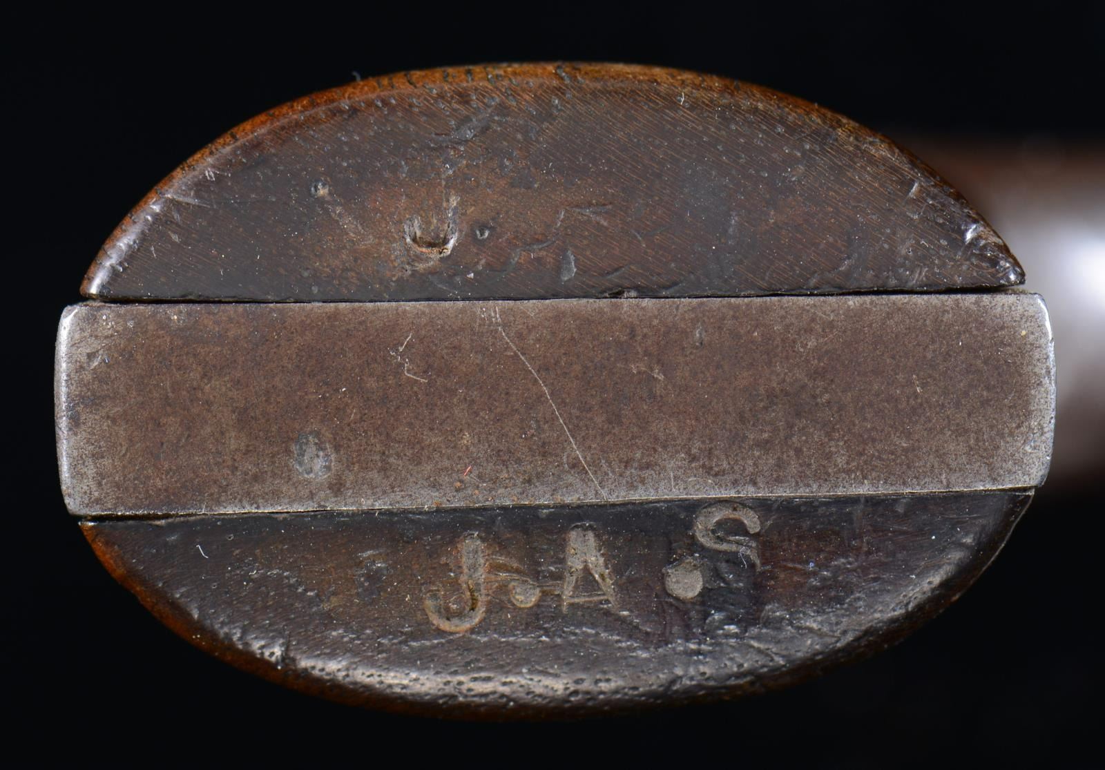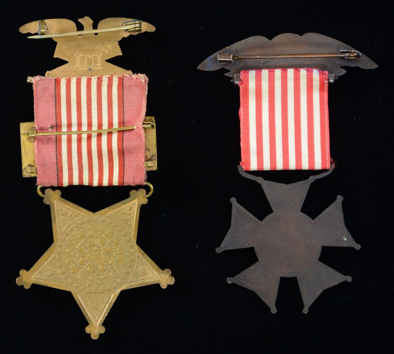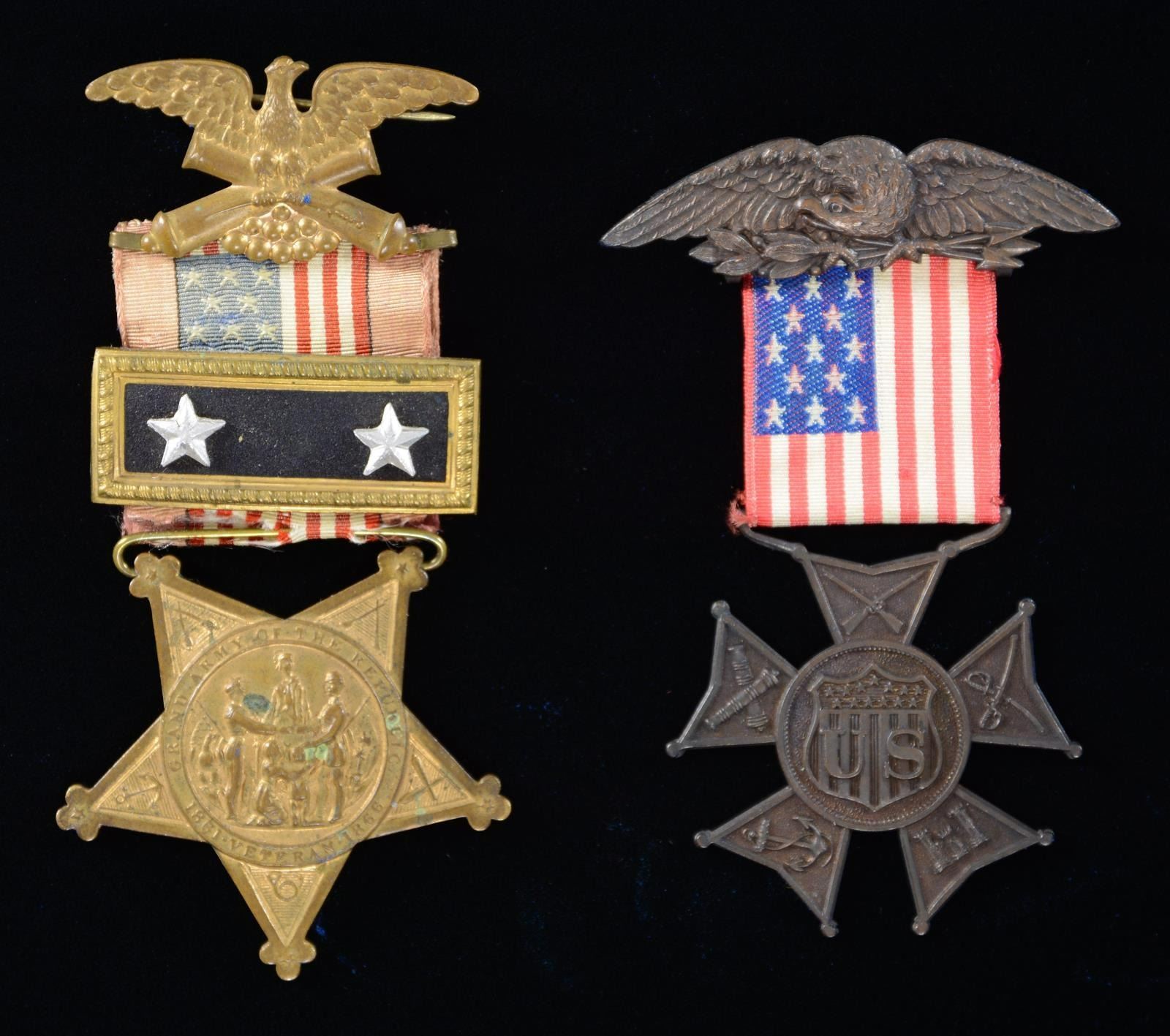 The frame of medals with missing with 2 empty spaces where Medals of Honor originally sat. The MOHs were previously donated to a national museum. Remaining medals include 33rd Massachusetts badge, GAR commander's badge (Major General), Civil War campaign medal # 127 & Indian War campaign medal # 232, and MOLLUS membership medal. Joseph was bit of an artist (as were his children) and made a 3 1/2 inch clay sculpture of the face of Abraham Lincoln and signed it with his initials. There is a black silk morning ribbon silk embroidered "President Lincoln" which is broken but still presents nicely. Bullseye Canteen with pewter spout probably used in Atlanta campaign, with remnants of gold paint and frayed red, white, and blue ribbon. Allen & Wheelock, 32 rimfire, pocket revolver, S# 517, 3" barrel, 1875 patented pocket case (holster), 3.5x2.5" wood block copper printing plate of Sladen as GAR post commander, GAR belt, box for his Civil War campaign ribbon bars. (02-17895-8, 01-23773/JS). $2,000-4,000.