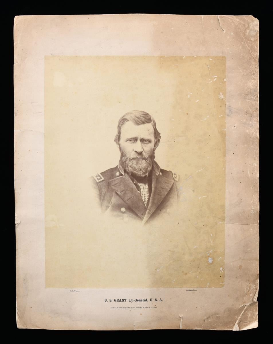 ULYSSESS S. GRANT. 17.5x13.5" board, 13x11" image published by HF Warren, Waltham, Mass "photographed on the field, March 15 1865". CONDITION: poor to fair, soiled and board broken on right top and bottom corner, soiled and stained. (02-17895-9/JS). $500-1,000.