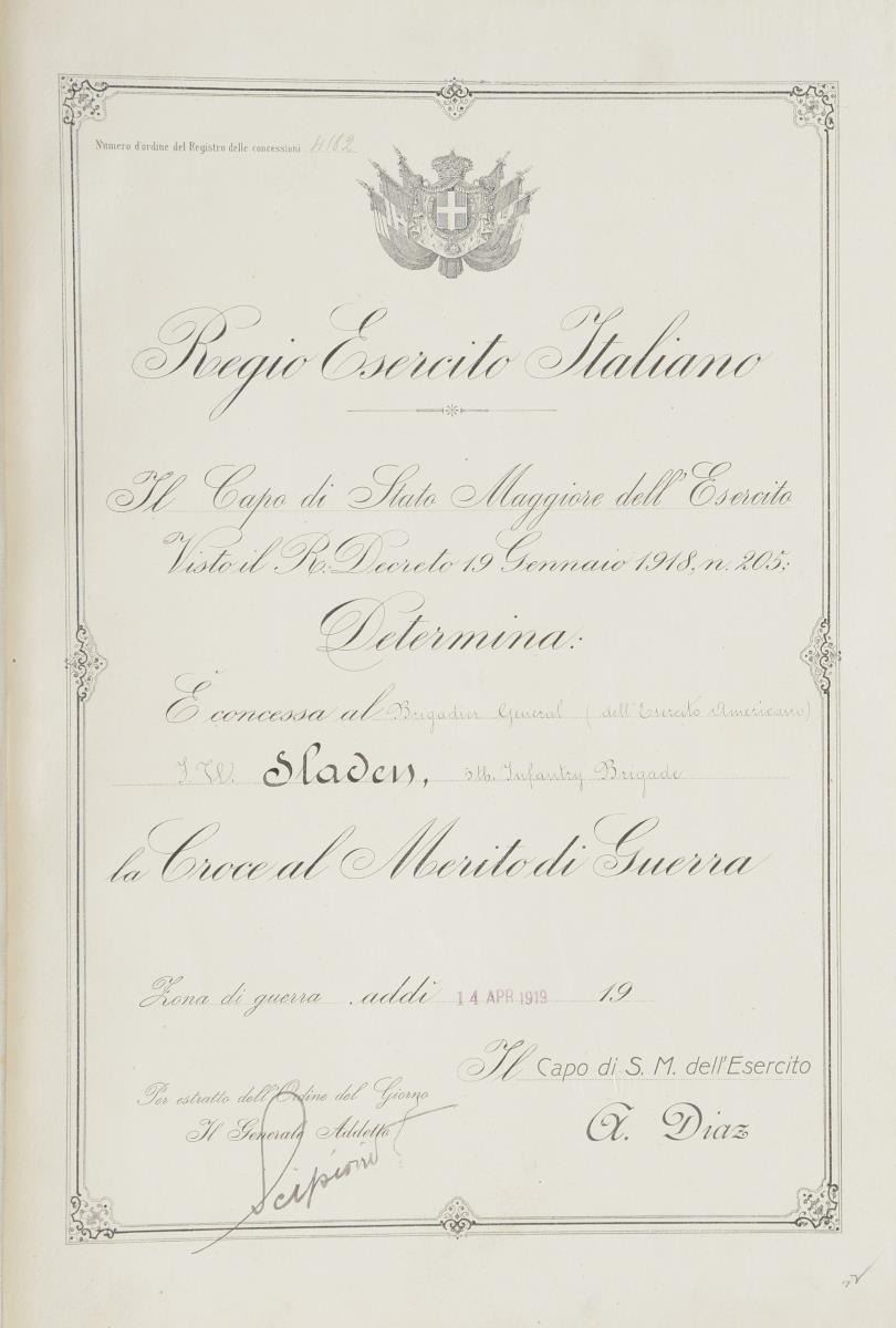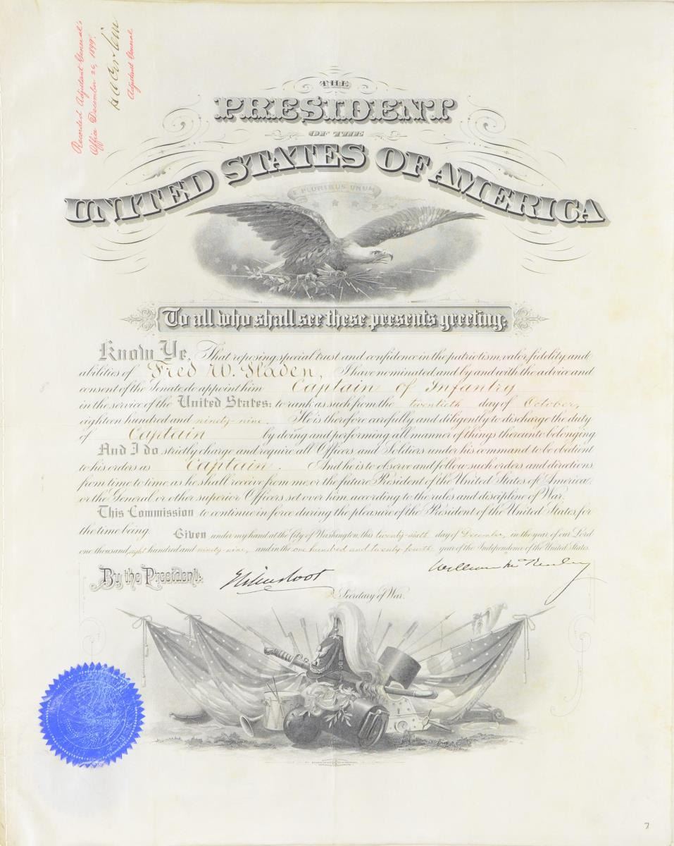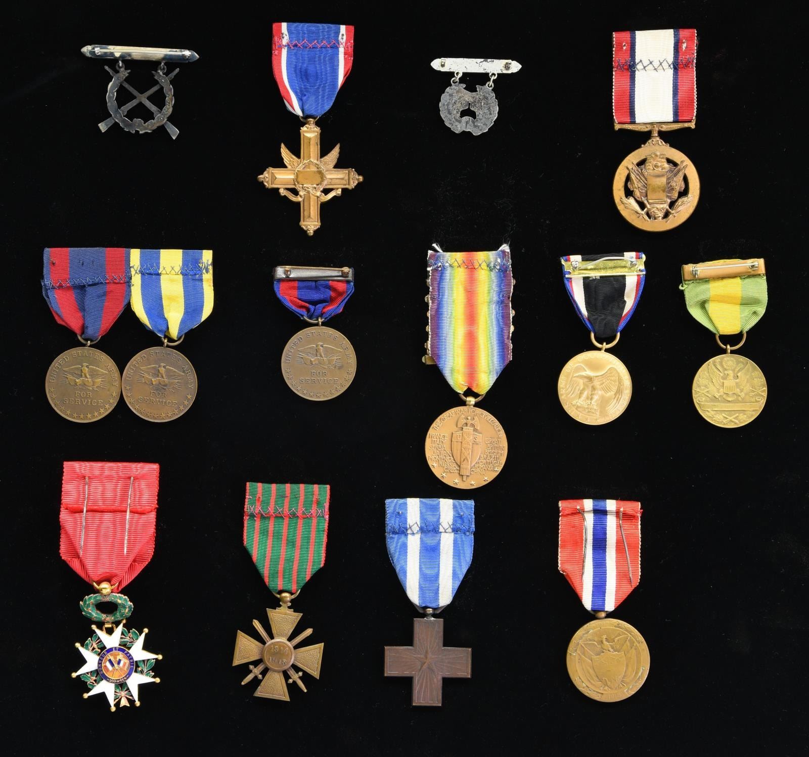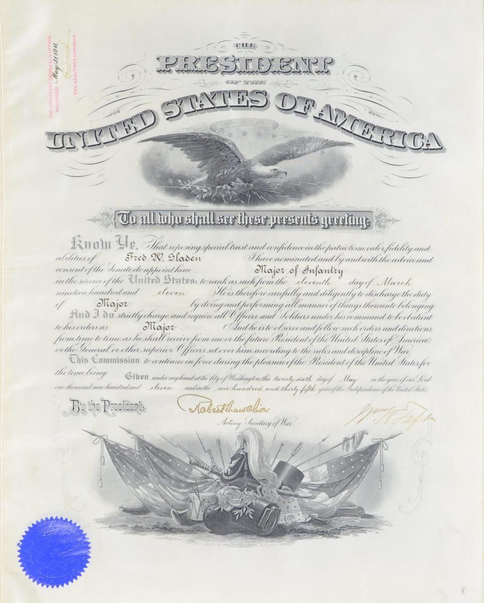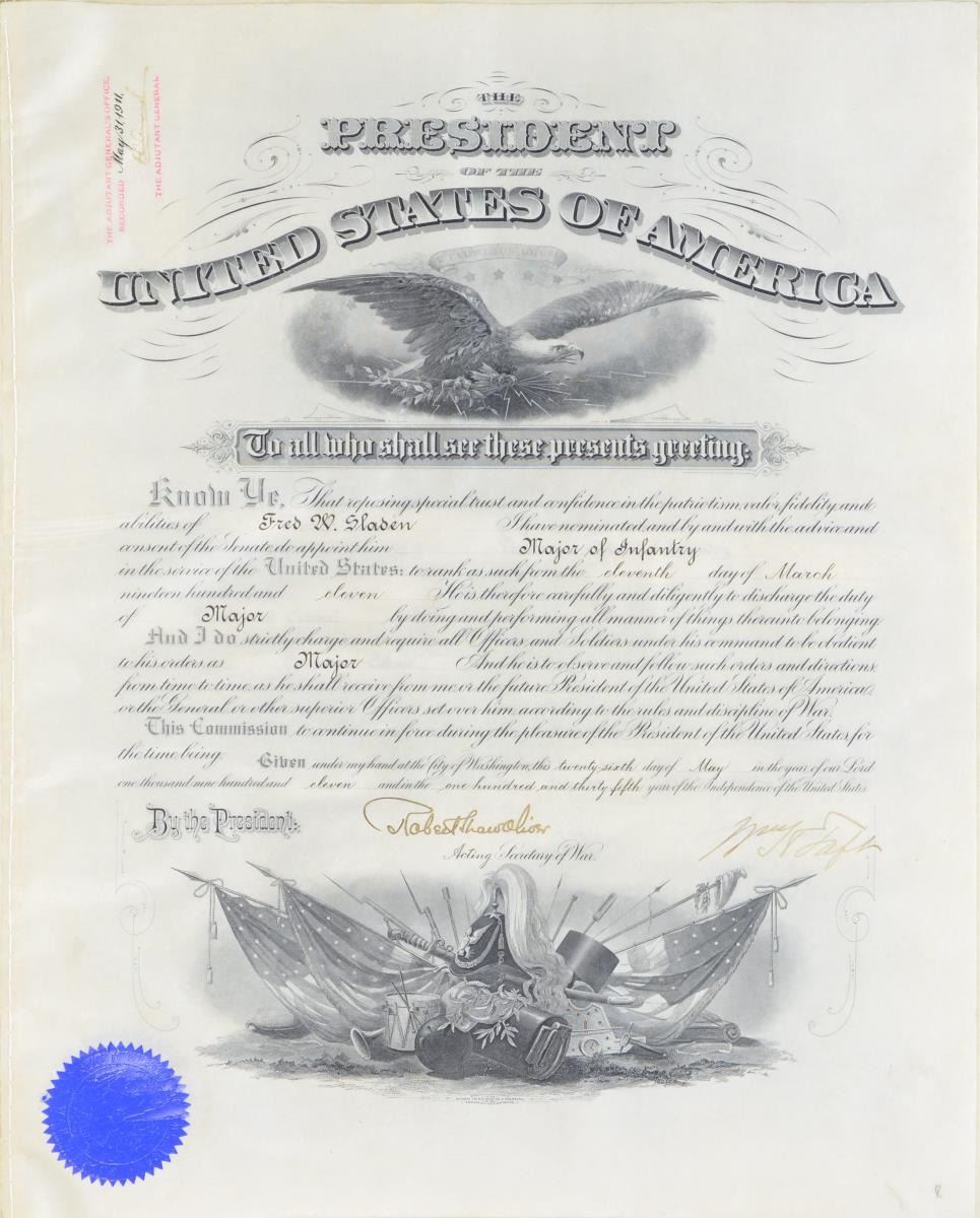 AWARD & MEDAL ARCHIVE. General Sladen was awarded most medals other than MOH for his service, medals include Distinguished Service Cross (# 2158), Distinguished Service Medal (# 257), French Legion of Honor, Croix de Guerre (2 palm leaves), Spanish American Campaign medal, Philippine Campaign (#71 & 22031), Mexican Border Campaign (#9772), WW1 Victory medal with 6 battle clasps, Italian War Cross, Panama War medal, & more. 8 medal boxes also included. 21x20" folio contains 31 bound and loose mostly velum commissions, appointments, awards, and certificates of merit including 10 presidential commissions, first as 2nd Lieutenant signed by Benjamin Harrison, 1st Lieutenant & Captain signed by William McKinley, Major's Commission signed by William Taft, Lieutenant Colonel & Colonel commissions signed by Woodrow Wilson, 2 Brigadier General commissions signed by Woodrow Wilson and by Warren Harding, his final Commission as Major General is signed by Calvin Coolidge in 1924. Other documents include Distinguished Service Medal (DSM) award document, 2 Distinguished Service Medal (DSC) award documents. Other World War 1 award documents include 2 Croix de Guerre, Legion D'Honneur, and L'Ordre de L'Armee. Also included are 3 WW1 photographic in country IDs. CONDITION: overall very good, most commissions have glued left edges where bound into folio. (02-17895-13/JS). $4,000-8,000.
