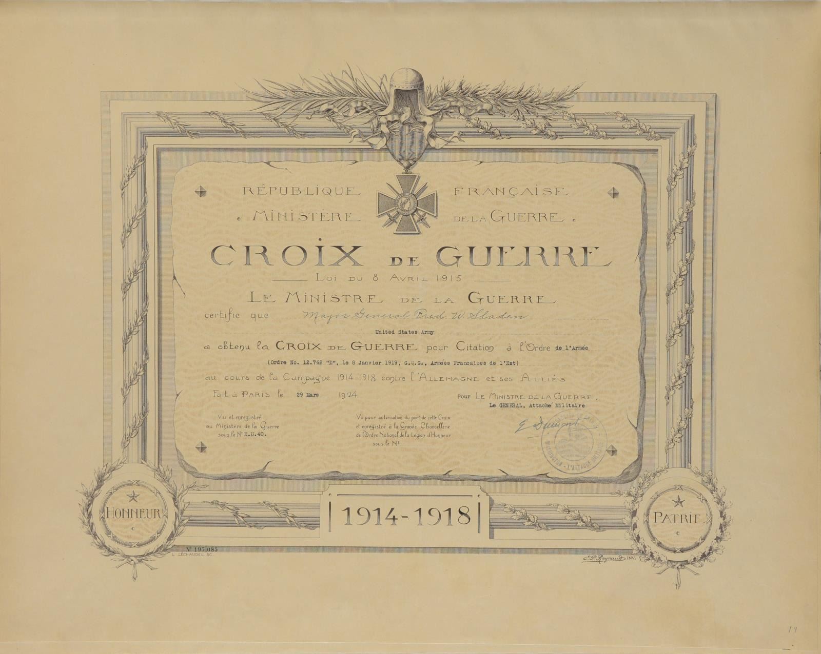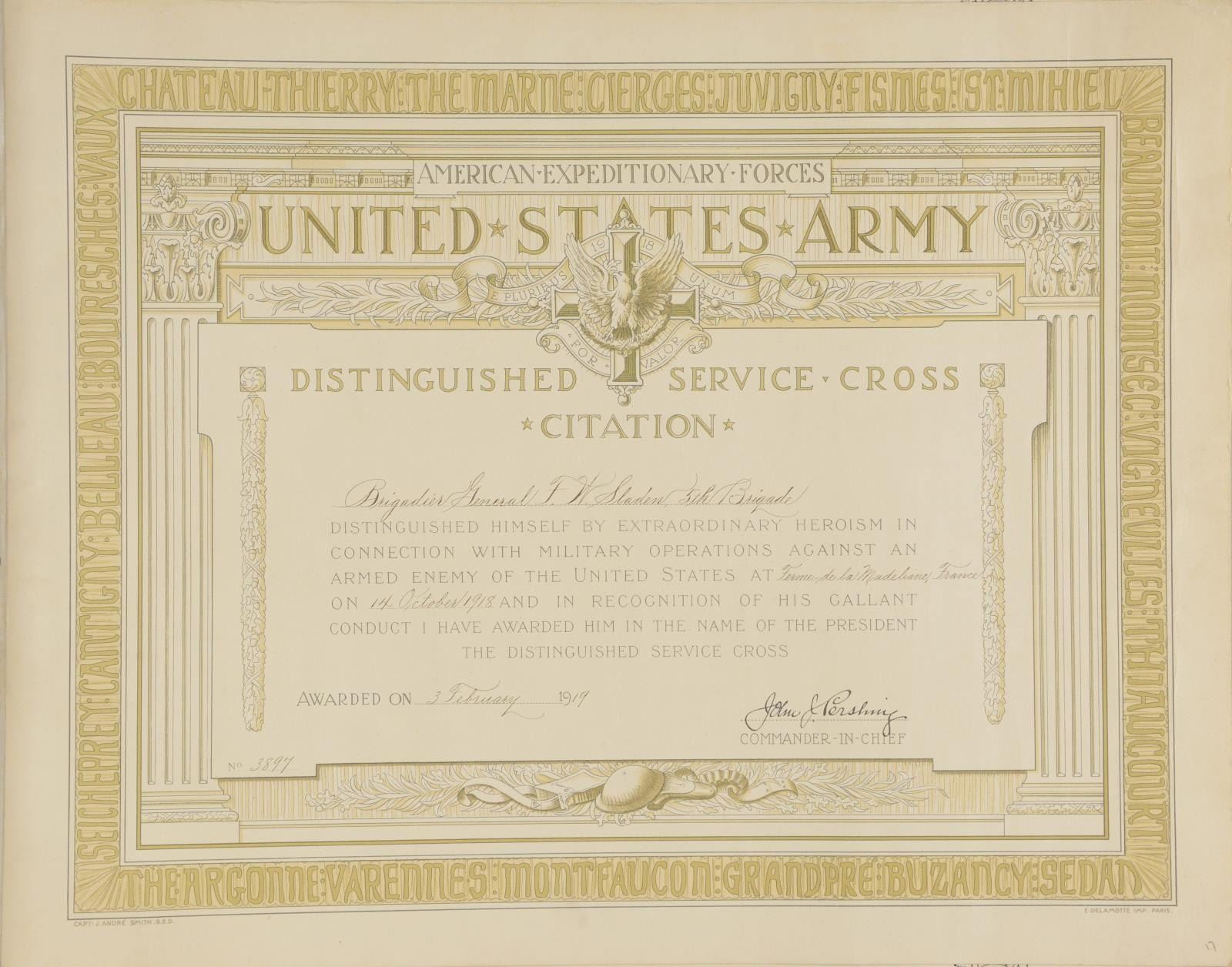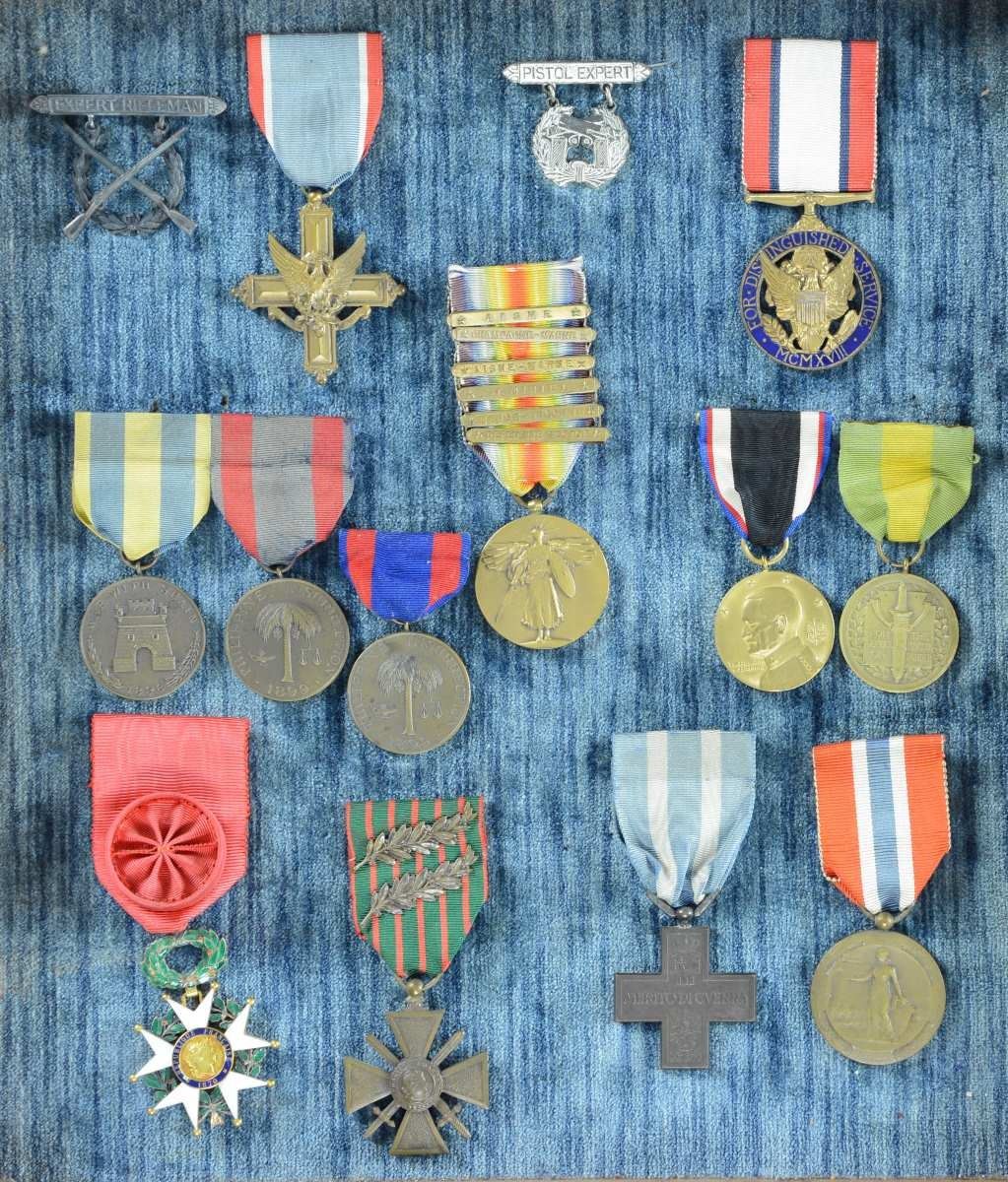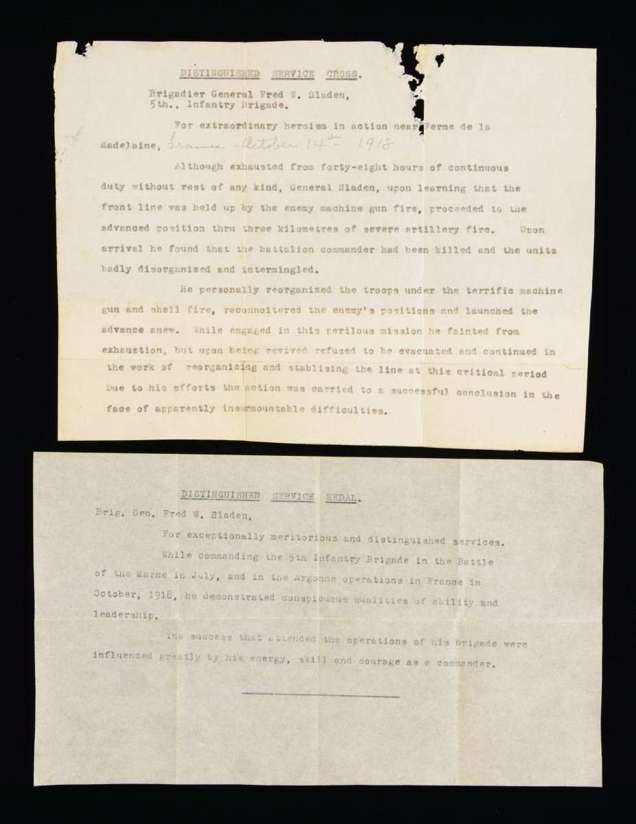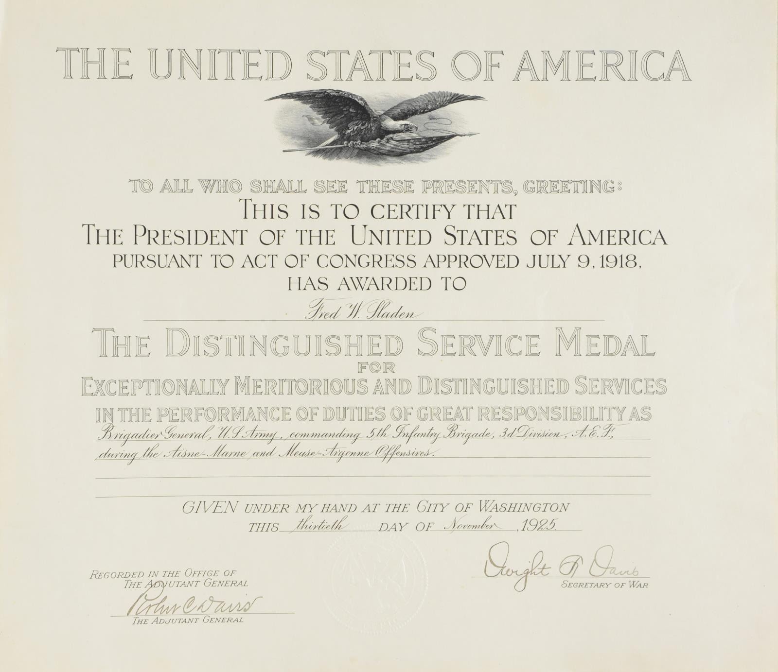 AWARD & MEDAL ARCHIVE. General Sladen was awarded most medals other than MOH for his service, medals include Distinguished Service Cross (# 2158), Distinguished Service Medal (# 257), French Legion of Honor, Croix de Guerre (2 palm leaves), Spanish American Campaign medal, Philippine Campaign (#71 & 22031), Mexican Border Campaign (#9772), WW1 Victory medal with 6 battle clasps, Italian War Cross, Panama War medal, & more. 8 medal boxes also included. 21x20" folio contains 31 bound and loose mostly velum commissions, appointments, awards, and certificates of merit including 10 presidential commissions, first as 2nd Lieutenant signed by Benjamin Harrison, 1st Lieutenant & Captain signed by William McKinley, Major's Commission signed by William Taft, Lieutenant Colonel & Colonel commissions signed by Woodrow Wilson, 2 Brigadier General commissions signed by Woodrow Wilson and by Warren Harding, his final Commission as Major General is signed by Calvin Coolidge in 1924. Other documents include Distinguished Service Medal (DSM) award document, 2 Distinguished Service Medal (DSC) award documents. Other World War 1 award documents include 2 Croix de Guerre, Legion D'Honneur, and L'Ordre de L'Armee. Also included are 3 WW1 photographic in country IDs. CONDITION: overall very good, most commissions have glued left edges where bound into folio. (02-17895-13/JS). $4,000-8,000.