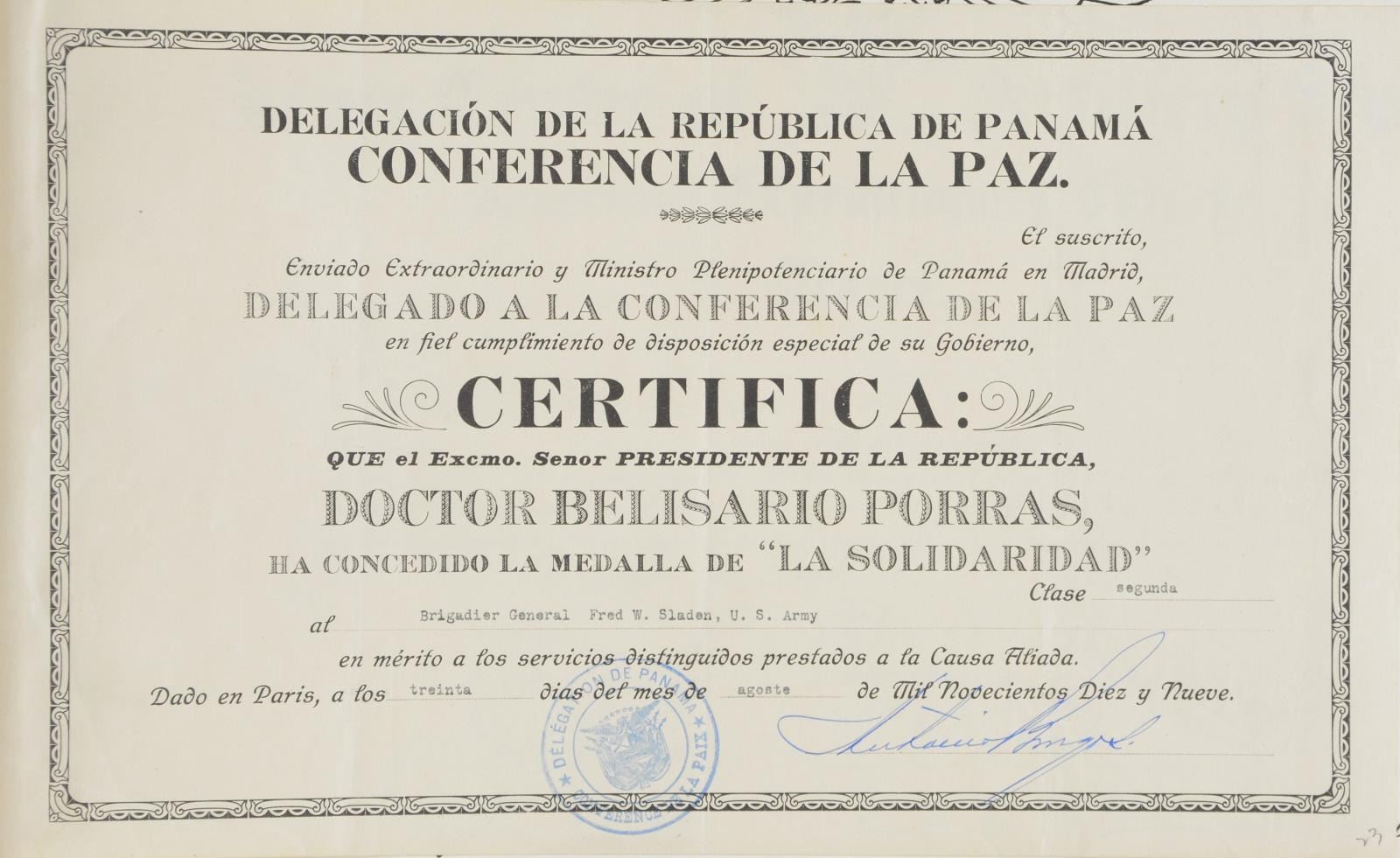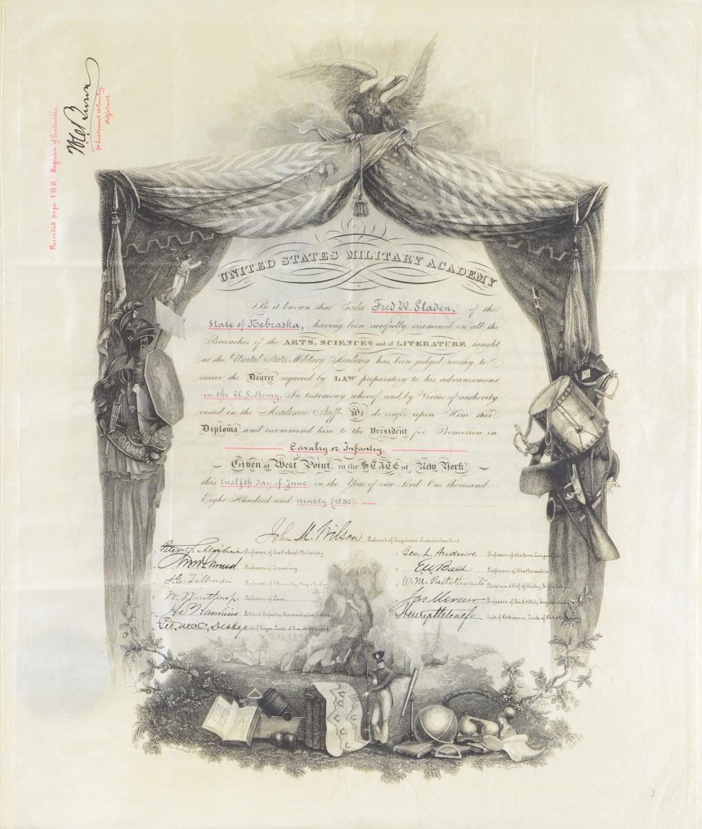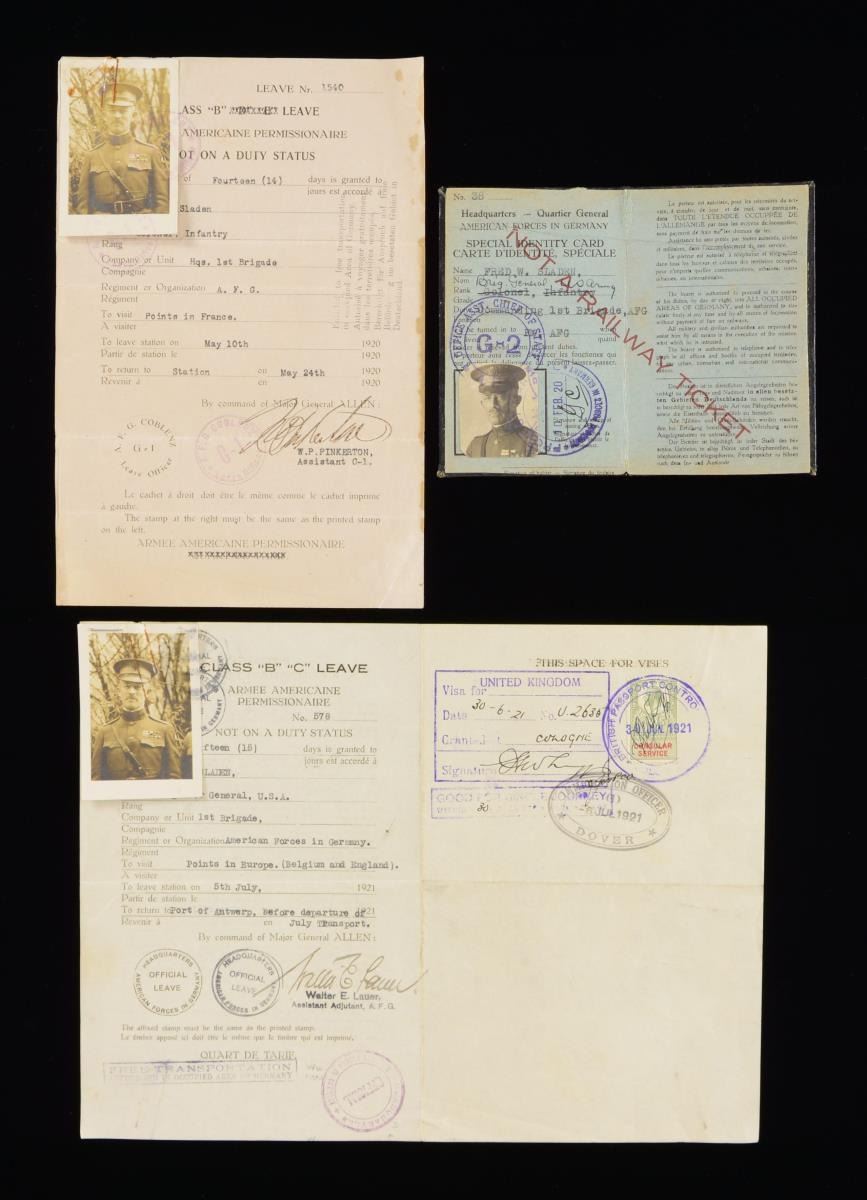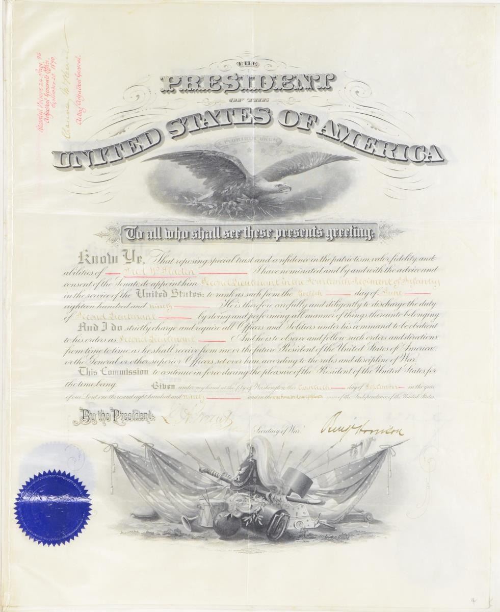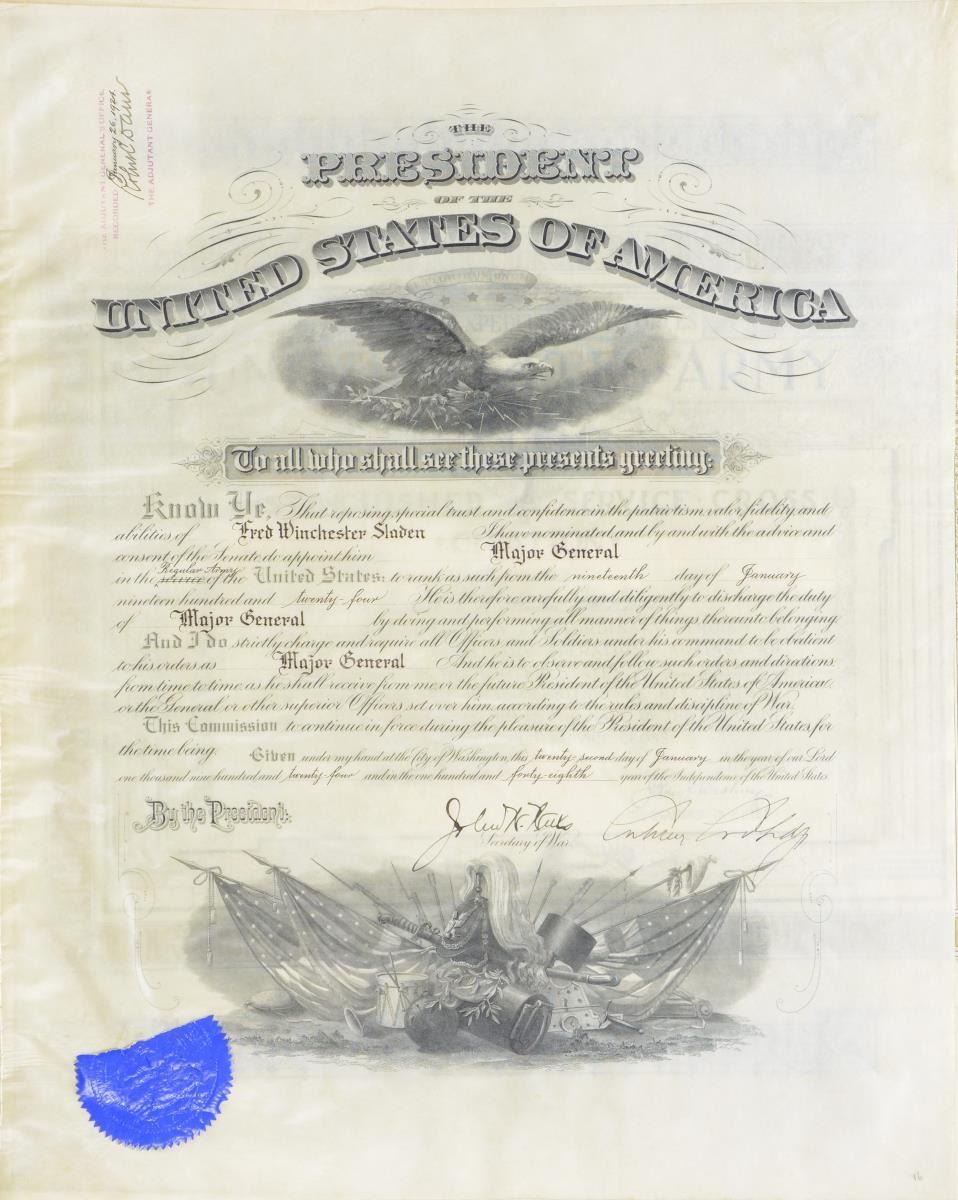 AWARD & MEDAL ARCHIVE. General Sladen was awarded most medals other than MOH for his service, medals include Distinguished Service Cross (# 2158), Distinguished Service Medal (# 257), French Legion of Honor, Croix de Guerre (2 palm leaves), Spanish American Campaign medal, Philippine Campaign (#71 & 22031), Mexican Border Campaign (#9772), WW1 Victory medal with 6 battle clasps, Italian War Cross, Panama War medal, & more. 8 medal boxes also included. 21x20" folio contains 31 bound and loose mostly velum commissions, appointments, awards, and certificates of merit including 10 presidential commissions, first as 2nd Lieutenant signed by Benjamin Harrison, 1st Lieutenant & Captain signed by William McKinley, Major's Commission signed by William Taft, Lieutenant Colonel & Colonel commissions signed by Woodrow Wilson, 2 Brigadier General commissions signed by Woodrow Wilson and by Warren Harding, his final Commission as Major General is signed by Calvin Coolidge in 1924. Other documents include Distinguished Service Medal (DSM) award document, 2 Distinguished Service Medal (DSC) award documents. Other World War 1 award documents include 2 Croix de Guerre, Legion D'Honneur, and L'Ordre de L'Armee. Also included are 3 WW1 photographic in country IDs. CONDITION: overall very good, most commissions have glued left edges where bound into folio. (02-17895-13/JS). $4,000-8,000.