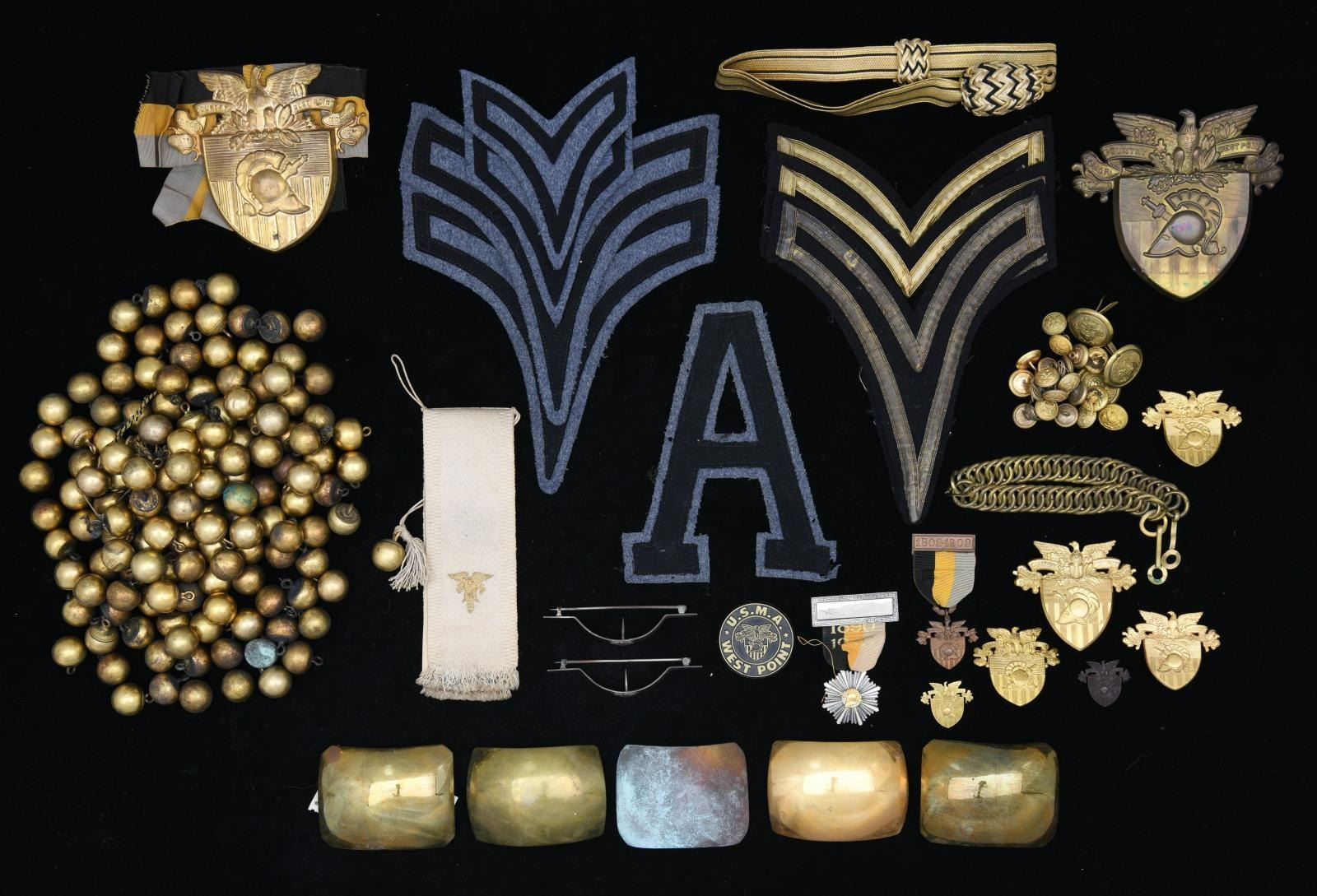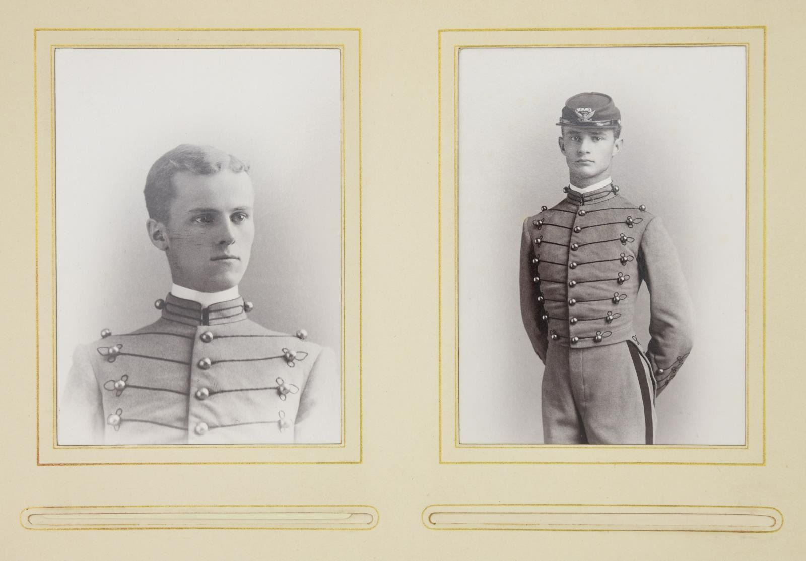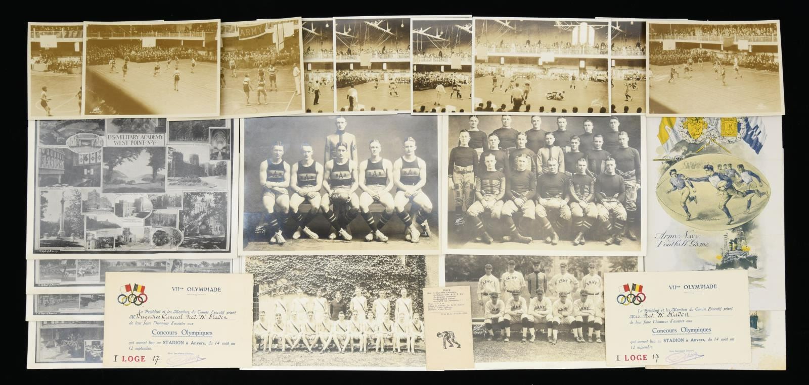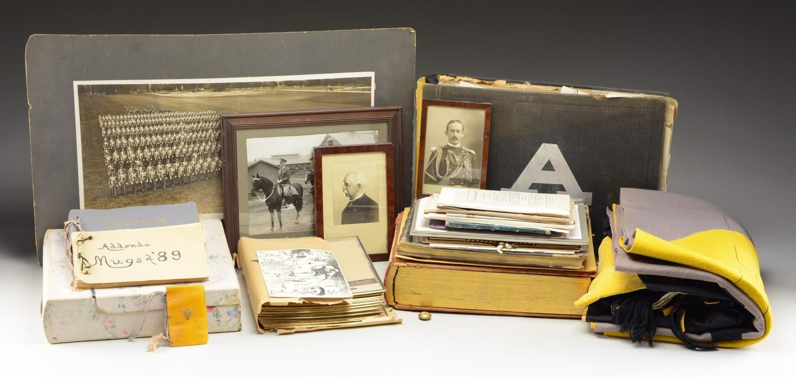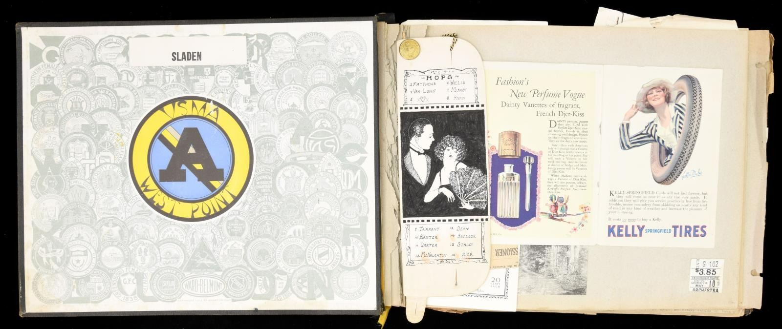 MAJOR GENERAL FRED WINCHESTER SLADEN & BRIGADIER GENERAL FRED WINCHESTER SLADEN, JR. 1887-1949. Archive contains materials from Major General Fred Winchester Sladen's days as cadet 1887-1890 as instructor 1900-1904, commandant of cadets 1907-1911, Superintendent and Commandant USMA 1922-1926. Brigadier General Fred Winchester Sladen, Jr was cadet class of 1929 and later an instructor. Both father and son returned to the Academy for reunions and all their memorabilia retained is here: 1) 1890 USMA Year Book with inset Pach Brothers cabinet cards of class and instructors, views of West Point, Sladen's graduation class, spine of album missing. 2) 25 10x8" Pach Brothers photographs of cadets on parade and then outdoor groups, 1889. 3) "Mugs of 1889" 40th reunion June 11, 1929 shows cadet photographs on the left side of page and photograph in 1929 with addendum published at the 45th anniversary of the class in 1934 with the biography of each cadet. 4) many pamphlets from West Point dated in the 1880s till 1930s. 5) leather bound "Views of West Point" signed inside by cadet Fred Sladen 1889. 6) large group of USMA buttons, chevrons, & metal insignia. 7) Two 44x21" ARMY banners, ARMY pennant, and 6' wool scarf from West Point Exchange. 8) 30x30" linen handkerchief with silk embroidered names of USMA grads, and others, 1890s. 9) 1913 and 1915 Army-Navy football game dinner programs at Hotel Astor. 10) 8x10" photographs of 1914 Army football team, 1929 Army basketball team, Army baseball team, and several 4x6" photographs of Army-Navy basketball games. 11) Major Sylvanus Thayer letter to his wife, 1820. Thayer was known as "Father of West Point". Letter is in very poor condition, cracked and broken at folds & chipped, missing pieces of paper. 12) large USMA scrapbook of Fred Sladen, Jr who graduated in 1929, filled with photographs and clippings, football tickets, telegrams, postcards, add more. 13) Large format photo of 1912 class on parade. 26x16" board, image 20x10". 14) small pendant made like USMA CADET button with Fred's photo in uniform. This lot should be viewed as to its very large size and depth of content. CONDITION: good-very good overall, with some condition issues noted. (02-17895-16/JS) $1,000-2,000.