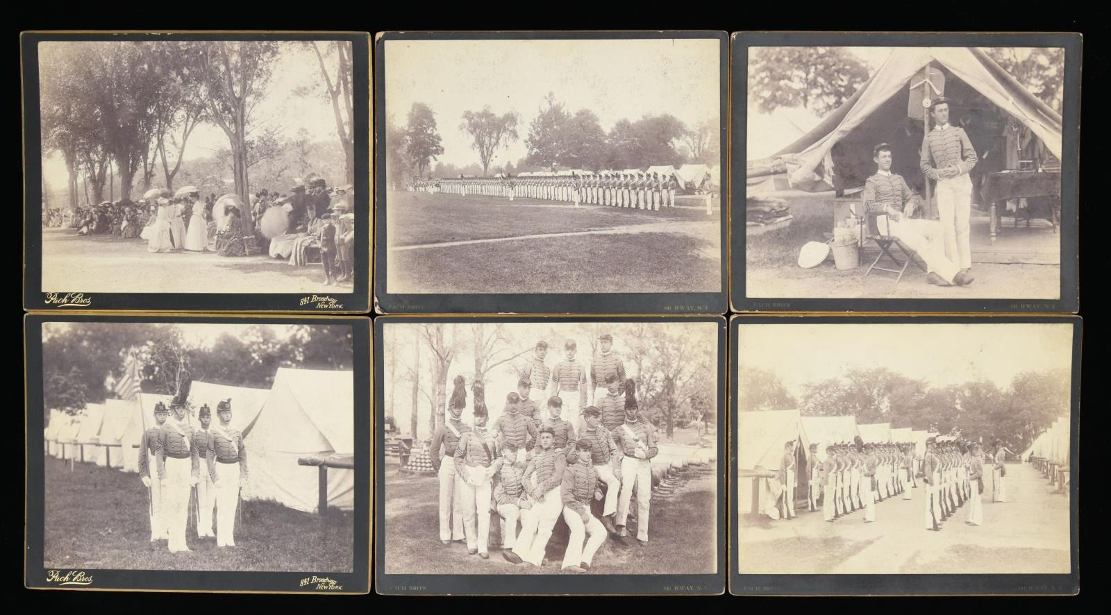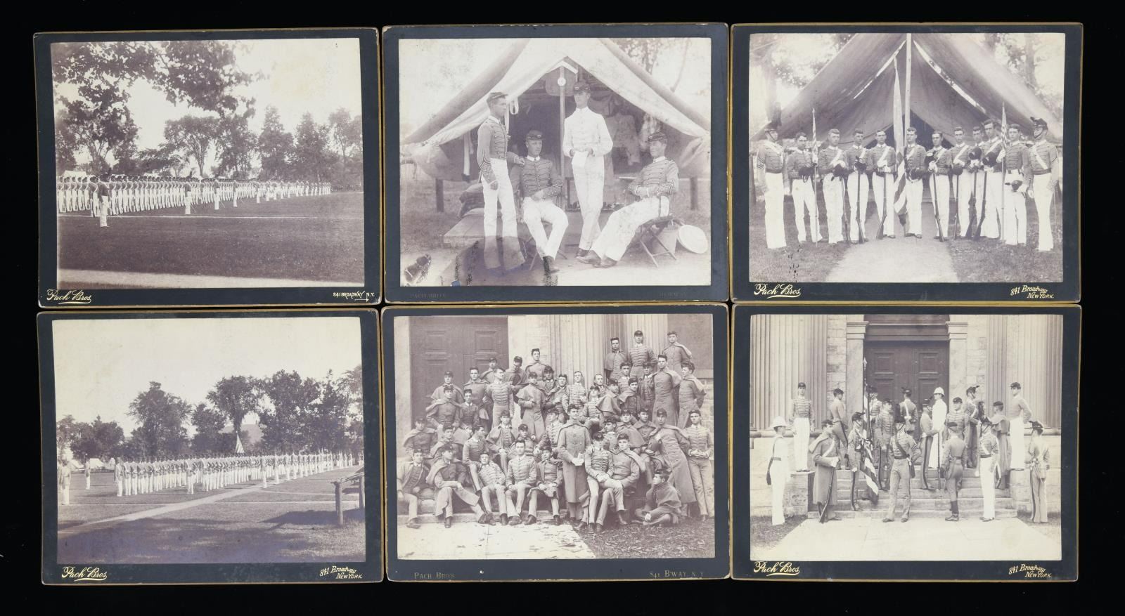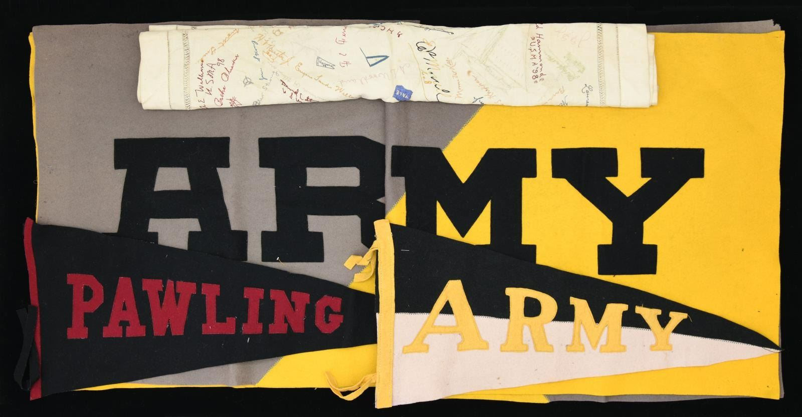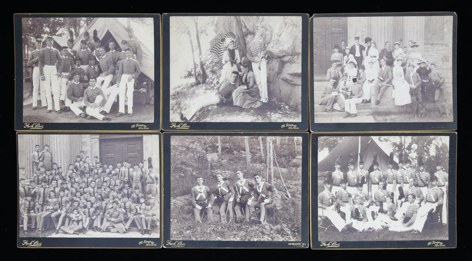 MAJOR GENERAL FRED WINCHESTER SLADEN & BRIGADIER GENERAL FRED WINCHESTER SLADEN, JR. 1887-1949. Archive contains materials from Major General Fred Winchester Sladen's days as cadet 1887-1890 as instructor 1900-1904, commandant of cadets 1907-1911, Superintendent and Commandant USMA 1922-1926. Brigadier General Fred Winchester Sladen, Jr was cadet class of 1929 and later an instructor. Both father and son returned to the Academy for reunions and all their memorabilia retained is here: 1) 1890 USMA Year Book with inset Pach Brothers cabinet cards of class and instructors, views of West Point, Sladen's graduation class, spine of album missing. 2) 25 10x8" Pach Brothers photographs of cadets on parade and then outdoor groups, 1889. 3) "Mugs of 1889" 40th reunion June 11, 1929 shows cadet photographs on the left side of page and photograph in 1929 with addendum published at the 45th anniversary of the class in 1934 with the biography of each cadet. 4) many pamphlets from West Point dated in the 1880s till 1930s. 5) leather bound "Views of West Point" signed inside by cadet Fred Sladen 1889. 6) large group of USMA buttons, chevrons, & metal insignia. 7) Two 44x21" ARMY banners, ARMY pennant, and 6' wool scarf from West Point Exchange. 8) 30x30" linen handkerchief with silk embroidered names of USMA grads, and others, 1890s. 9) 1913 and 1915 Army-Navy football game dinner programs at Hotel Astor. 10) 8x10" photographs of 1914 Army football team, 1929 Army basketball team, Army baseball team, and several 4x6" photographs of Army-Navy basketball games. 11) Major Sylvanus Thayer letter to his wife, 1820. Thayer was known as "Father of West Point". Letter is in very poor condition, cracked and broken at folds & chipped, missing pieces of paper. 12) large USMA scrapbook of Fred Sladen, Jr who graduated in 1929, filled with photographs and clippings, football tickets, telegrams, postcards, add more. 13) Large format photo of 1912 class on parade. 26x16" board, image 20x10". 14) small pendant made like USMA CADET button with Fred's photo in uniform. This lot should be viewed as to its very large size and depth of content. CONDITION: good-very good overall, with some condition issues noted. (02-17895-16/JS) $1,000-2,000.
