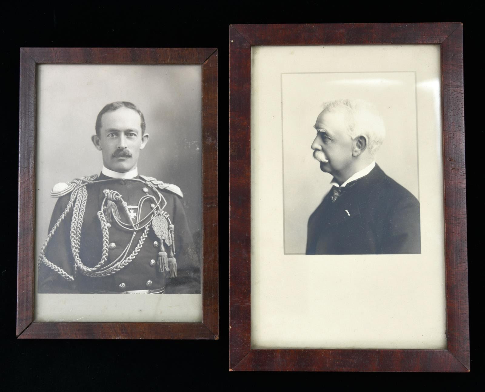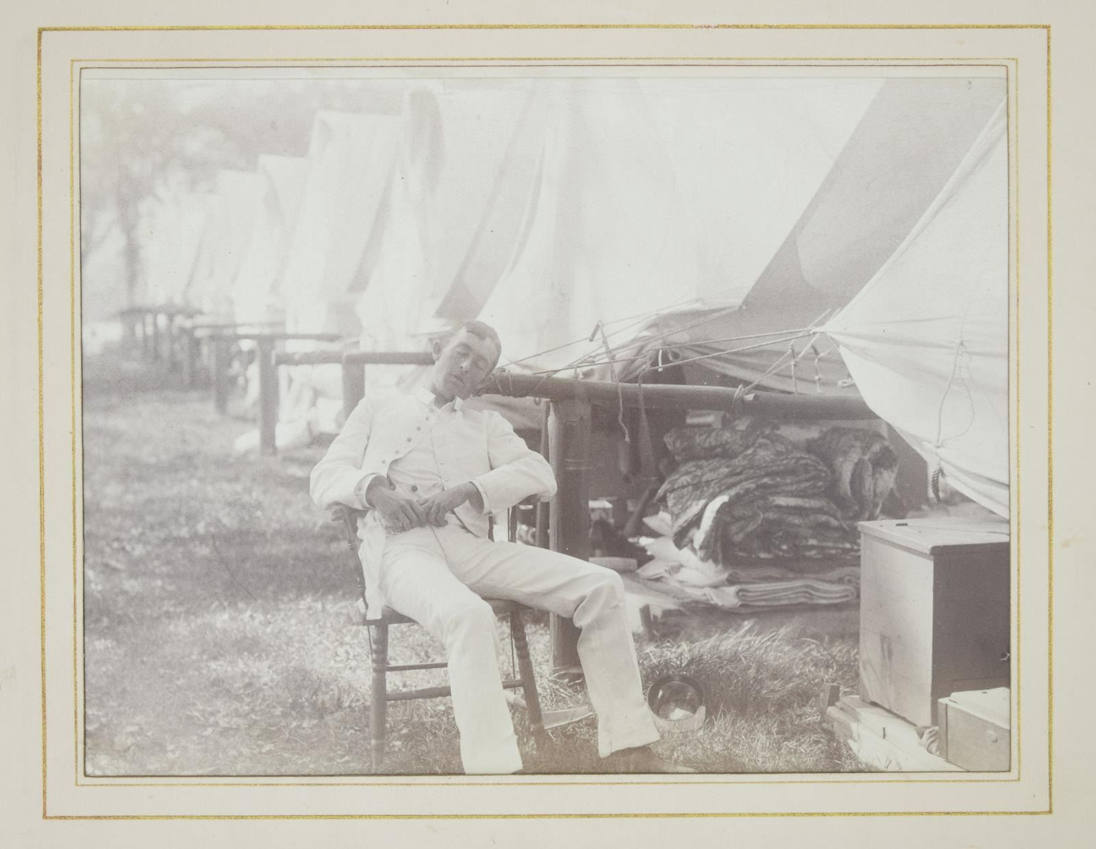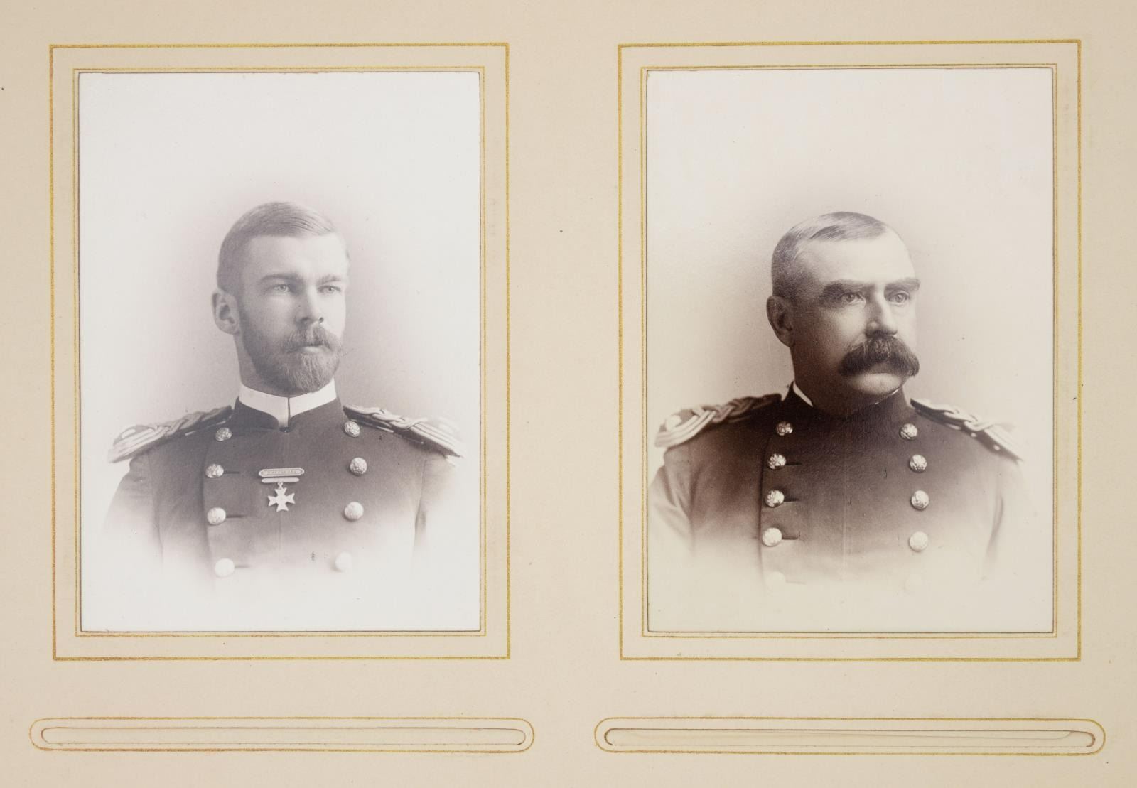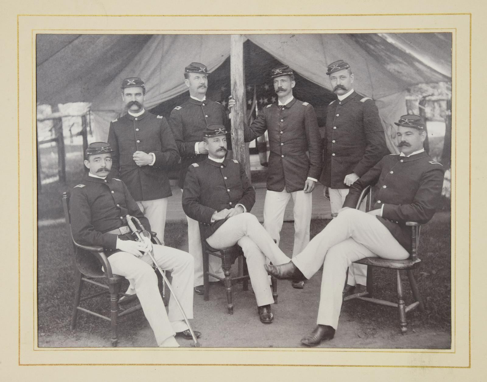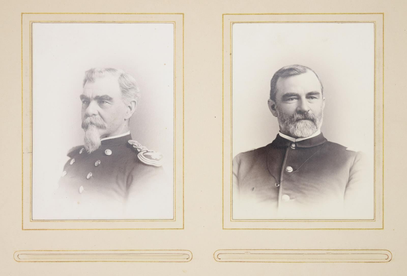 MAJOR GENERAL FRED WINCHESTER SLADEN & BRIGADIER GENERAL FRED WINCHESTER SLADEN, JR. 1887-1949. Archive contains materials from Major General Fred Winchester Sladen's days as cadet 1887-1890 as instructor 1900-1904, commandant of cadets 1907-1911, Superintendent and Commandant USMA 1922-1926. Brigadier General Fred Winchester Sladen, Jr was cadet class of 1929 and later an instructor. Both father and son returned to the Academy for reunions and all their memorabilia retained is here: 1) 1890 USMA Year Book with inset Pach Brothers cabinet cards of class and instructors, views of West Point, Sladen's graduation class, spine of album missing. 2) 25 10x8" Pach Brothers photographs of cadets on parade and then outdoor groups, 1889. 3) "Mugs of 1889" 40th reunion June 11, 1929 shows cadet photographs on the left side of page and photograph in 1929 with addendum published at the 45th anniversary of the class in 1934 with the biography of each cadet. 4) many pamphlets from West Point dated in the 1880s till 1930s. 5) leather bound "Views of West Point" signed inside by cadet Fred Sladen 1889. 6) large group of USMA buttons, chevrons, & metal insignia. 7) Two 44x21" ARMY banners, ARMY pennant, and 6' wool scarf from West Point Exchange. 8) 30x30" linen handkerchief with silk embroidered names of USMA grads, and others, 1890s. 9) 1913 and 1915 Army-Navy football game dinner programs at Hotel Astor. 10) 8x10" photographs of 1914 Army football team, 1929 Army basketball team, Army baseball team, and several 4x6" photographs of Army-Navy basketball games. 11) Major Sylvanus Thayer letter to his wife, 1820. Thayer was known as "Father of West Point". Letter is in very poor condition, cracked and broken at folds & chipped, missing pieces of paper. 12) large USMA scrapbook of Fred Sladen, Jr who graduated in 1929, filled with photographs and clippings, football tickets, telegrams, postcards, add more. 13) Large format photo of 1912 class on parade. 26x16" board, image 20x10". 14) small pendant made like USMA CADET button with Fred's photo in uniform. This lot should be viewed as to its very large size and depth of content. CONDITION: good-very good overall, with some condition issues noted. (02-17895-16/JS) $1,000-2,000.