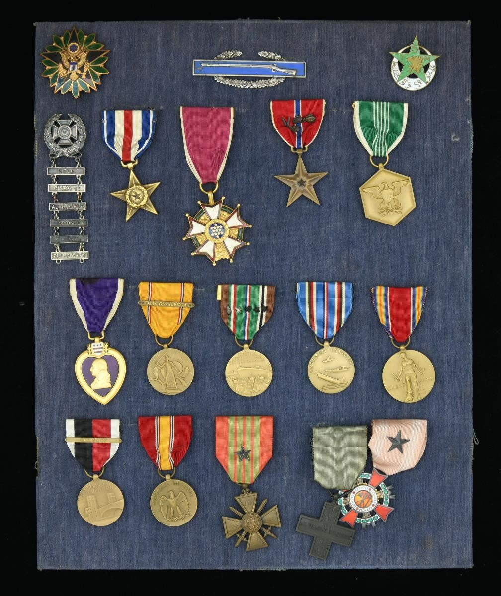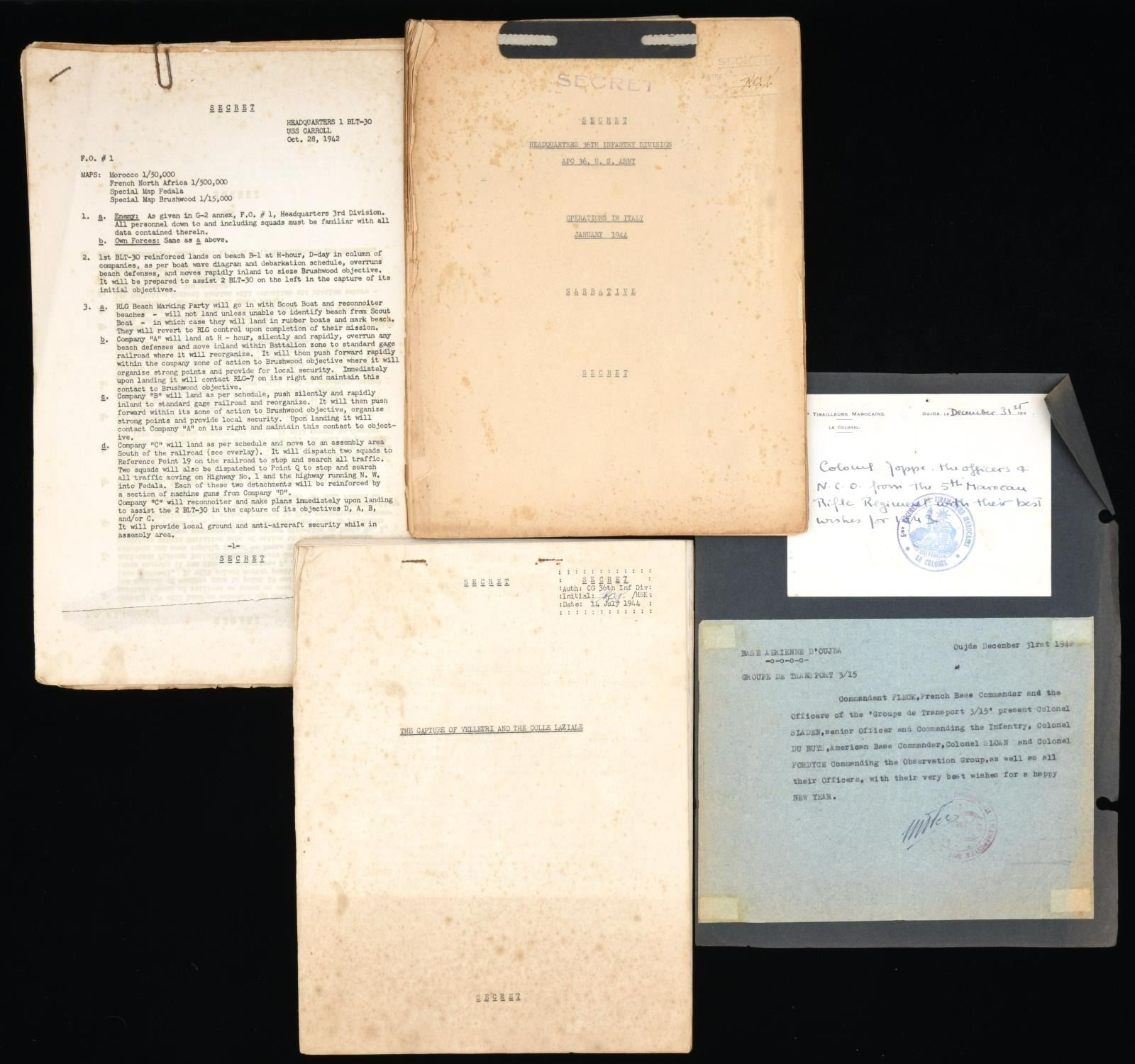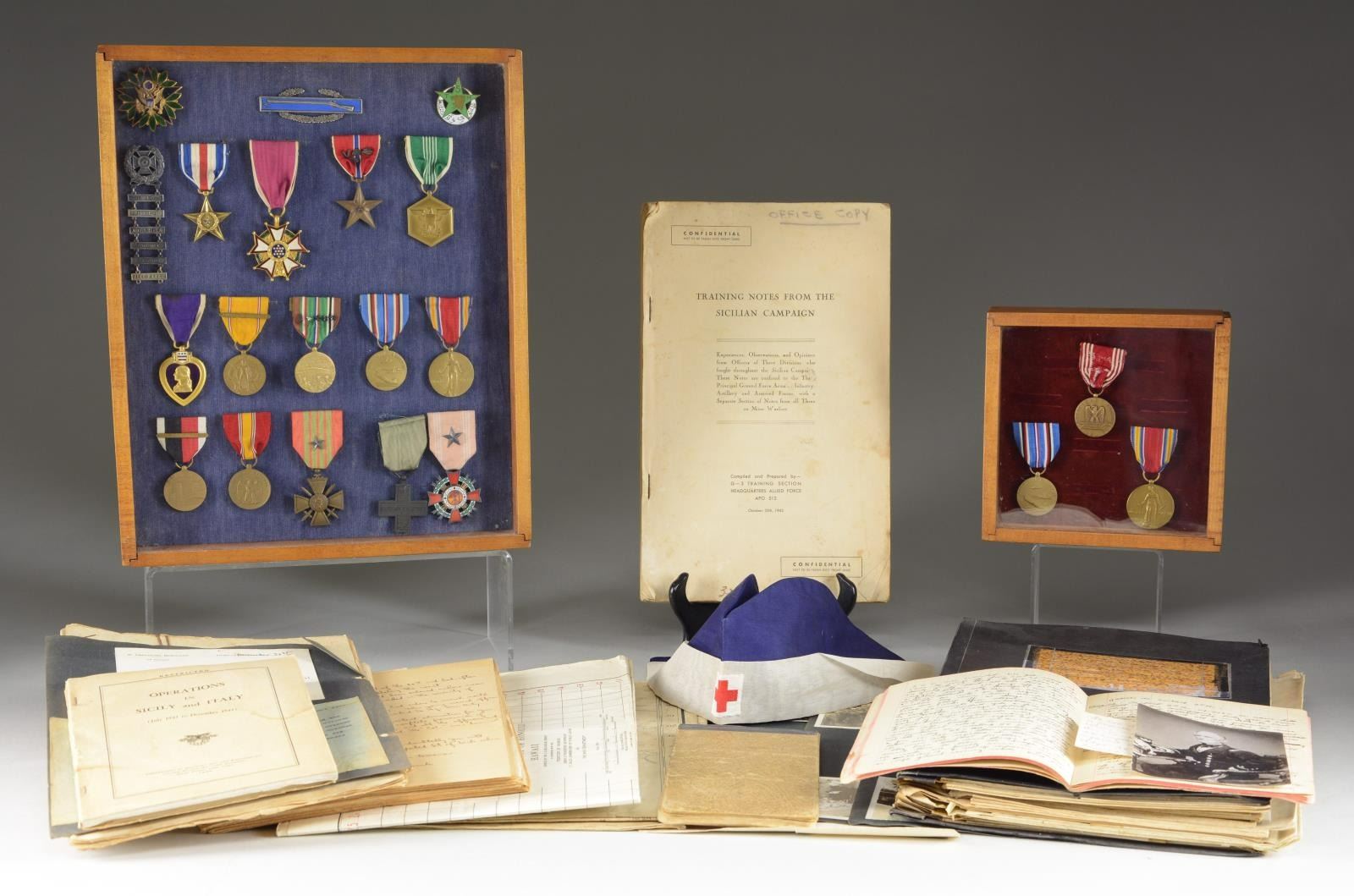MEDALS & ARCHIVE. Brigadier General Fred Sladen, Jr. (1906-1980) Fred "Jim" W. Sladen Jr was captain in 36th regiment Infantry during WW2. He participated in five of the six major amphibious landings in Africa, France, and Italy. He served as Commanding Officer, 1st Battalion, 36th Regiment during North African landing at Fedala, Morocco and was instrumental in the success of the 36th Division landing in Southern France, later landing at Messina, Sicily, then as Executive Officer of the regiment from Salerno to Anzio. His French language skills resulted in his assignment as Chief of the Allied Liaison Section with the 2d French Moroccan Division in December 1943. He was selected as G3, 36th Infantry Division, from March to November 1944. His medals & awards are framed. Purple Heart (#204601) Army Commendation Medal, inscribed "Fred W. Sladen, Jr" Ribbon French Croix de Guerre with star Italian Cruce de Valore American Defense Medal with "FOREIGN SERVICE" clasp EUROPEAN, AFRICAN, MIDDLE EASTERN campaign medal with silver star, 3 bronze stars, and arrowhead American Campaign Medal World War 2 Victory Medal Occupation Medal with GERMANY clasp American Defense medal Order of Military Merit (South Korea) WW2 archive includes November 8, 1942 to April 10, 1943 day by day diary of North African invasion & March 18-November 26, 1944 day by day diary of Italian campaign, 20 maps of North Africa, Italy, & France he used, some annotated. There are several "SECRET" and "RESTRICTED" documents 1942-1944 concerning operations he participated in. Also included in this lot are his sister Elizabeth M. Sladen's framed WW2 medals, WW2 Victory medal, American Campaign Medal, and Good Conduct Medal along with her nurse's cap. CONDITION: good to very good overall, some documents and maps have reductions & staining as expected from field use. (02-17895-20/JS). $2,000-3,000.