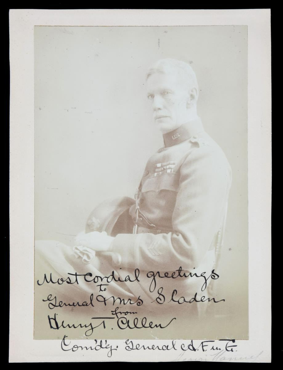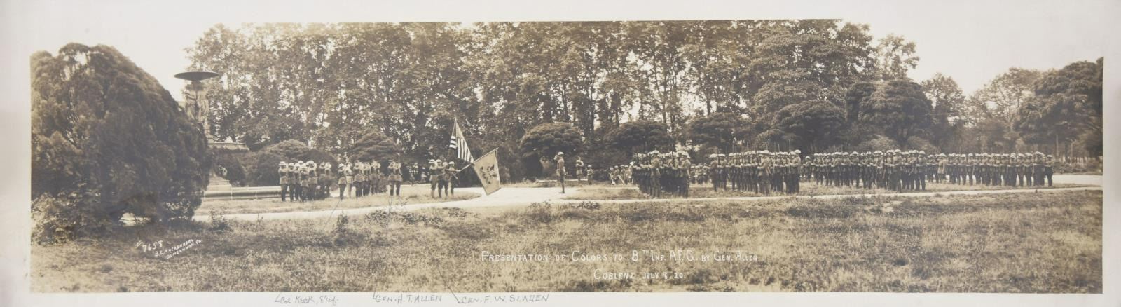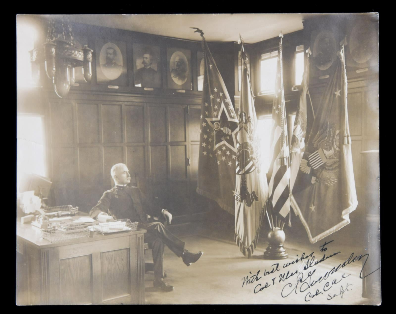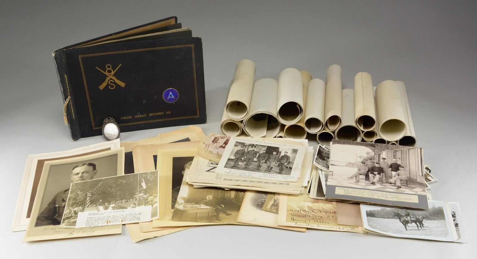 PHOTOS, SOME SIGNED & PANORAMIC WW1 ERA MILITARY PHOTOS. Fred Sladen loved his photos as there are at least 50 of him in previous lots. This lot has 17 rolled 8" to 12" wide that roll open to as much as 1-2 feet. Most are Coblenz Germany during Sladen's German occupation time as general of 8th US Infantry. The there is a presentation album given Sladen in Germany 1921. Lot has about 100 photos total, most WW1, and a few Span-Am, San Francisco 1895, and more. CONDITION: good to very good overall, some of the rolled images have cracks. (02-17895-23/JS). $500-1,000
