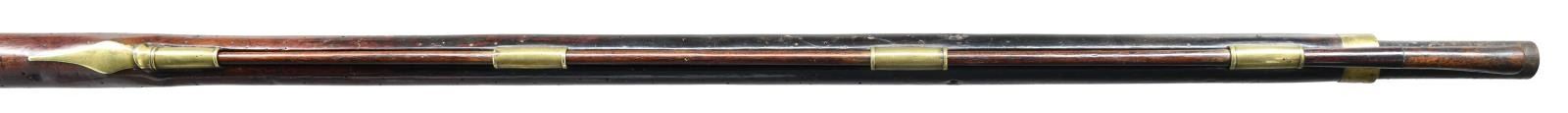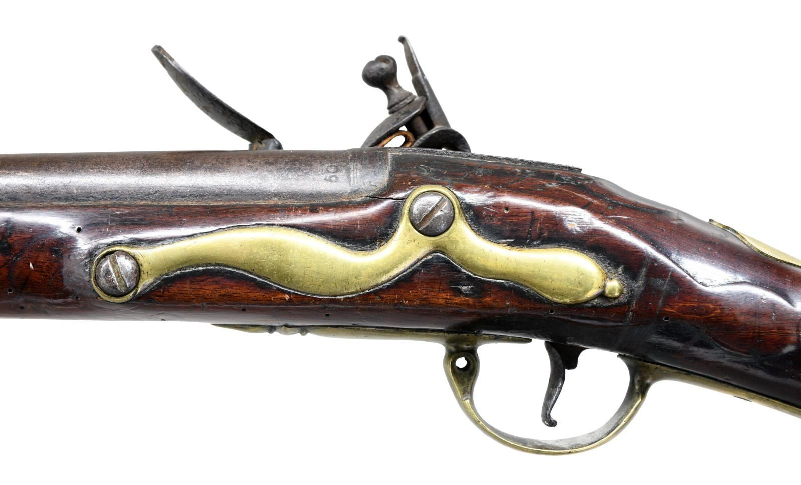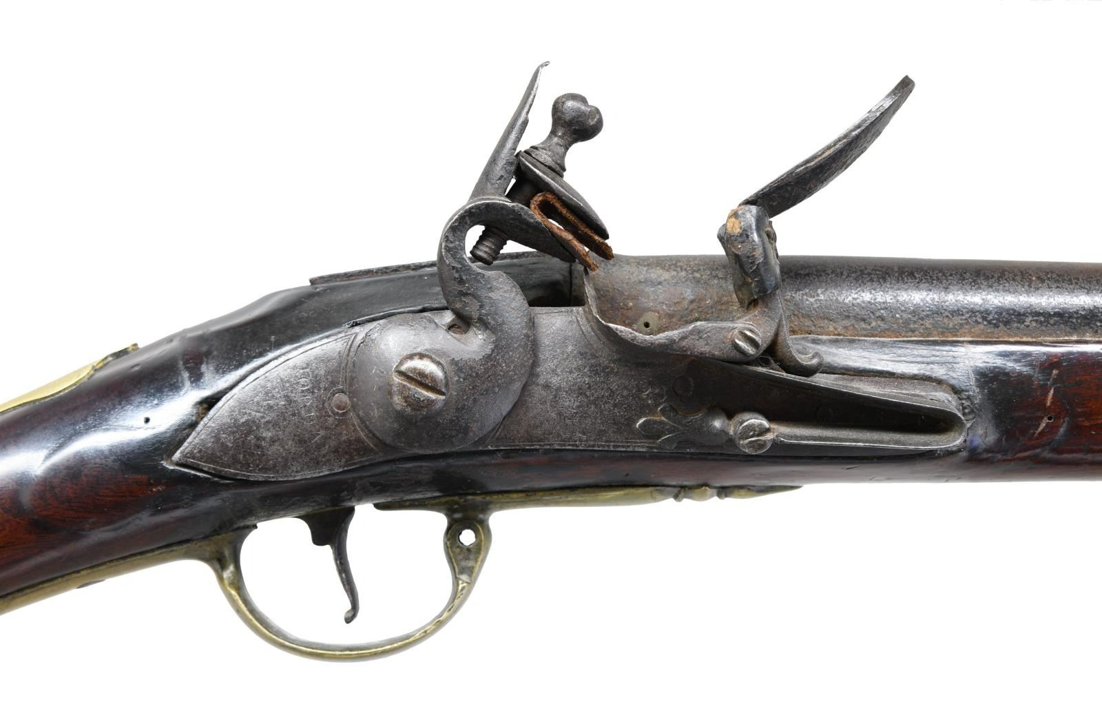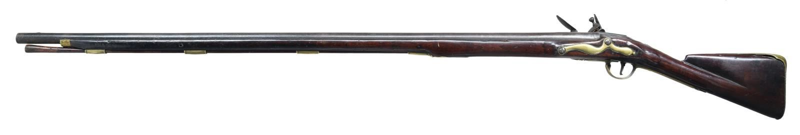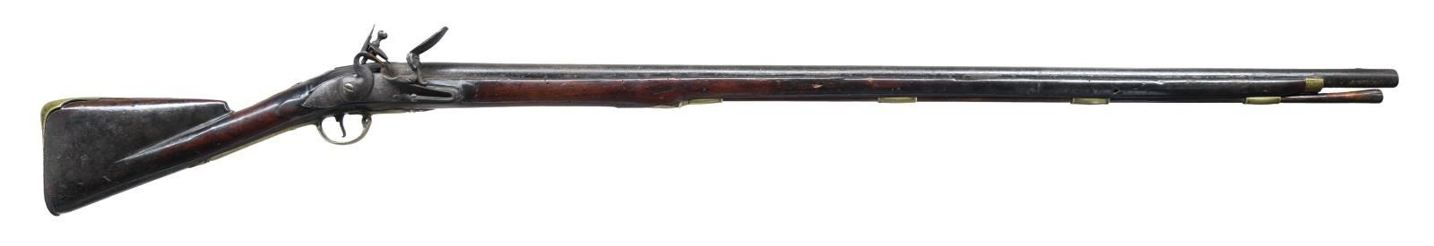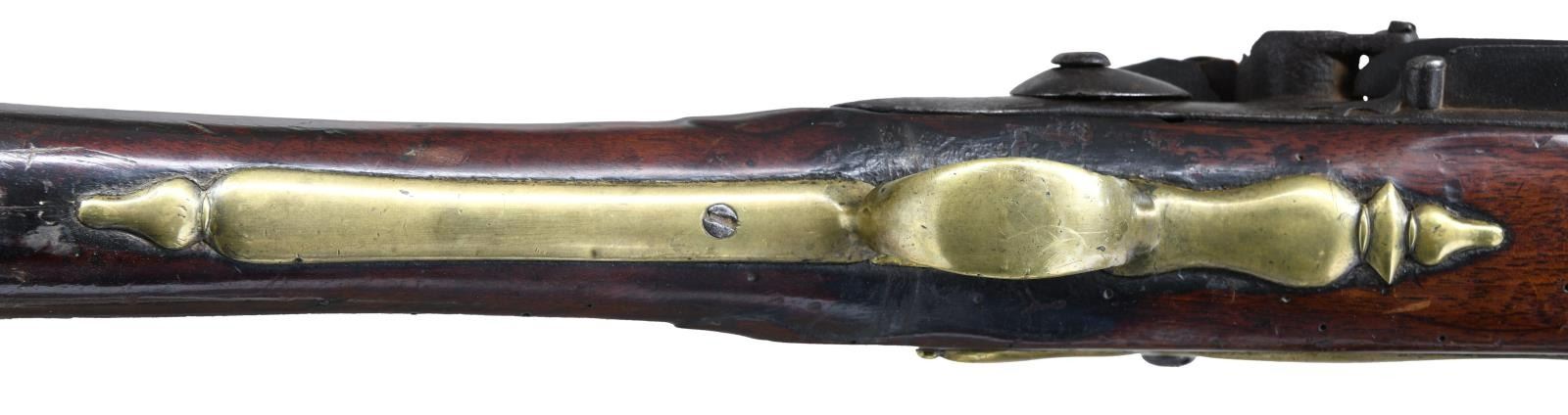 BY EDWARD JORDAN IN ATTIC CONDITION. Cal. 76. NSN. Bbl. 45 3/4". Barrel has a worn cross-keys proof on the top indicating Birmingham manufacture. The number "50" is stamped on the left side of the bolster, probably indicating a rack number. There are vestiges of other proofs on the barrel that are illegible due to wear. The lock markings are quite worn but are still visible. There is a crowned "GR" in front of the cock and a crowned broad arrow under the pan. Behind the cock, it is clearly marked "JORDAN 17(34)". Brass trigger guard showing the earliest style finial at the front of the guard. The brass butt plate is quite long extending 6" from the end of the butt up the stock. The brass escutcheon plate at the wrist has engraved unit markings that are worn and no longer legible. Correct 1st model brass side plate, ramrod thimbles, and entry thimble. Wooden ramrod appears to be original to the gun. Fine, heavy, full-length stock with worn carving behind the barrel tang and behind the lock. CONDITION: barrel has a dark, ancient patina but has no damage or imperfections. The touchhole has been re-bushed. The lock shows wear but all markings are visible. The frizzen has been relined in the period and has a small piece of leather around the base. The lock holds both full & half cock. All brass has a mellow mustard patina. The stock shows wear commensurate with its age. There are several dents & dings with numerous worm holes. There are small losses along the barrel channel, and there are small, scattered cracks but no major faults. The ramrod has a splinter loss at the base, and the brass tip has been replaced with a pinned wooden tip. Fair bore. PROVENANCE: From the Collection of James B. Taylor. (01-23866/BF). ANTIQUE. $14,000-18,000.