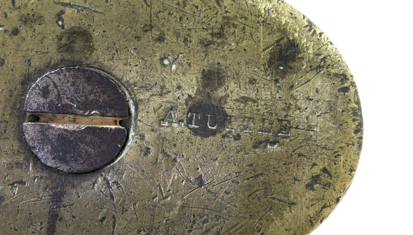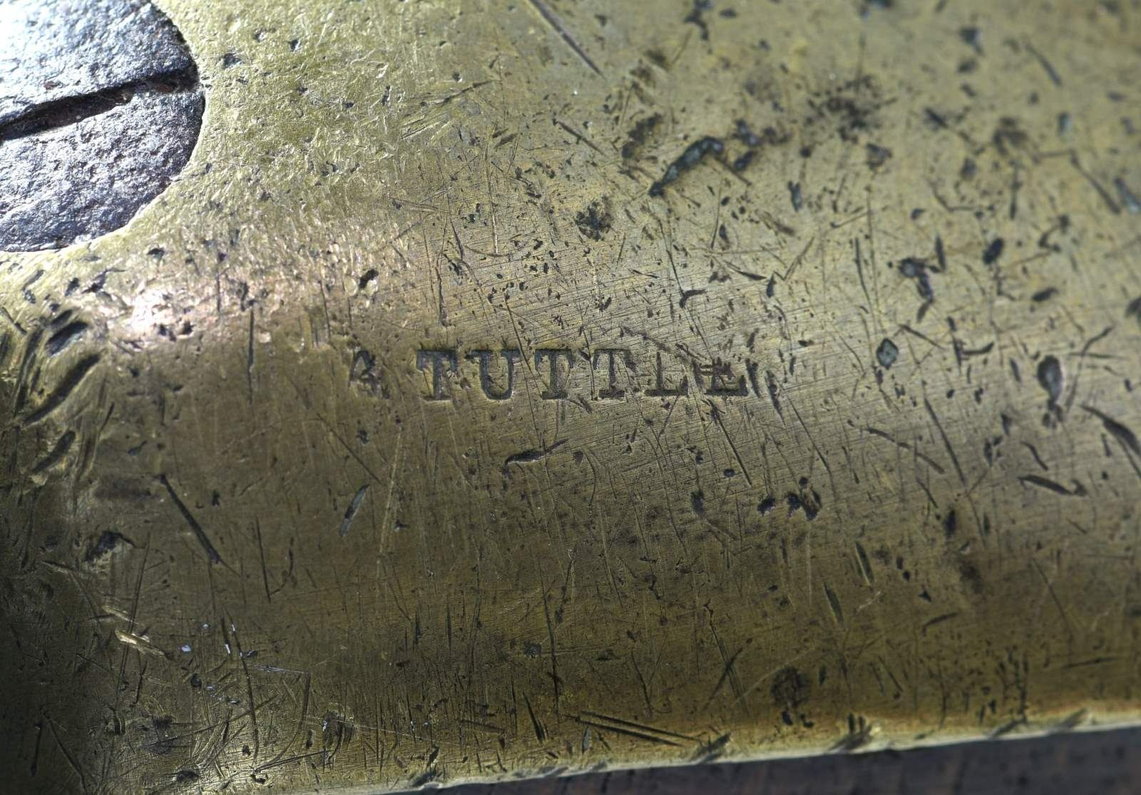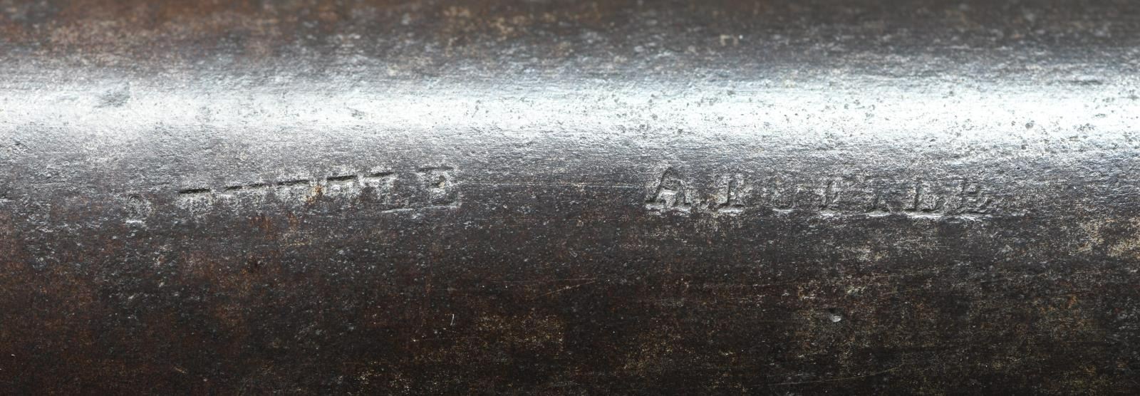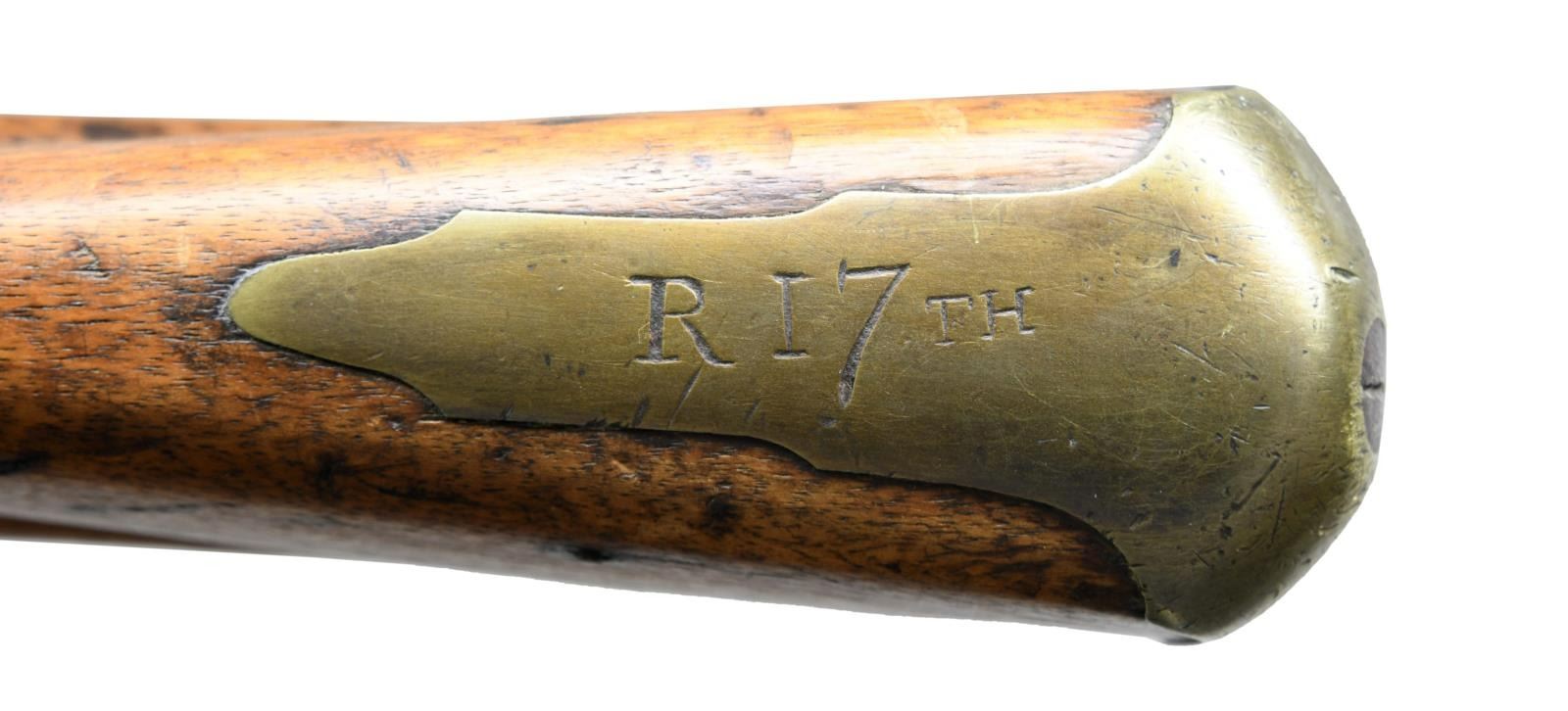 BRITISH 17th REGIMENT OF FOOT HEAVILY ENGAGED THROUGHOUT THE AMERICAN REVOLUTION. Cal. 76. NSN. Bbl. 38". This 2nd model Brown Bess was carried by a member of the 17th Regiment of Foot during the American Revolution. It is clearly marked on the top of the butt plate in period engraving, "R 17 TH". The mark features the "long tailed" 7, often seen in 18th century engraving. The 17th Regiment of Foot began arriving in America on November 8, 1775. The regiment was inspected at Boston by Major General Clinton on December 11th. The 17th remained in Boston until American forces moved into Dorchester Heights and the 17th evacuated to Halifax, Nova Scotia. In early July of 1776, the 17th landed on Staten Island, New York and prepared for the invasion of Long Island. The 17th fought in all battles for New York City and the Battle of Long Island. Subsequent to these battles, the 17th fought in the Battle of Harlem Heights in September and the Battle of White Plains in October of 1776, which caused the Americans to evacuate New York. In early 1777, the 17th joined General Cornwallis at Trenton and fought bravely at the Battle of Princeton, suffering numerous casualties including the popular young Captain William Leslie at Clarks Orchard. Numerous British periodicals of the time referred to the 17th as "The Heroes of Princeton". The 17th went on to fight in the Philadelphia Campaign and were actively engaged at the Battle of Brandywine. In 1778, the 17th defeated an American assault at Monmouth Courthouse, subsequently withdrawing with the army to New York. Elements of the 17th participated in the New Bedford Raid and raids on Martha's Vinyard. After spending the winter of 1778/79 around New York City, the 17th was heavily engaged at Stony Point where nearly the entire regiment was taken prisoner by American forces. Survivors of the 17th, bolstered by new recruits and transfers, were sent to Charleston, South Carolina in October of 1780. They were engaged in fighting partisans throughout South Carolina. The 17th eventually joined forces with General Cornwallis and were again taken prisoner at the fall of Yorktown. It is difficult to imagine the hard campaigning that this truly historic Brown Bess musket has seen. The musket itself has a 38" barrel that has obviously been shortened from the regulation length during its useful life. A crowned "GR" proof can be discerned on top of the barrel near the bolster. The lock is marked with a crowned "GR" under the pan and with a crowned broad arrow to the right. Behind the cock is the word "TOWER" in a vertical arc. The lock may have been replaced in the late 1770's, as there are 2 visible screws behind the cock. The brass trigger guard is most certainly of a 2nd model style, as is the brass butt plate, heavily engraved "R 17 TH". There is a brass escutcheon at the top of the wrist, and a flat brass side plate. The brass thimbles and entry thimbles are of 2nd model style, not showing Pratt's improvement. Both the top of the barrel and the butt plate bear stampings that read "A. TUTTLE", possibly a later owner of this weapon. Fine original stock. CONDITION: all iron parts have a dark oxidized patina. The lock holds both full & half cock. All brass parts have a wonderful, mellow mustard patina. The stock is quite strong with virtually no losses or notable damage. Front sling swivel appears replaced. Fair bore. PROVENANCE: From the Collection of James B. Taylor. (01-23862/BF). ANTIQUE. $5,000-7,000.