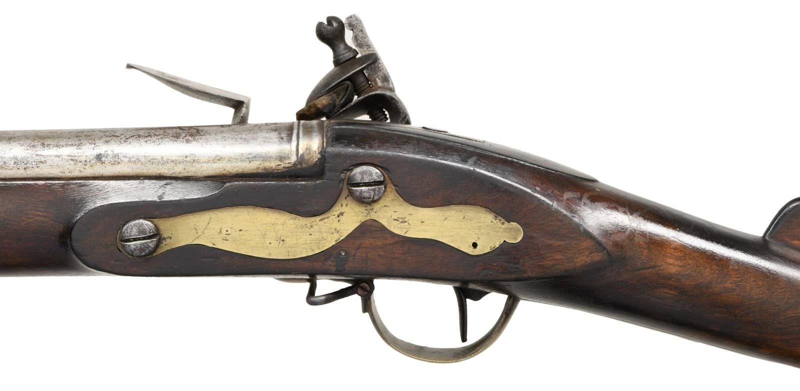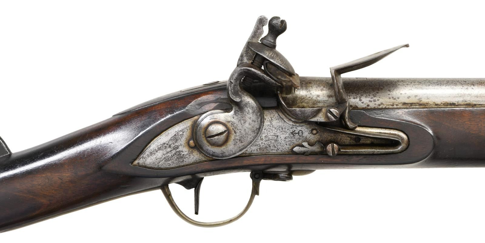 CENTURY. Cal. 76. NSN. Bbl. 42". A fine example of a British sea service musket that likely saw service during the French & Indian War and the American Revolution. The round barrel has a trapezoidal front sight and ring embellishments at the bolster. There are several proofs on the top of the barrel, including a crowned broad arrow. The number "15" is engraved on the top of the barrel and likely represents a rack number. The lock has a crowned "GR" below the cock and a crowned broad arrow below the pan. The back of the lock is marked "WOOD 1748". Brass trigger guard with ball front, typical of sea service muskets. Correct brass butt plate and long, flat side plate. Brass entry thimble & ramrod thimbles, not showing Pratt's improvement. Iron ramrod appears original. CONDITION: barrel & lock have a medium gray, mottled patina. Barrel markings are worn but remain legible. Lock markings are quite light but can still be discerned. Lock holds both full & half cock. Brass has a mellow mustard patina. Stock has been refinished but shows no notable damage. Fair bore. (01-24061/BF). ANTIQUE. $6,000-8,000.