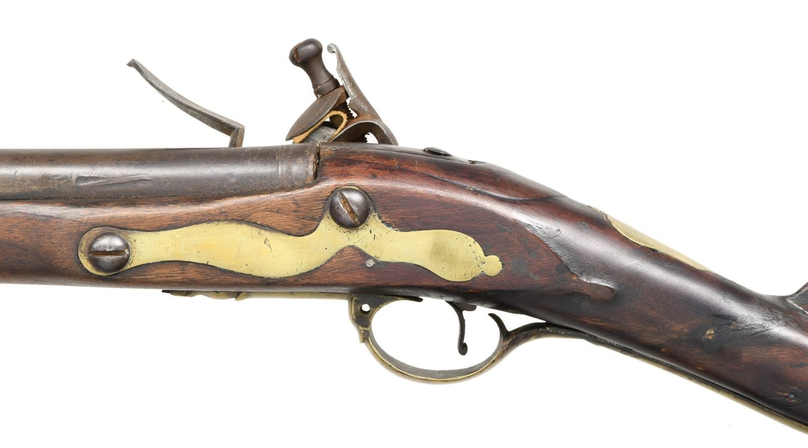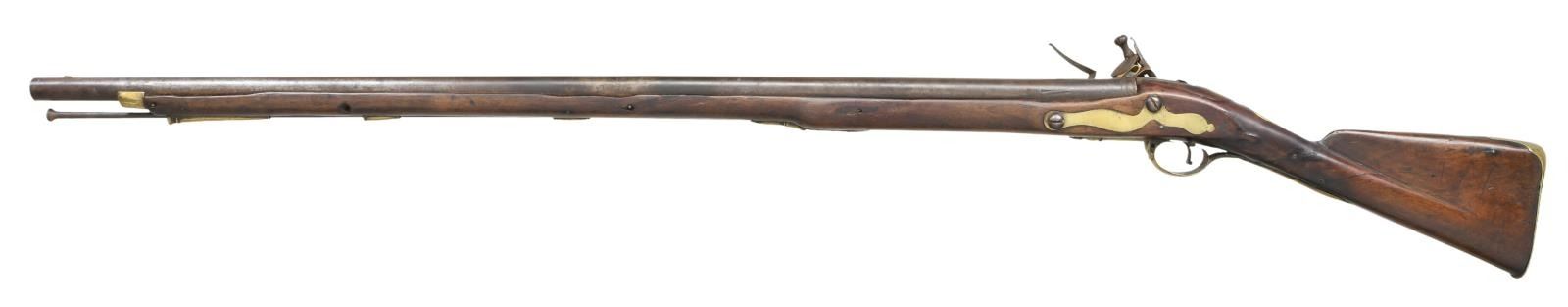 Cal. 76. NSN. Bbl. 41 1/4". Round barrel with rectangular iron front sight and rings at the bolster. There are no proofs visible on the barrel, likely due to pitting from pan flashes. The lock has a crowned "GR" under the cock and a "TOWER" mark with a single screw in back of the cock. The crowned broad arrow under the pan appears to be there but is difficult to discern because of the abundance of light pitting. Brass trigger guard with classic finial end. Brass butt plate, wrist escutcheon, flat side plate, nose cap, entry thimble, and ramrod thimbles without Pratt's improvement. Ramrod appears original. CONDITION: barrel has a dark overall patina. The lock has a similar dark patina and holds both full & half cock. Brass has a mellow mustard patina. Wood shows no notable damage. Fair bore. (01-24066/BF). ANTIQUE. $3,500-5,000.
