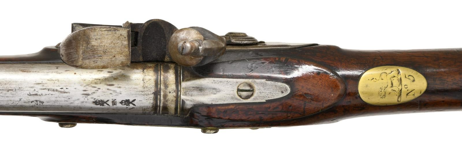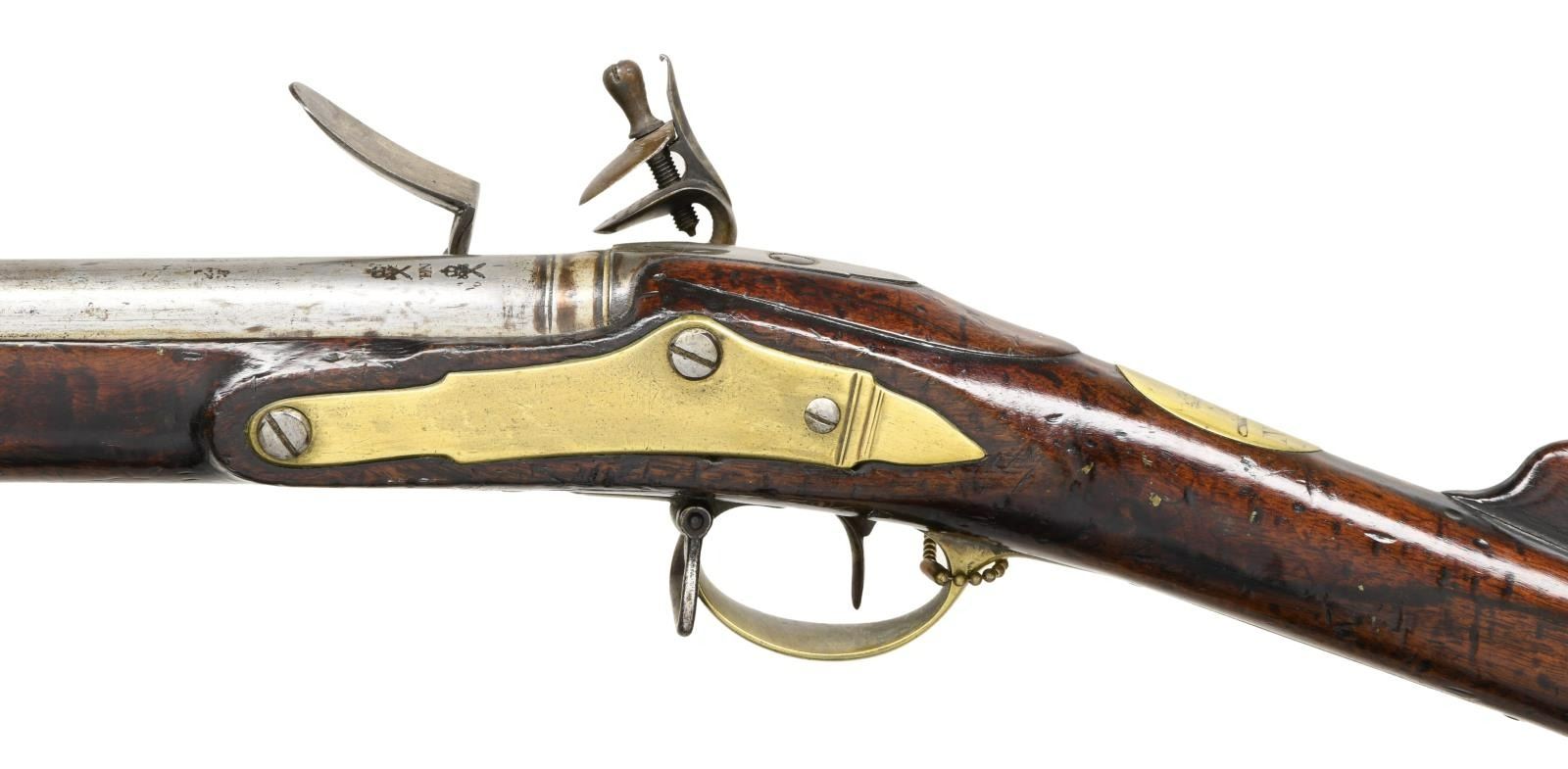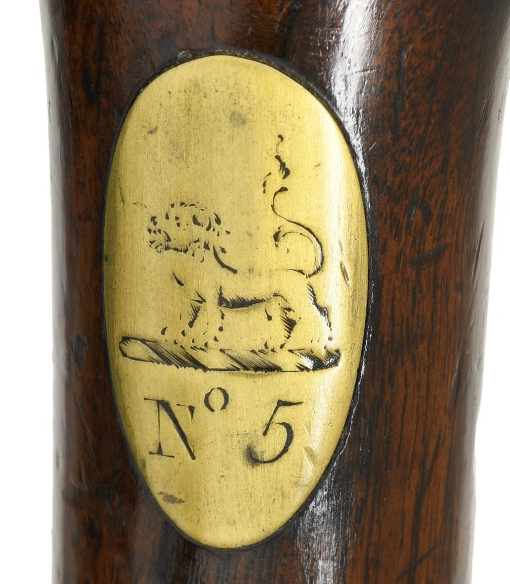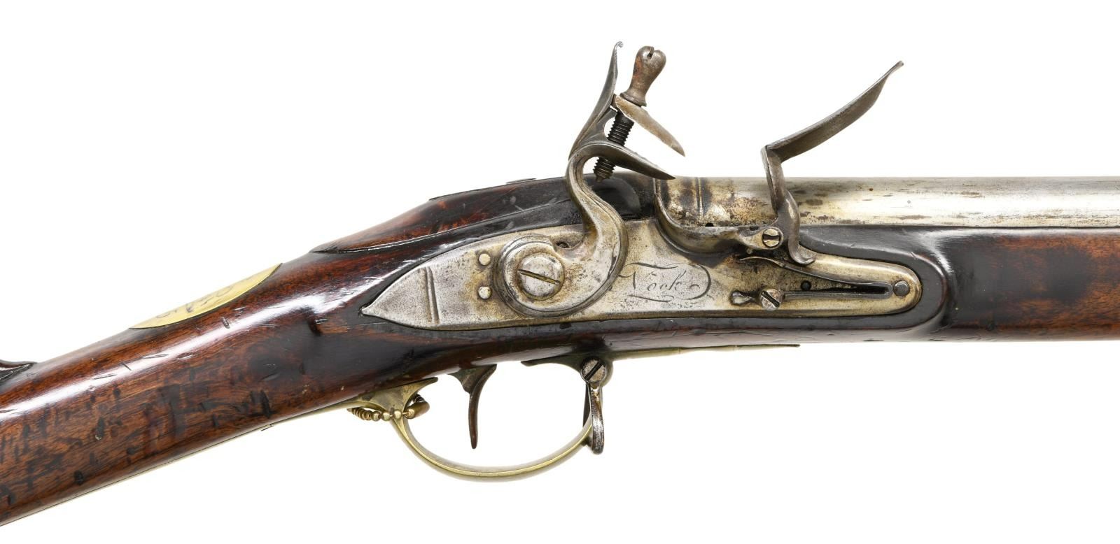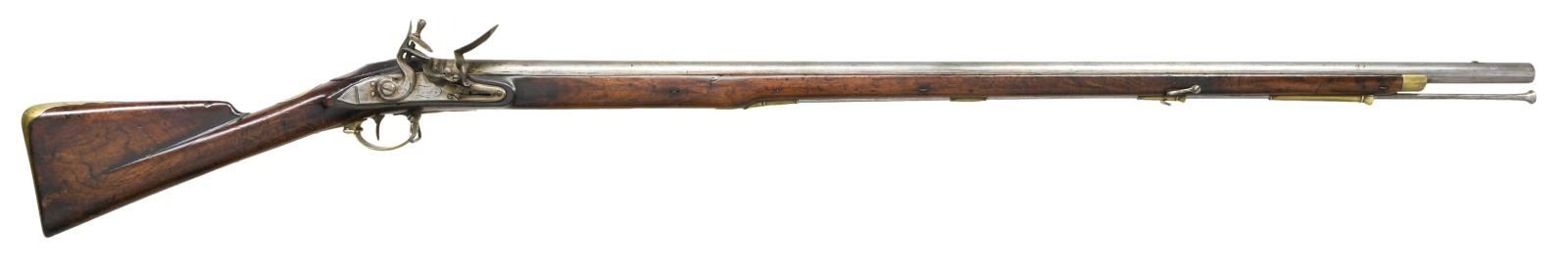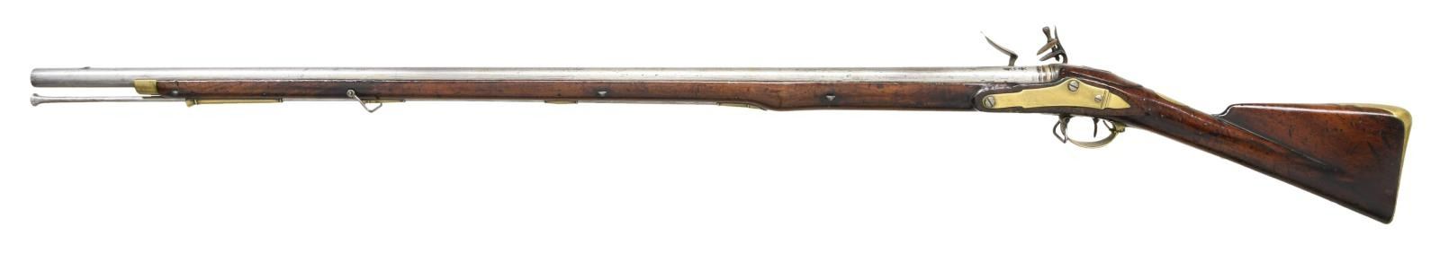 Cal. 77. S# NSN. The famed Henry Nock made sporting guns but also had many military contracts for various arms including muskets and volley guns. It appears that this late 18th century musket was made for some private lord's militia with large oval at top of grip engraved with the family crest of a dog that looks like a poodle over "No 5". The 42 5/8" tapered round barrel has bayonet lug as front sight and military turnings at rear. Top left is stamped with 2 crowned crossed scepter proofs above and below "HN" (Henry Nock). Lock with chamfered slightly arched plate having rebated tail is fitted with serpentine cock, integral rounded pan, bridled friction frizzen and feather spring with bulbous finial. Lock is engraved "Nock" in script under pan. Walnut stock extends to within 4 1/2" of the muzzle with brass cap and is of early styling with handrail comb, beavertail around top tang and palm swell at thimble. Brass mounts are also military style but not as heavy as standard. Buttplate has steeple finial. Trigger guard has simple stylized acorn finial and sideplate is broad and of one piece with screw attachment at rear. Stock attaches to barrel with three captive sidebolts without escutcheons. Sling loops are fitted. Trumpet shaped steel ramrod mounts through military style beaded and flared pipes. CONDITION: good. Barrel and lock cleaned to silver gray. Marks are clear on barrel, a bit difficult to read on lock. Stock with added finish has many large marks and dings but is basically sound without any noted cracks or missing wood except for a 3" stress crack on left side of barrel channel between the top two pipes. Bore is lightly pitted. Lock is good. PROVENANCE: From the Collection of James B. Taylor. (01-23864/MGM). ANTIQUE. $3,000-5,000.