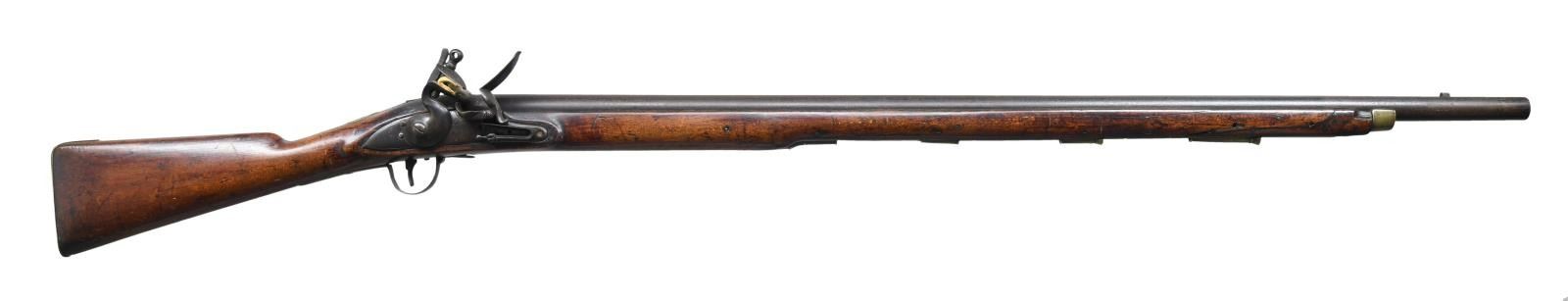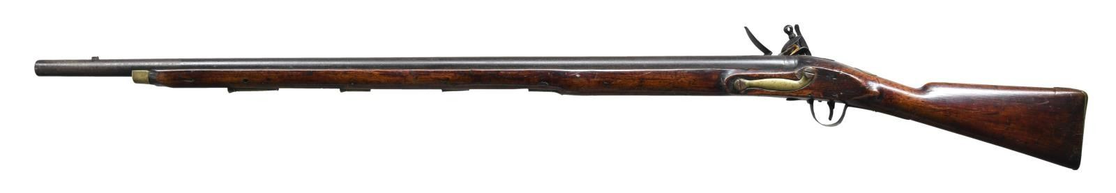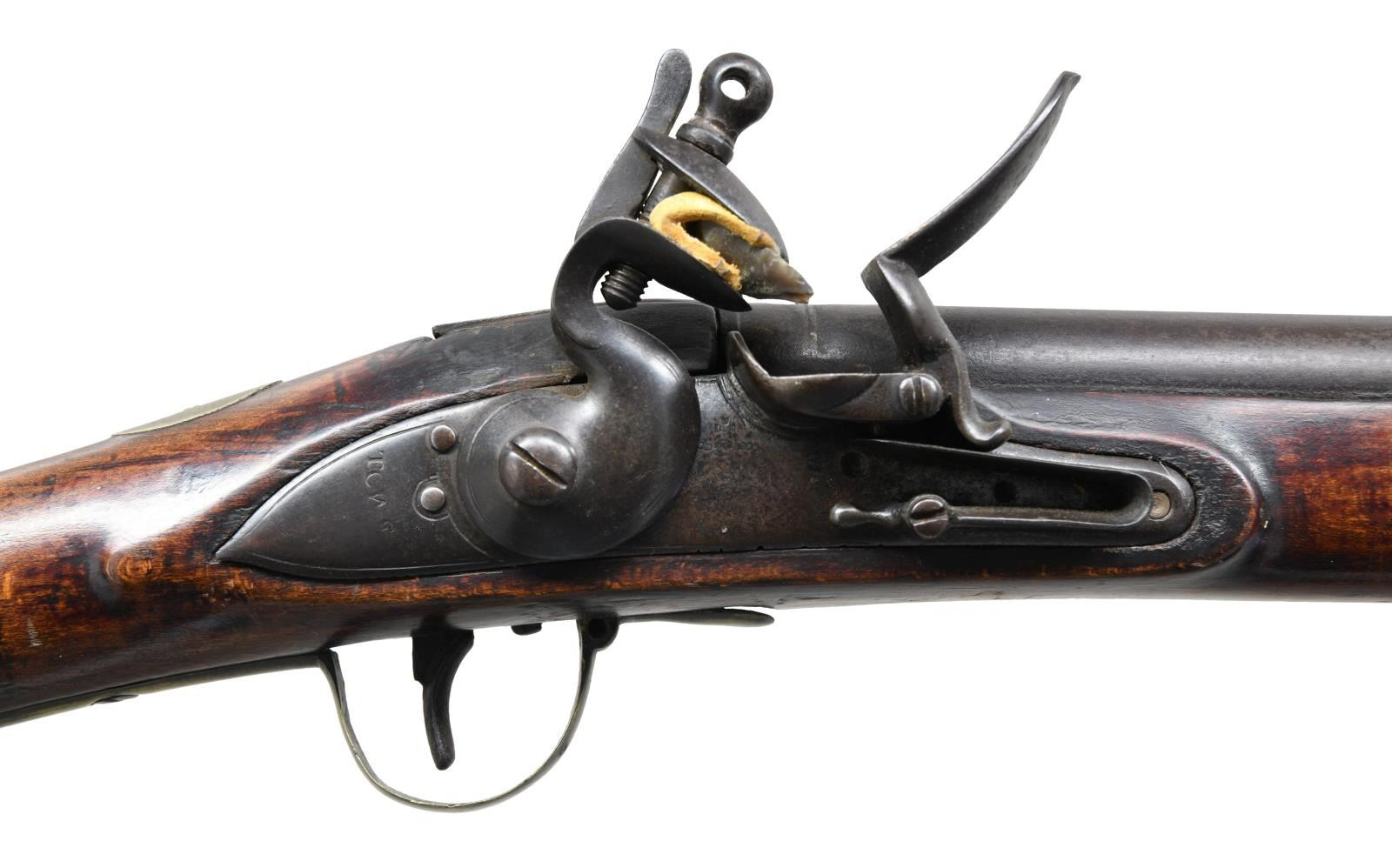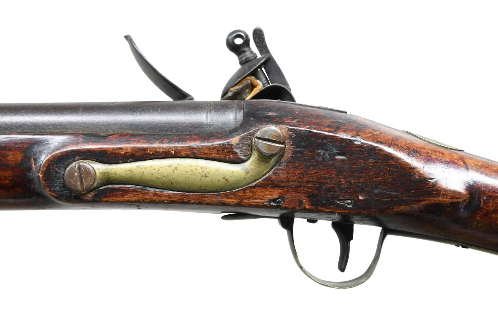 Cal. 70. NSN. Bbl. 40". Center of lock has faint crown marking. Rear of lock marked "TOWER". Rear of bbl. marked w/ a crown "V" & two other faint British proofs. Brass replacement trigger guard, buttplate, thimbles, nosecap, circular disc on wrist & sideplate. Beech replacement stock. No sling swivels or ramrod present. CONDITION: stock has older added finish w/ notable 9" crack on right side of forend, a 3" crack on right side of butt, a few smaller cracks, scattered chips, flaking, dings & handling wear. Brass parts are a dull yellow patina w/ scattered oxidation & dings. Balance of metal is a dull gray patina w/ a few areas of pitting & overall old oxidation. Oxidized bore. (01-23692/MJC). ANTIQUE. $800-1200.